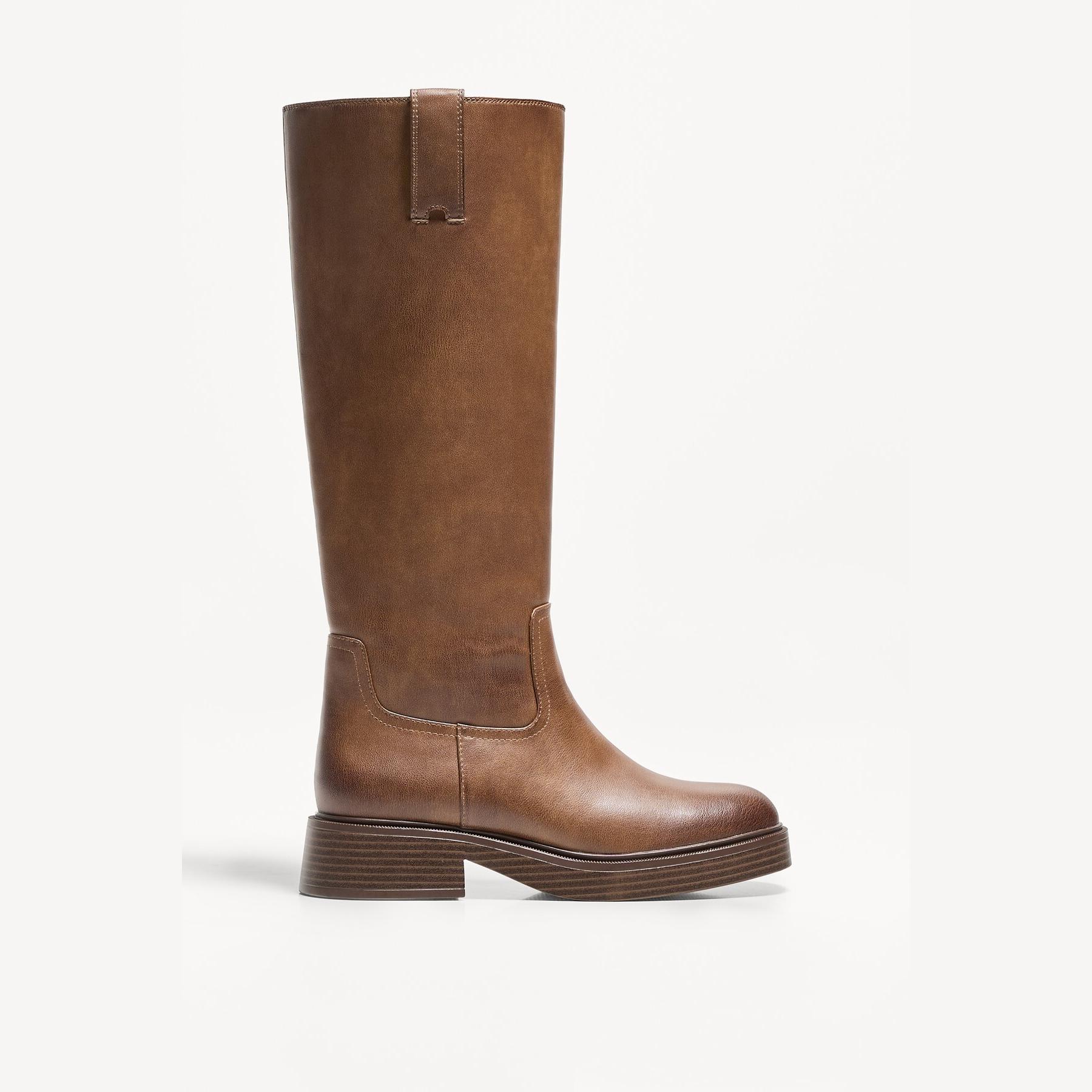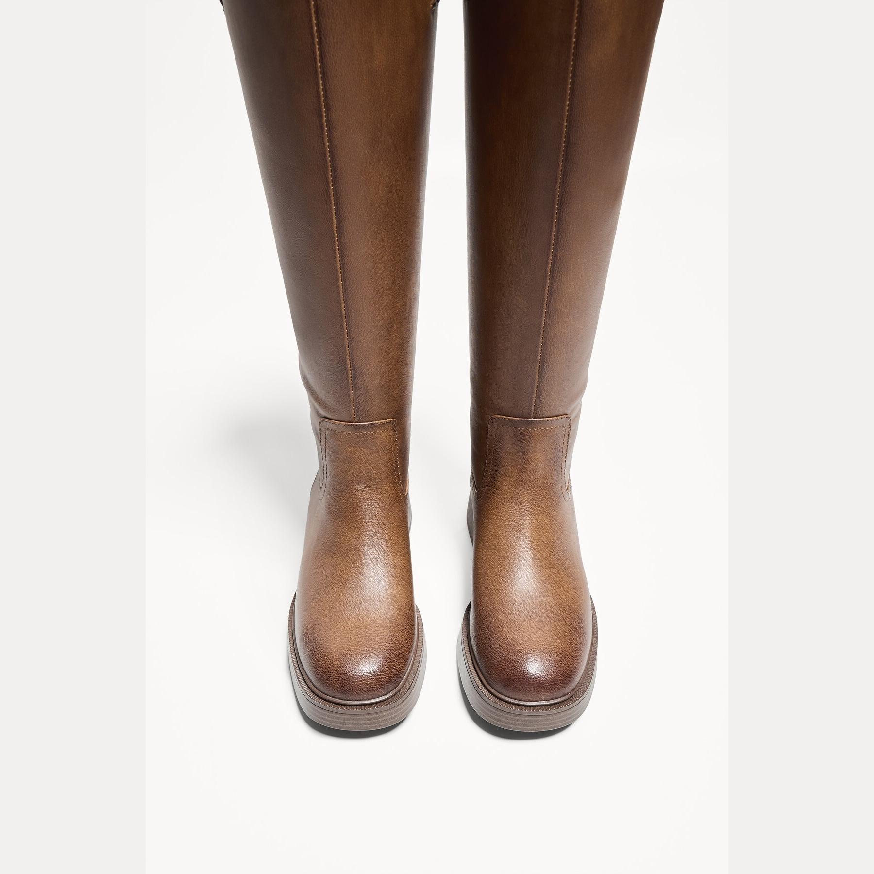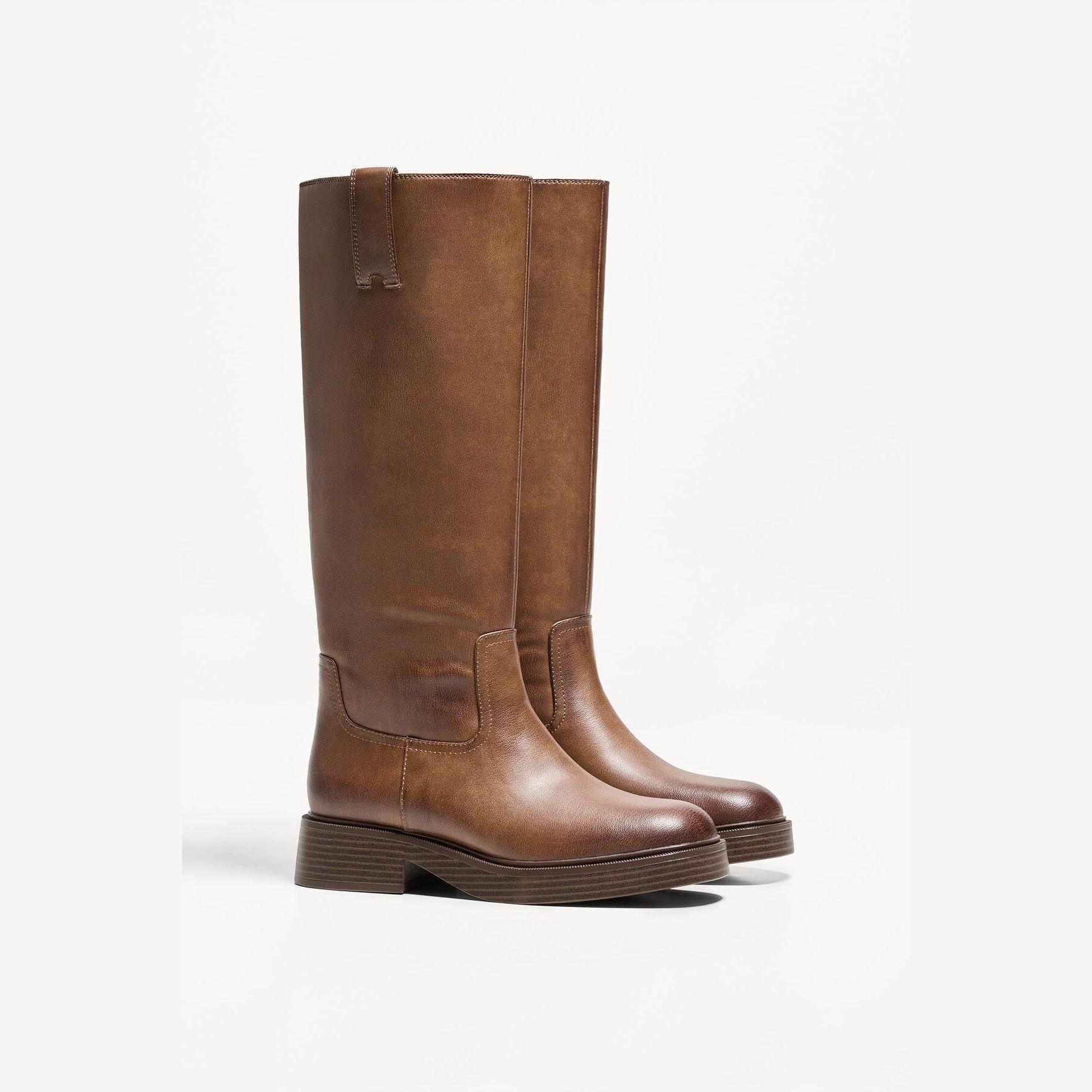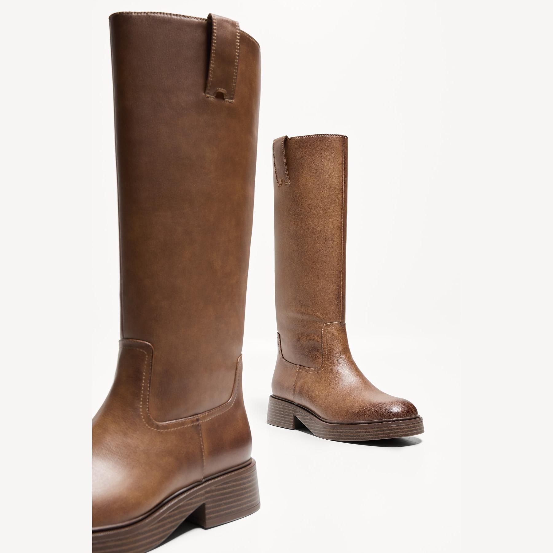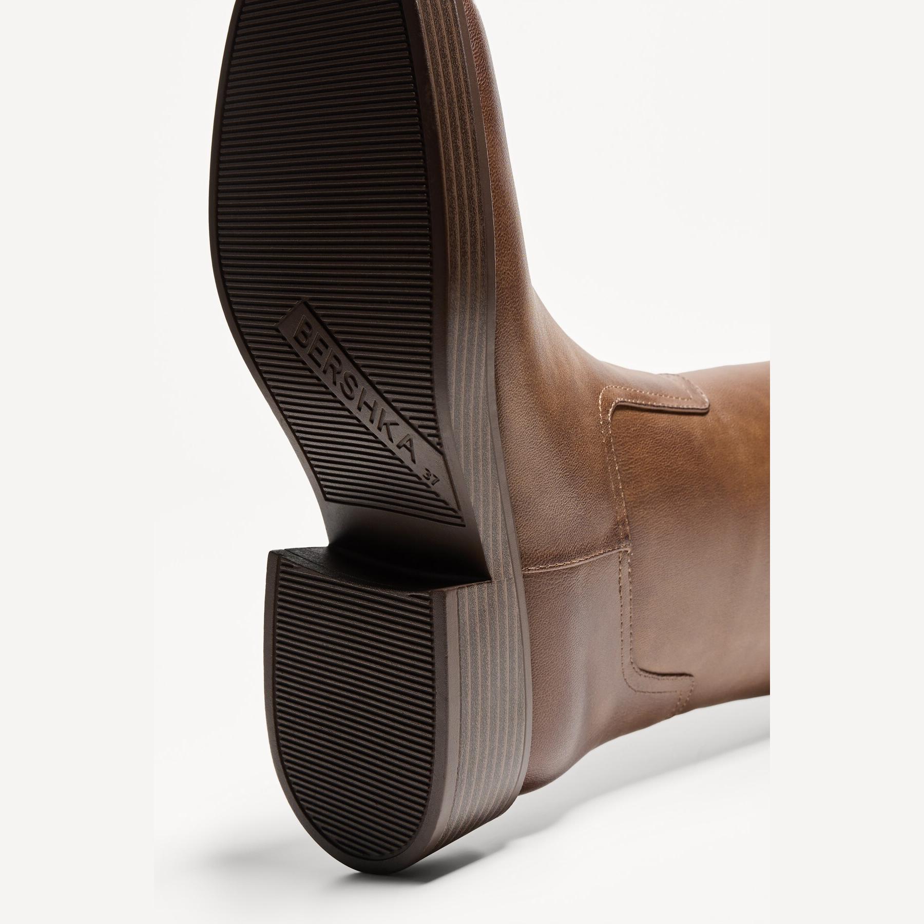 Bershka – جزمة نسائية بدون أربطة من الجلد الصناعي بلون بني بتصميم كلاسيكي طويل بنعل مسطح AIRFIT®