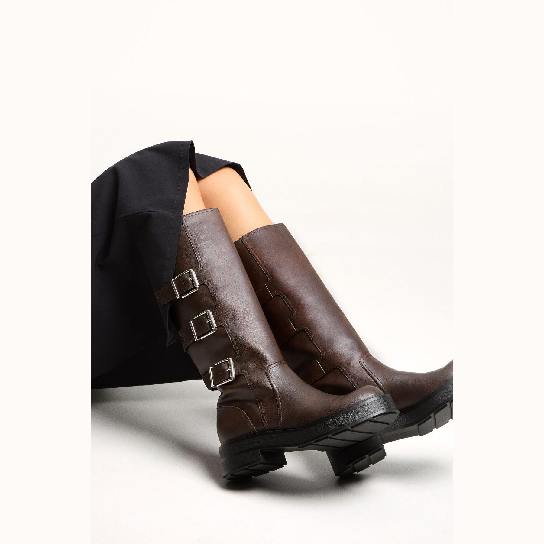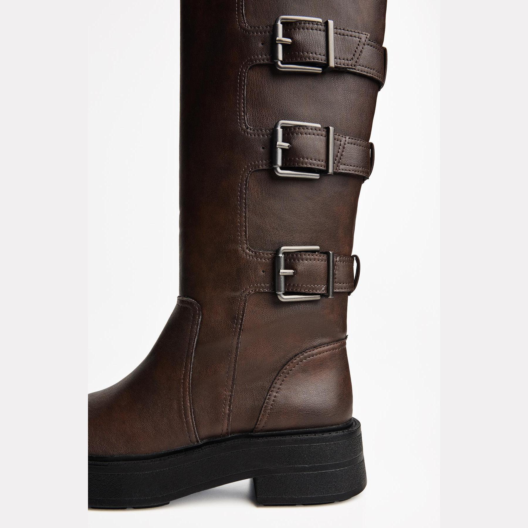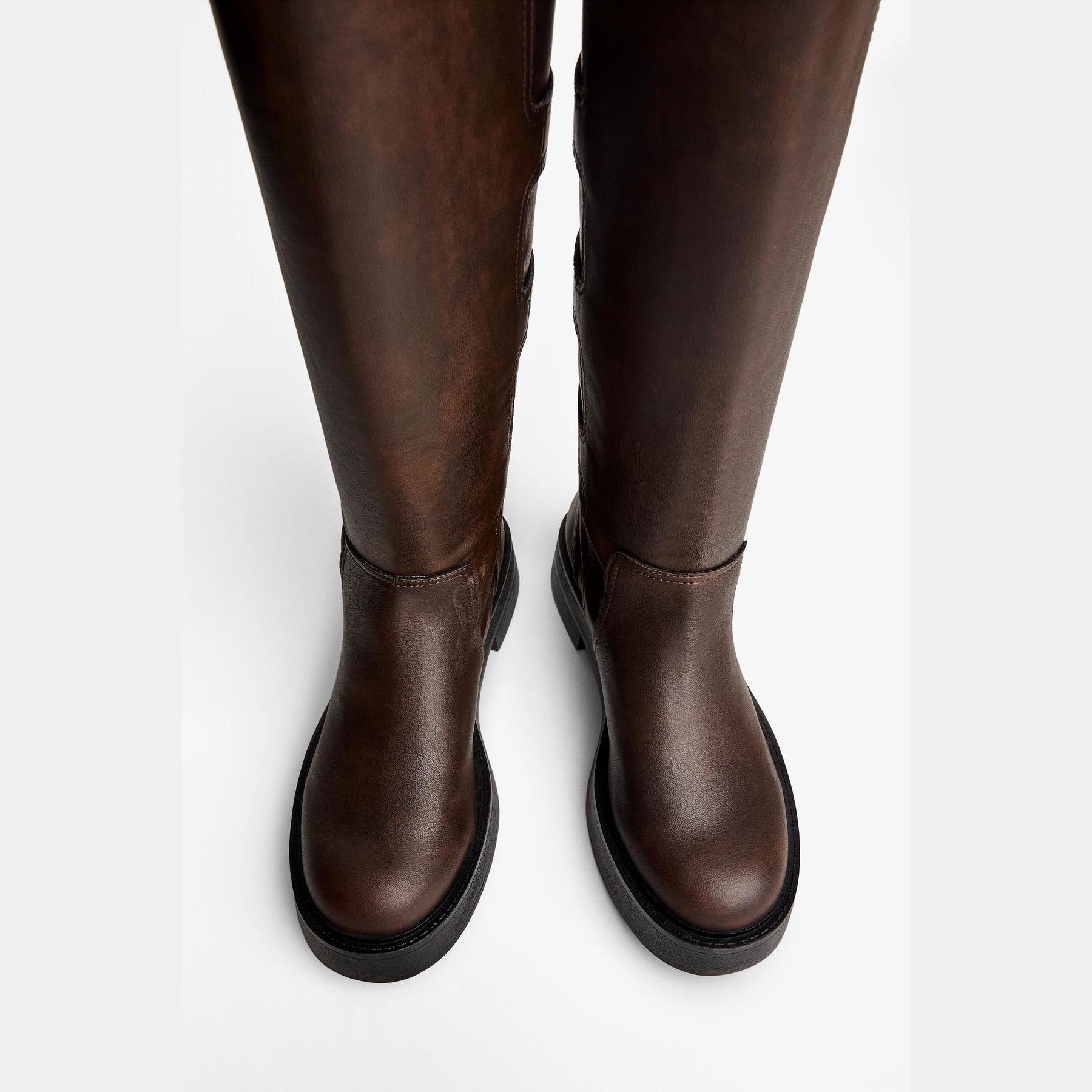 Bershka – بوت نسائي بدون أربطة من الجلد الصناعي بلون بني بتصميم كلاسيكي مزين بتوكة وكعب منخفض ونعل مريح AIRFIT®