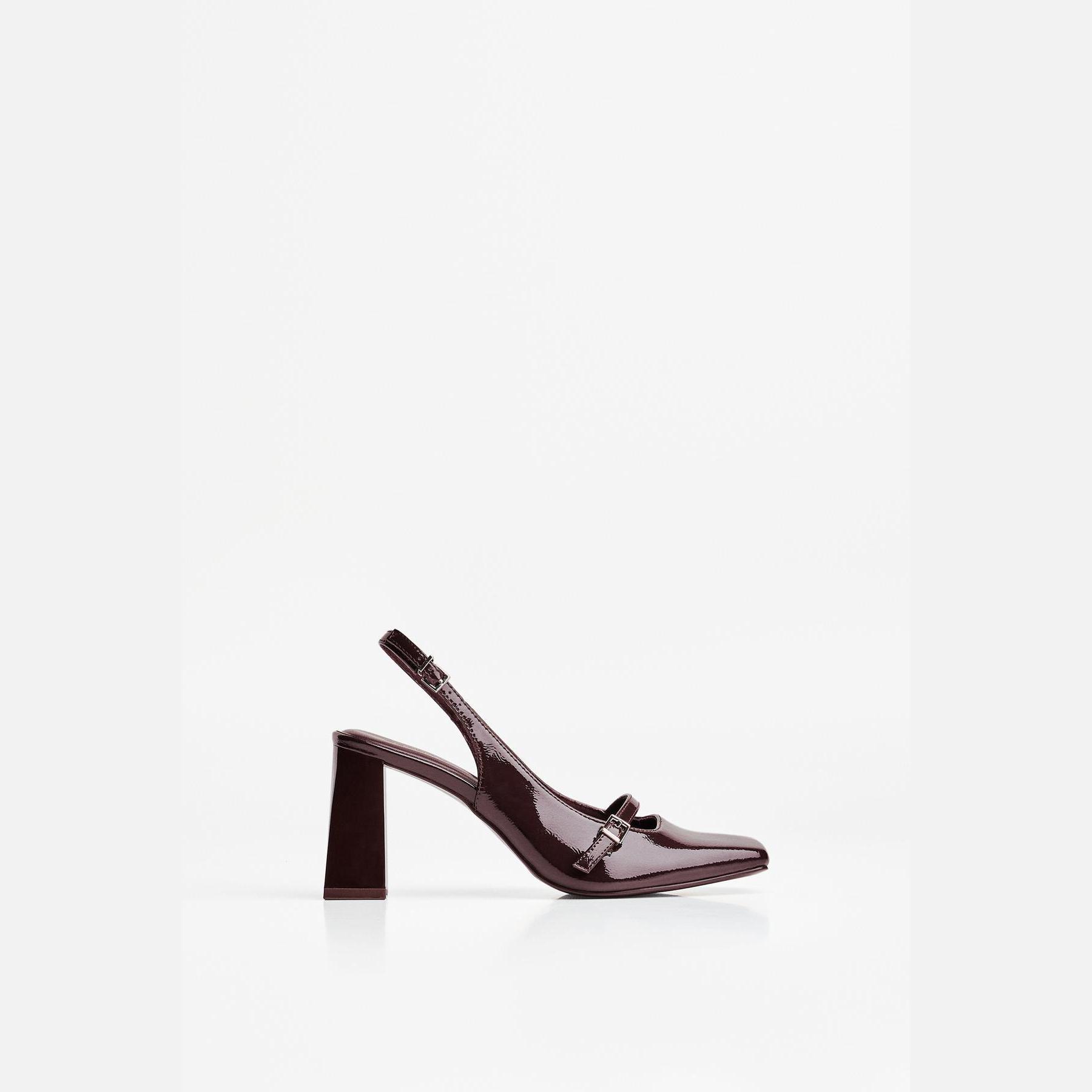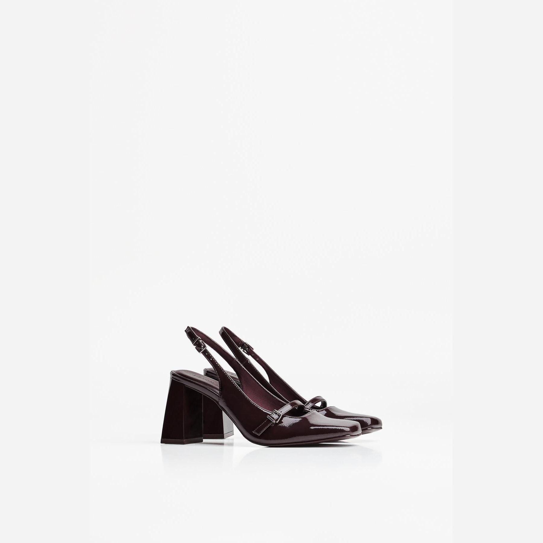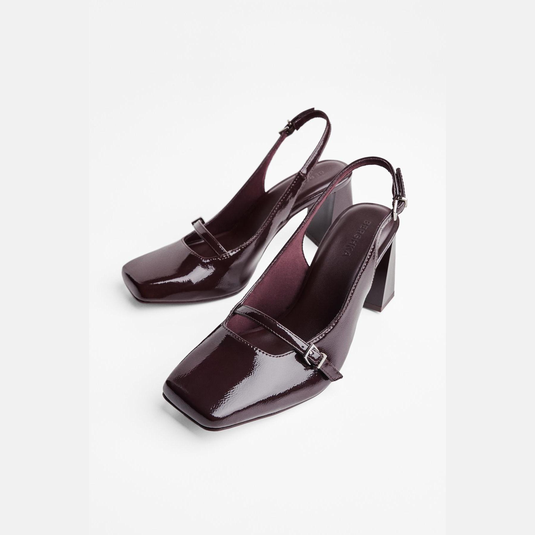 Bershka – حذاء نسائي مفتوح من الخلف من الجلد الصناعي بلون بوردو بتصميم Mary Jane بكعب عريض متوسط الارتفاع ونعل مريح AIRFIT®