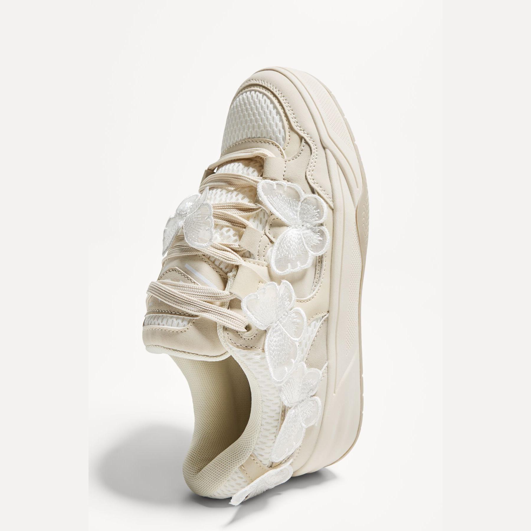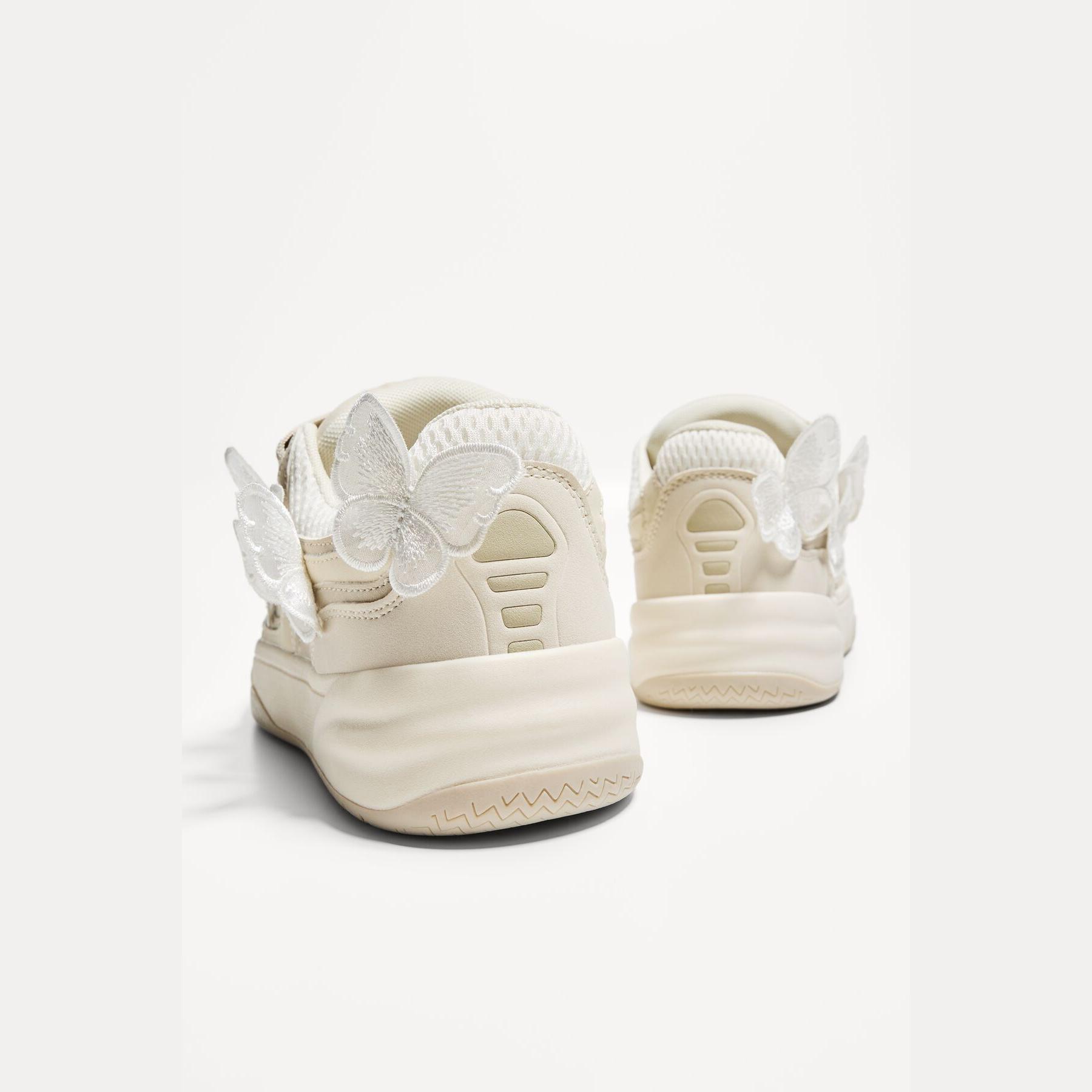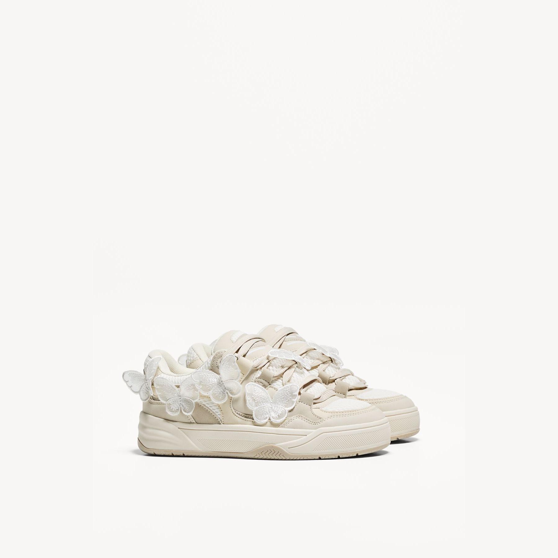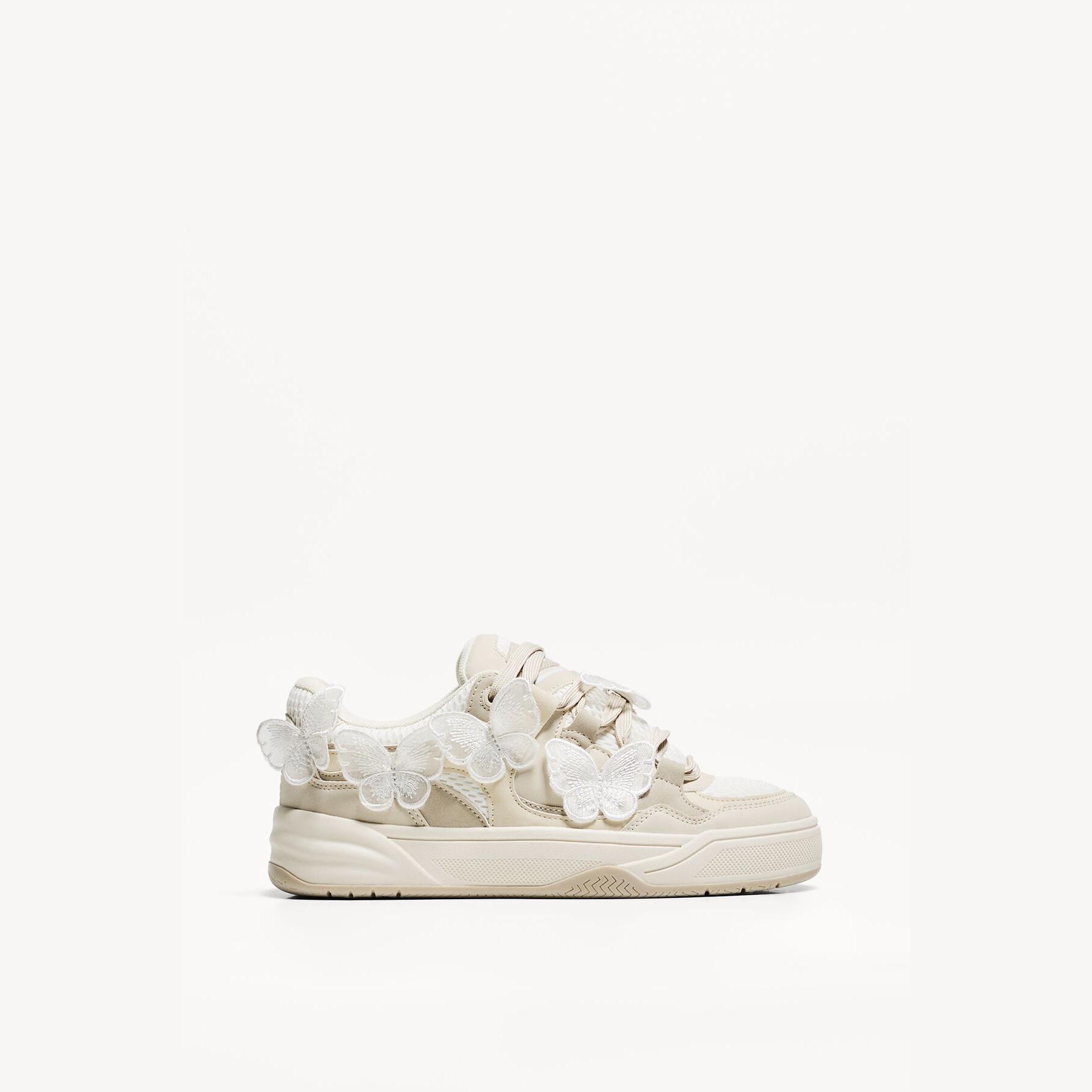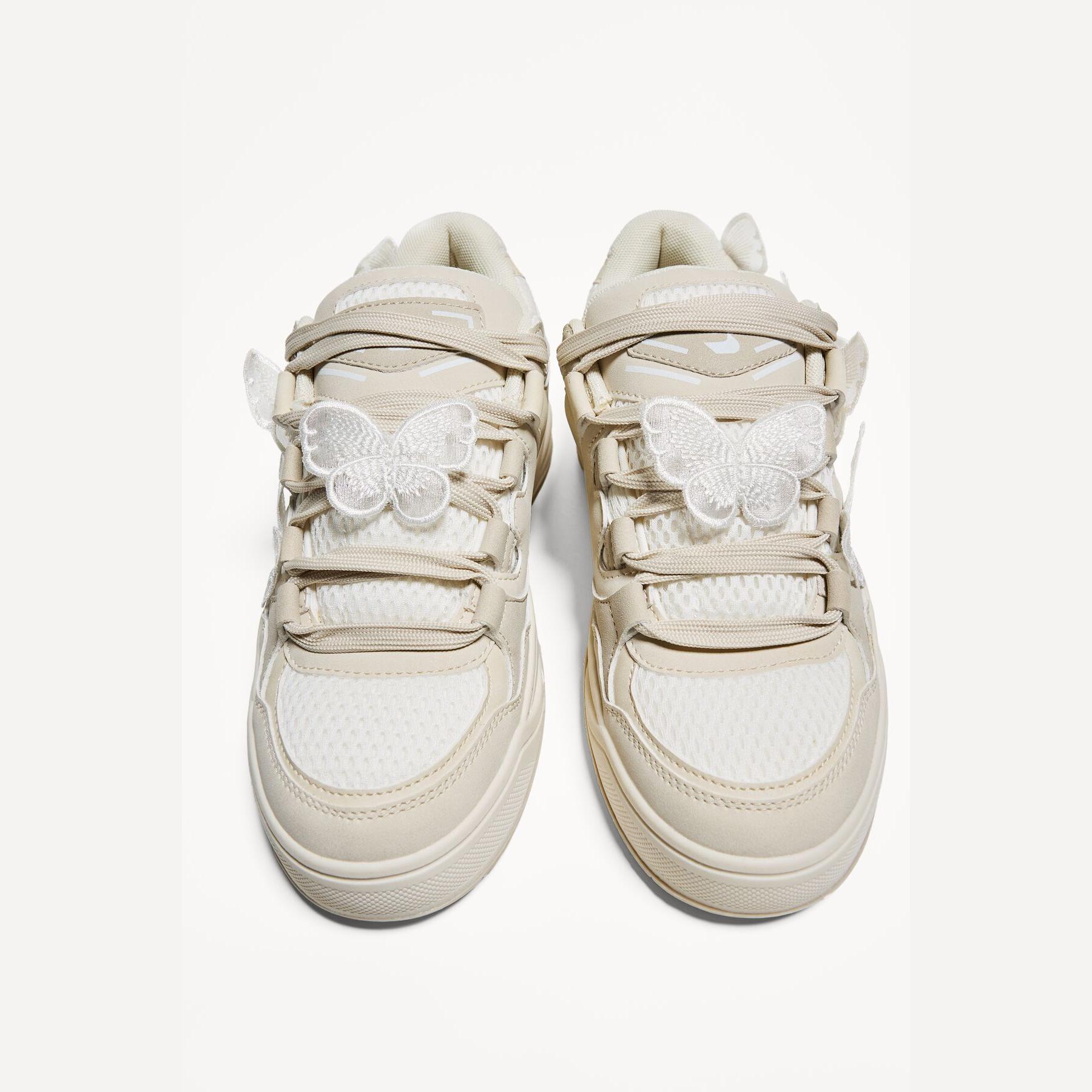Bershka – حذاء رياضي نسائي بتصميم سكاتر عصري بلون أبيض مع تفاصيل فراشة، بكعب مسطح ونعل مريح STARFIT®
