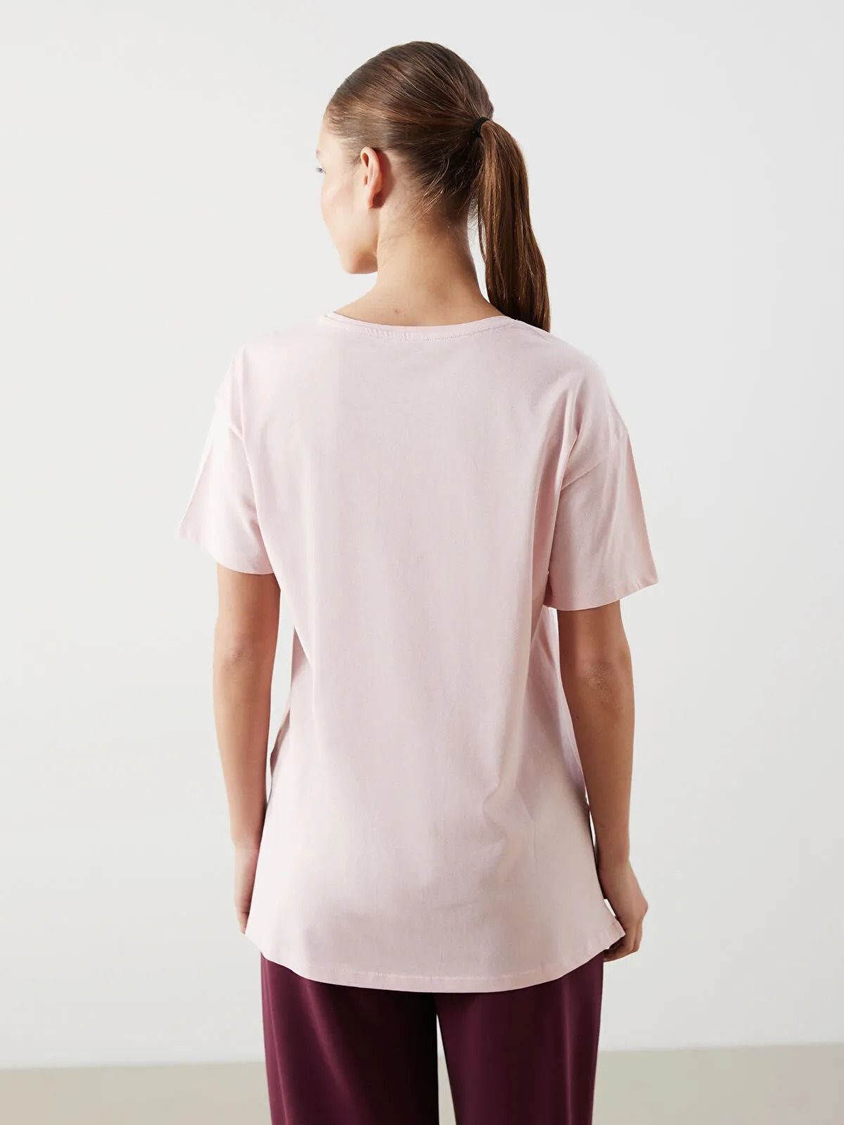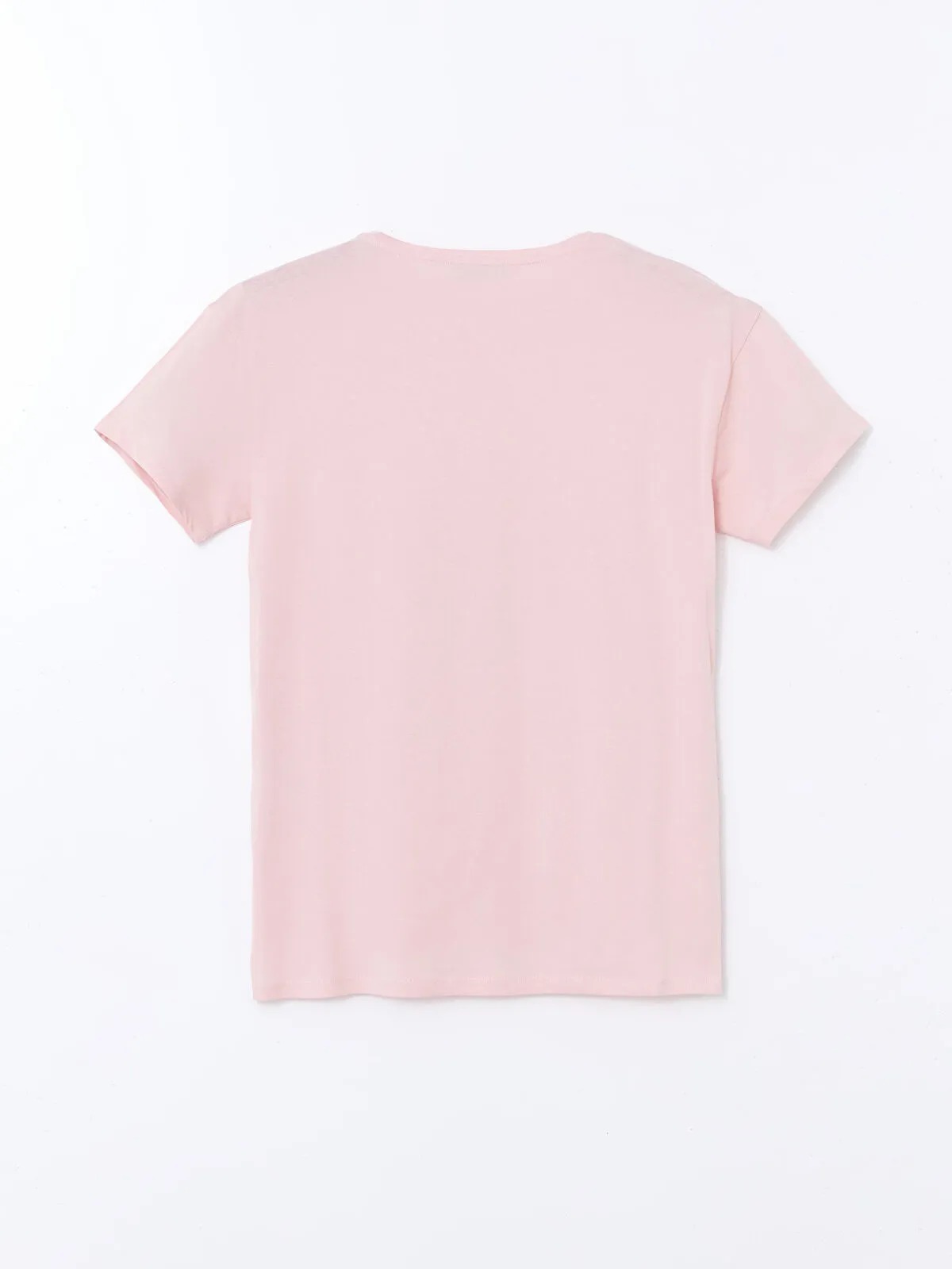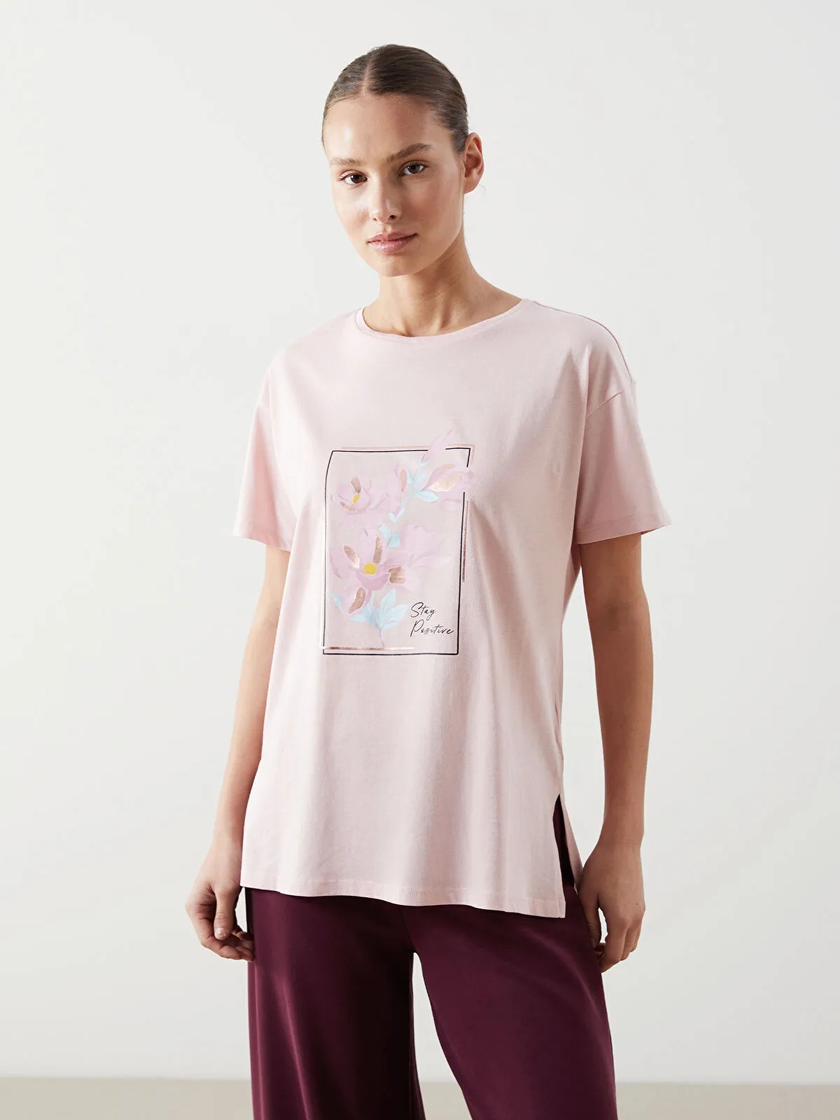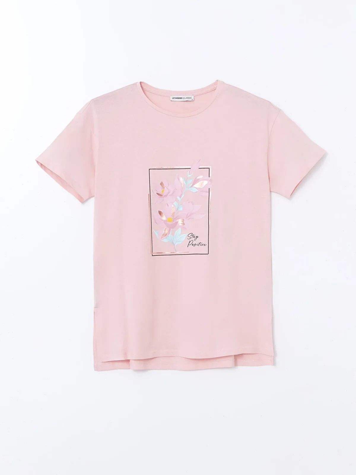 تيشيرت وردي أنيق مصنوع من قطن 100%، بياقة دائرية قصيرة وأكمام قصيرة، مزين بنقوش زهرية أمامية أنيقة. تصميم Regular Fit يضفي إحساسًا بالراحة والعصرية مع لمسة أنثوية ناعمة مثالي للإطلالات الصيفية الكاجوال.