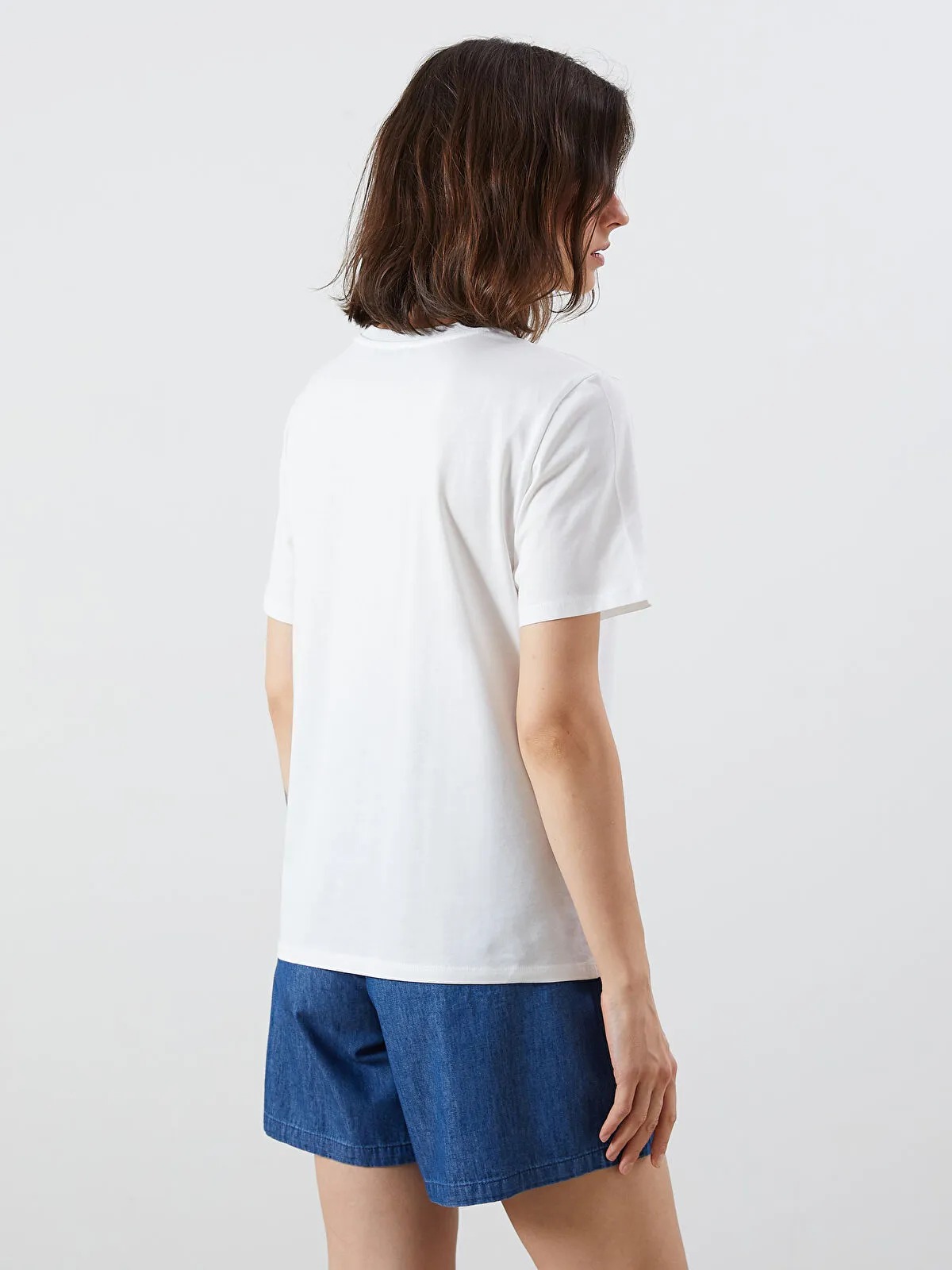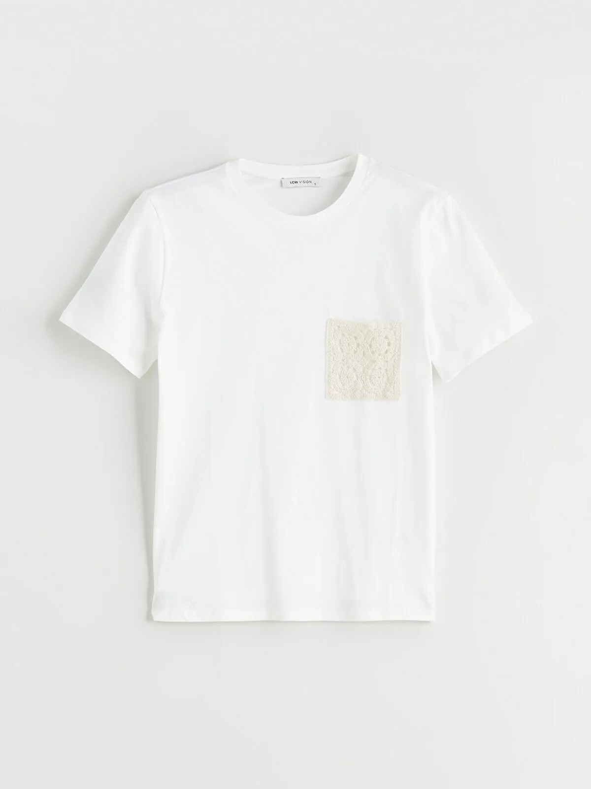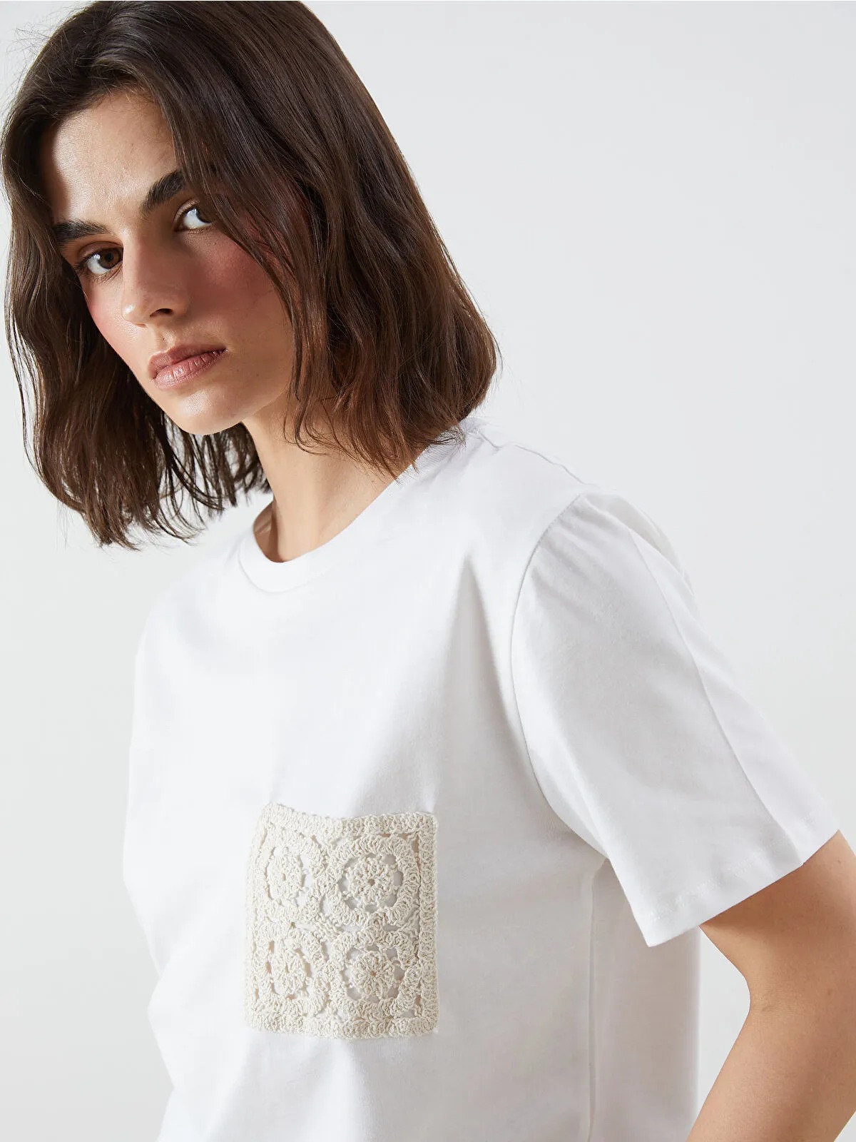 تيشيرت نسائي بياقة دائرية قصيرة وأكمام قصيرة، مزين بتفاصيل من الدانتيل على الجيب الأمامي تضفي لمسة أنثوية راقية وأنيقة. تصميم Regular Fit يوفر توازنًا مثاليًا بين الأناقة والراحة، مناسب للإطلالة الكاجوال اليومية بكل بساطة.