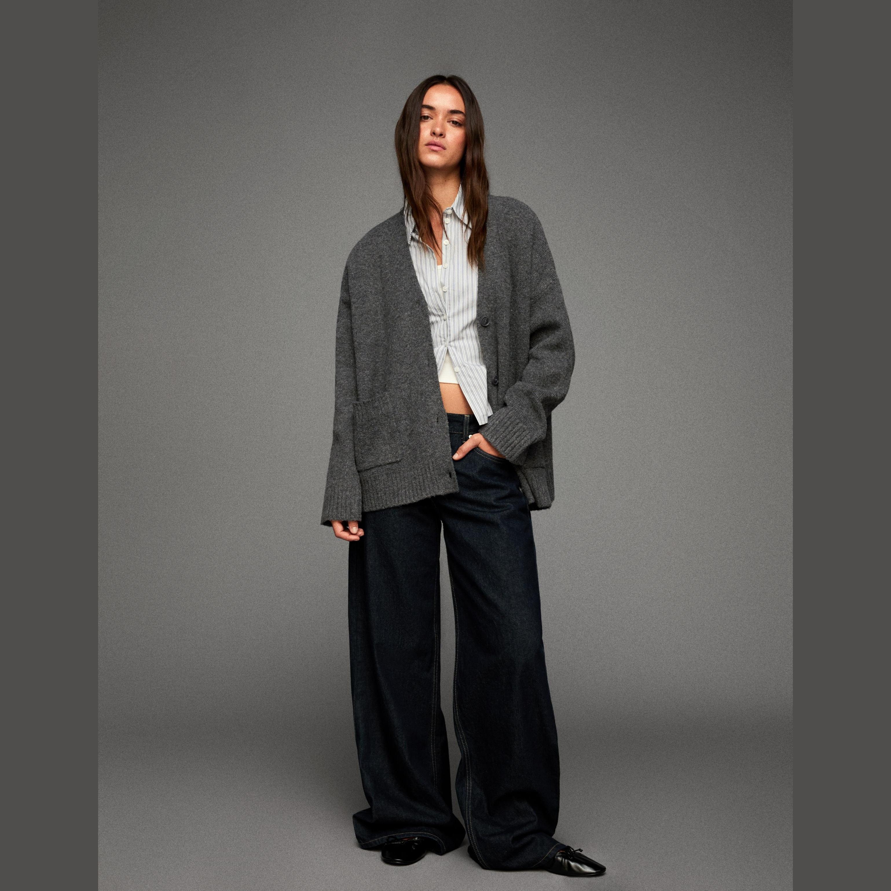تميّزي بإطلالة أنيقة وعصرية مع هذا الكارديغان الكلاسيكي من Bershka. تصميمه بياقة V وقصّته الضيقة يمنحانك مظهرًا أنثويًا ناعمًا، بينما خامته الخفيفة والمرنة توفر راحة مثالية طوال اليوم.