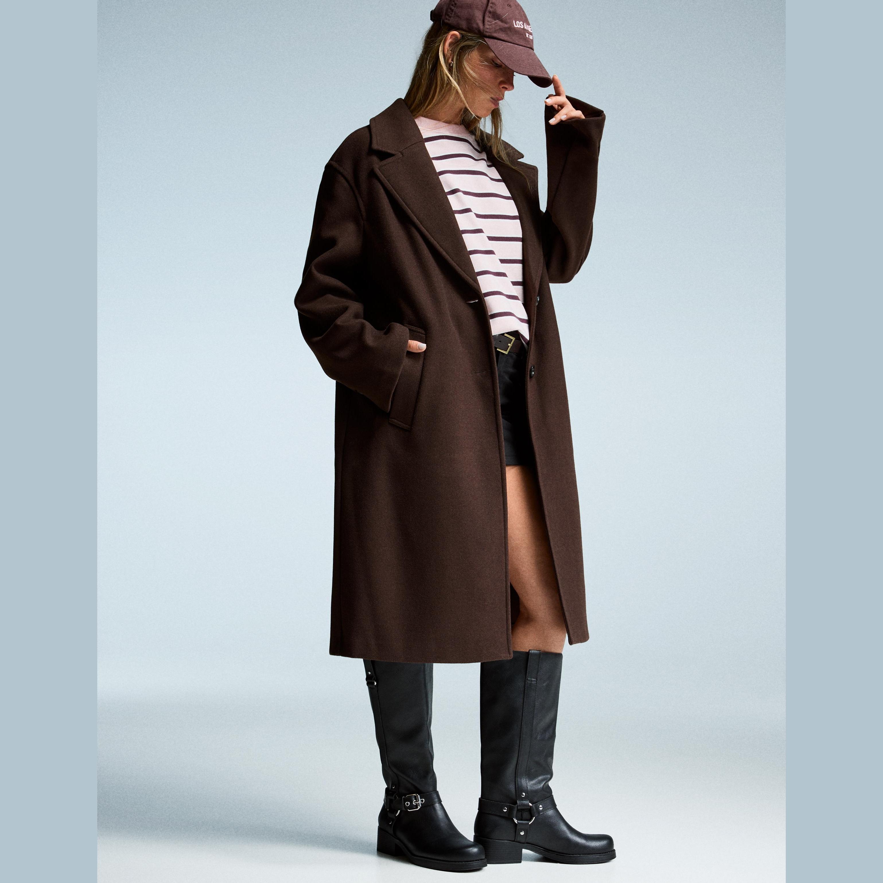 أضيفي لمسة دافئة وراقية إلى إطلالتك الشتوية مع هذا المعطف الطويل من Bershka. تصميمه الانسيابي بلونه البني يمنحك مظهرًا أنيقًا وسهل التنسيق، مثالي للأيام الباردة والمناسبات الكاجوال أو الرسمية.