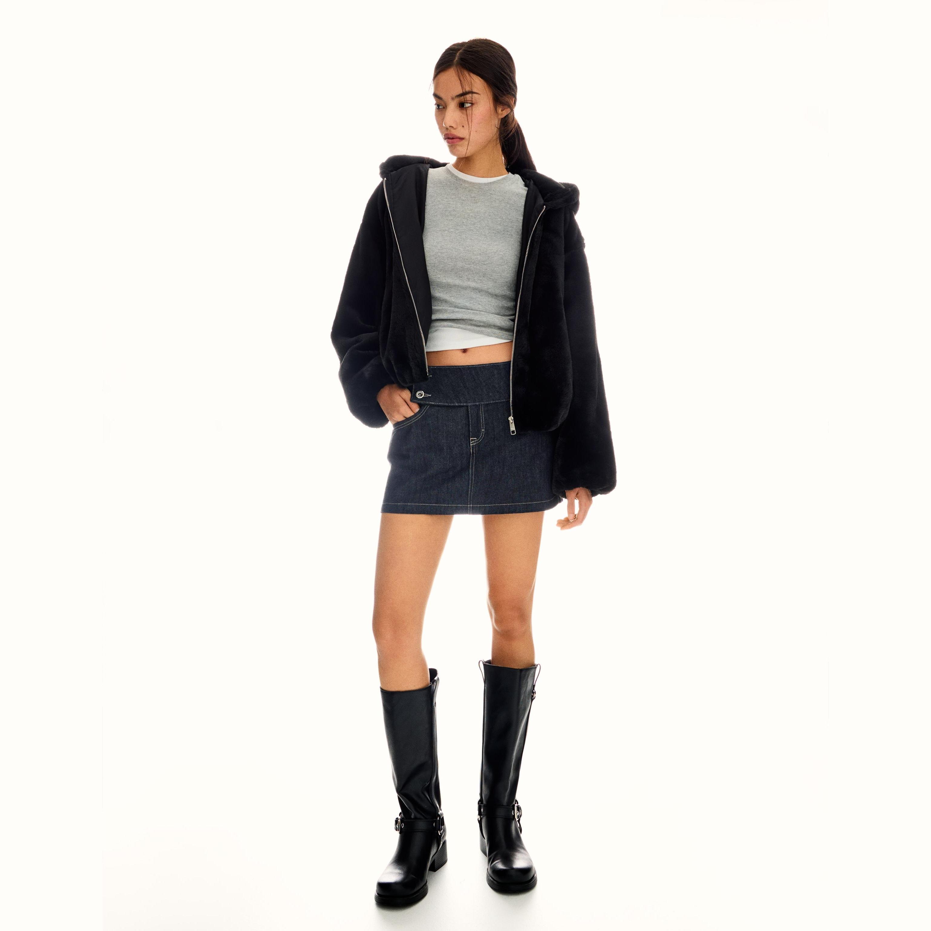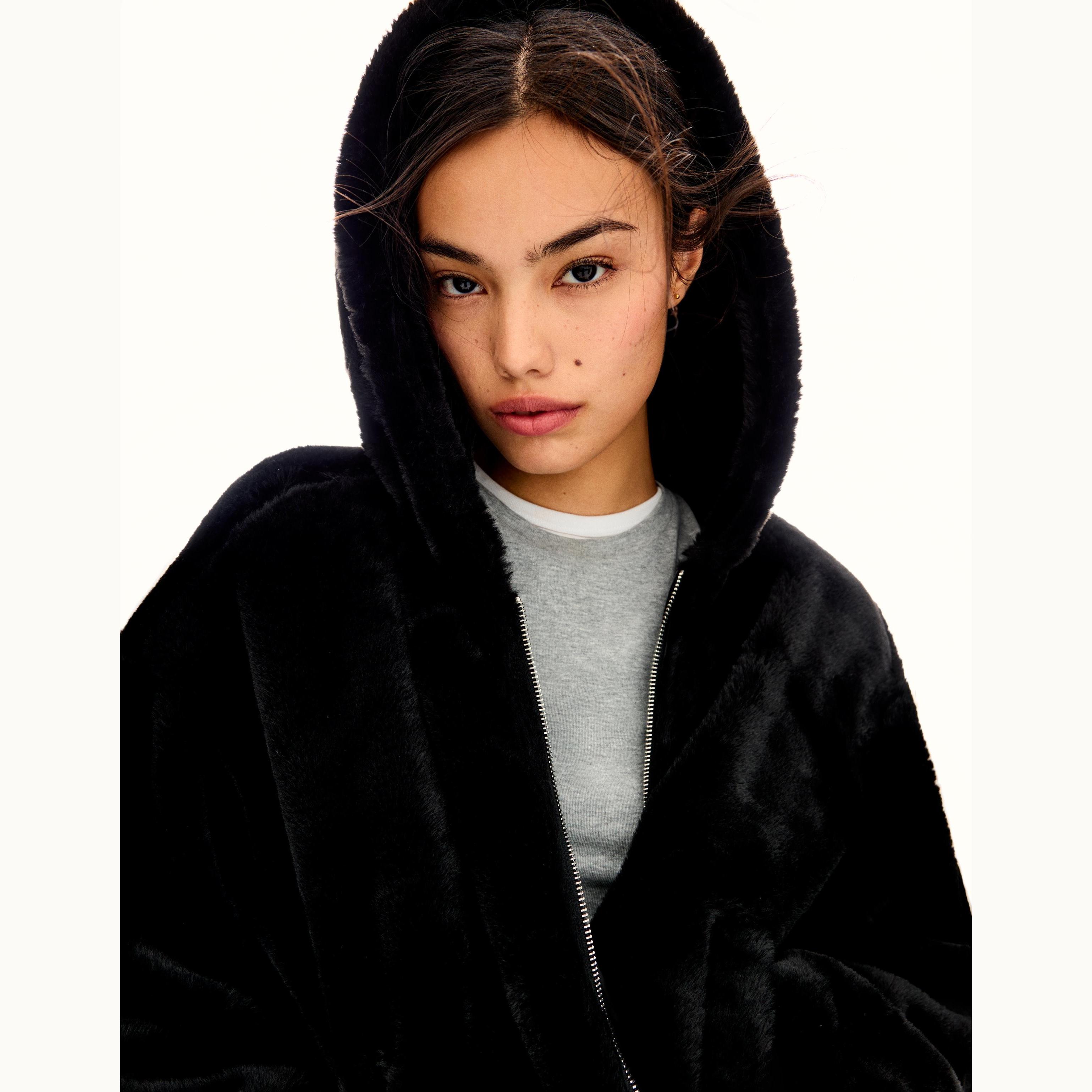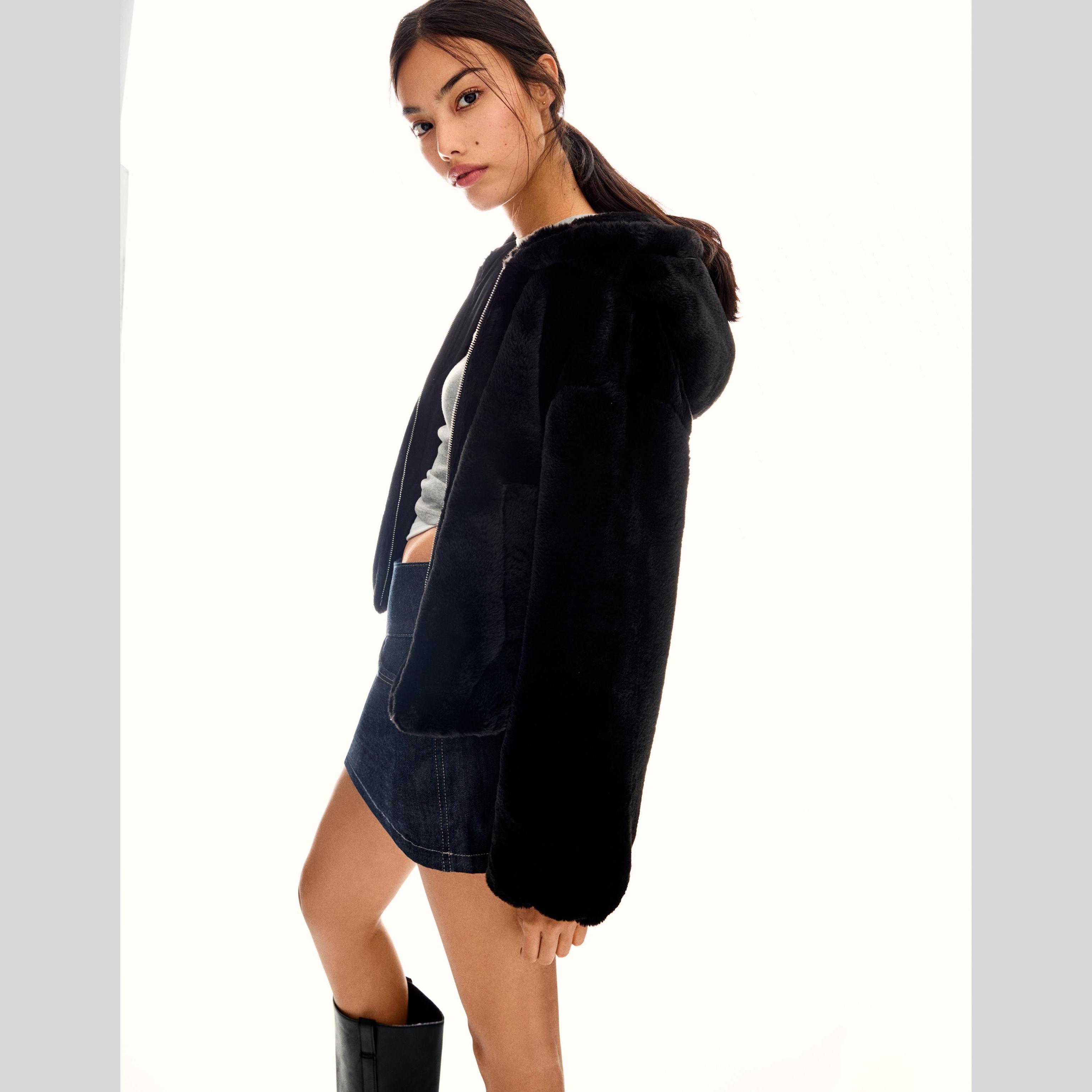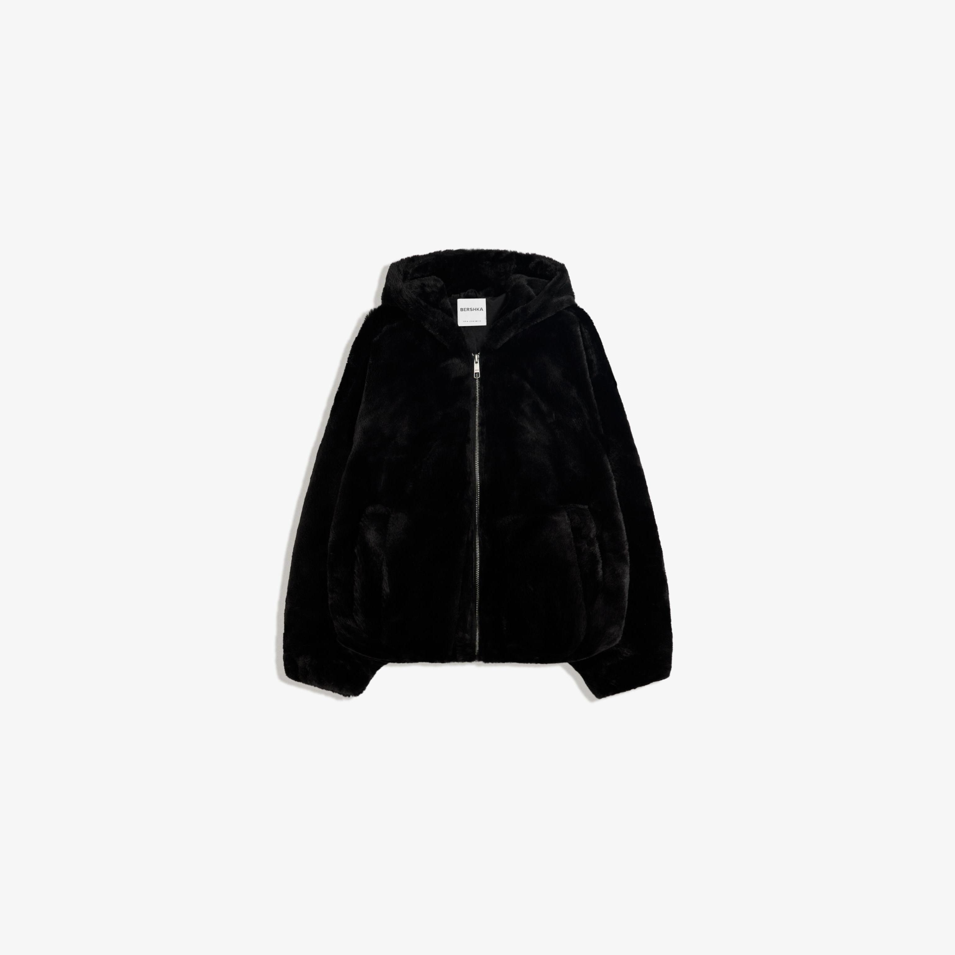 Bershka – جاكيت فرو صناعي بغطاء رأس بلون أسود