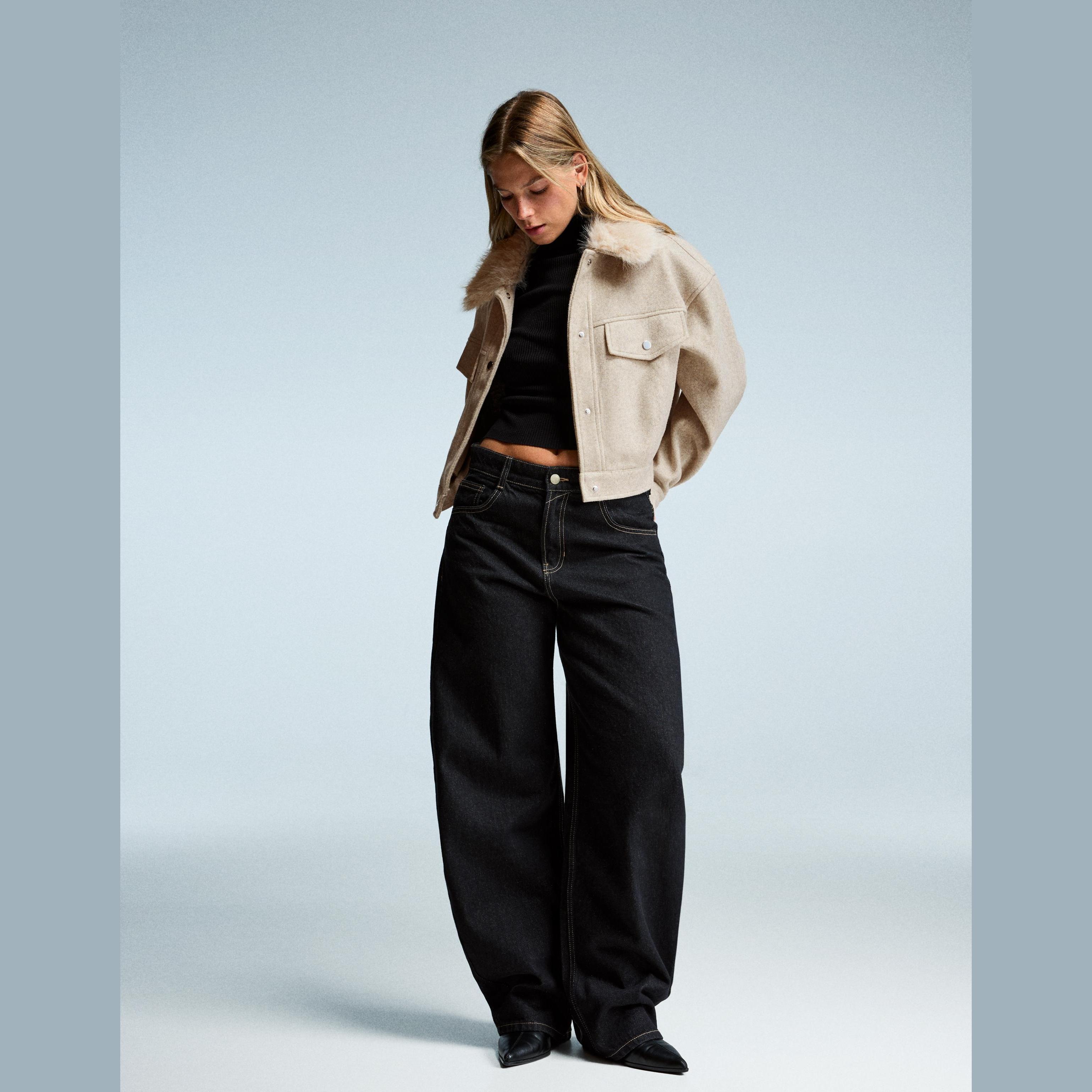 أضيفي لمسة دافئة وعصرية إلى إطلالتك مع هذا الجاكيت التروكر الناعم من Bershka. تصميمه الكلاسيكي بياقة من الفرو الصناعي يمنحك مظهرًا أنيقًا ومريحًا، مثاليًا لأيام الخريف والشتاء.