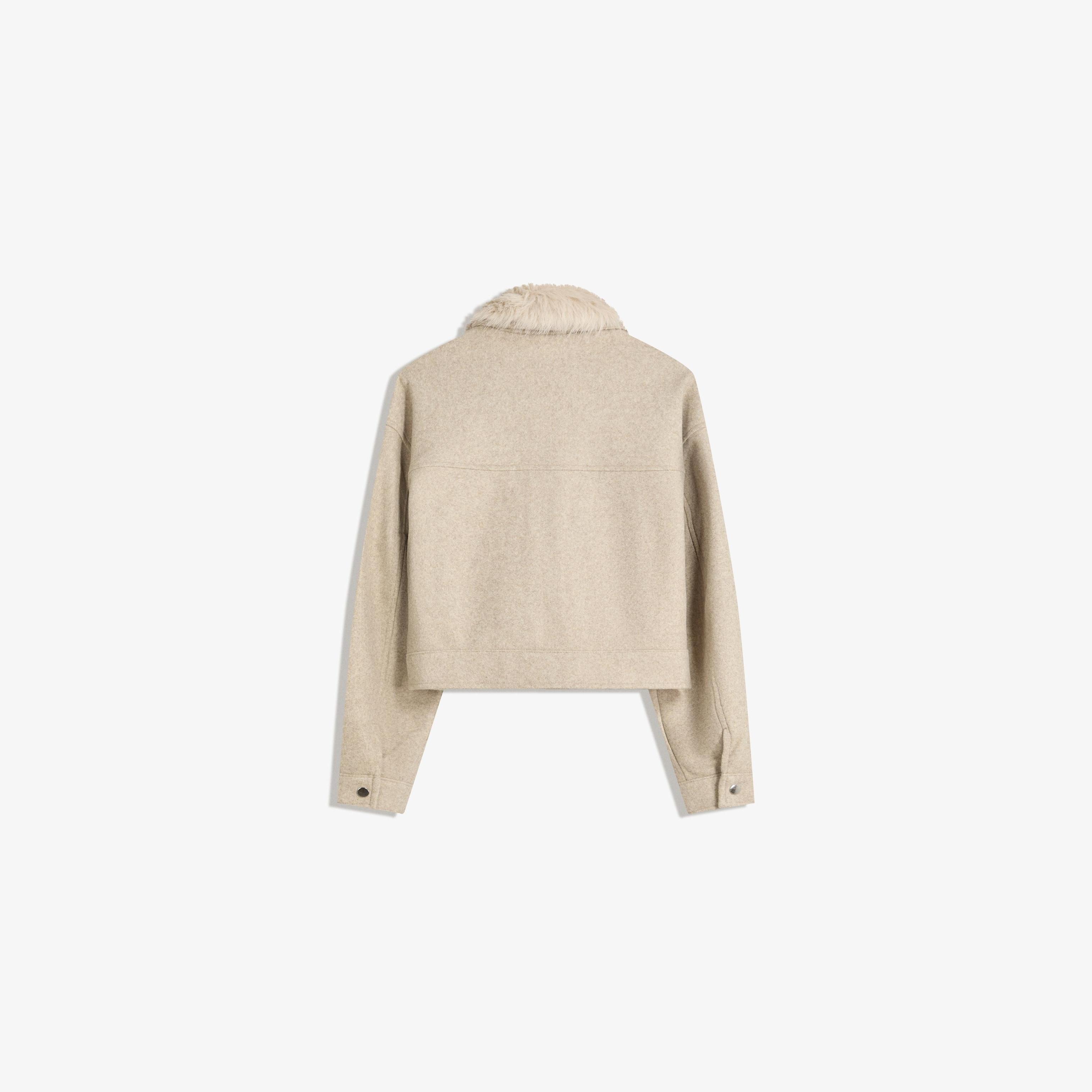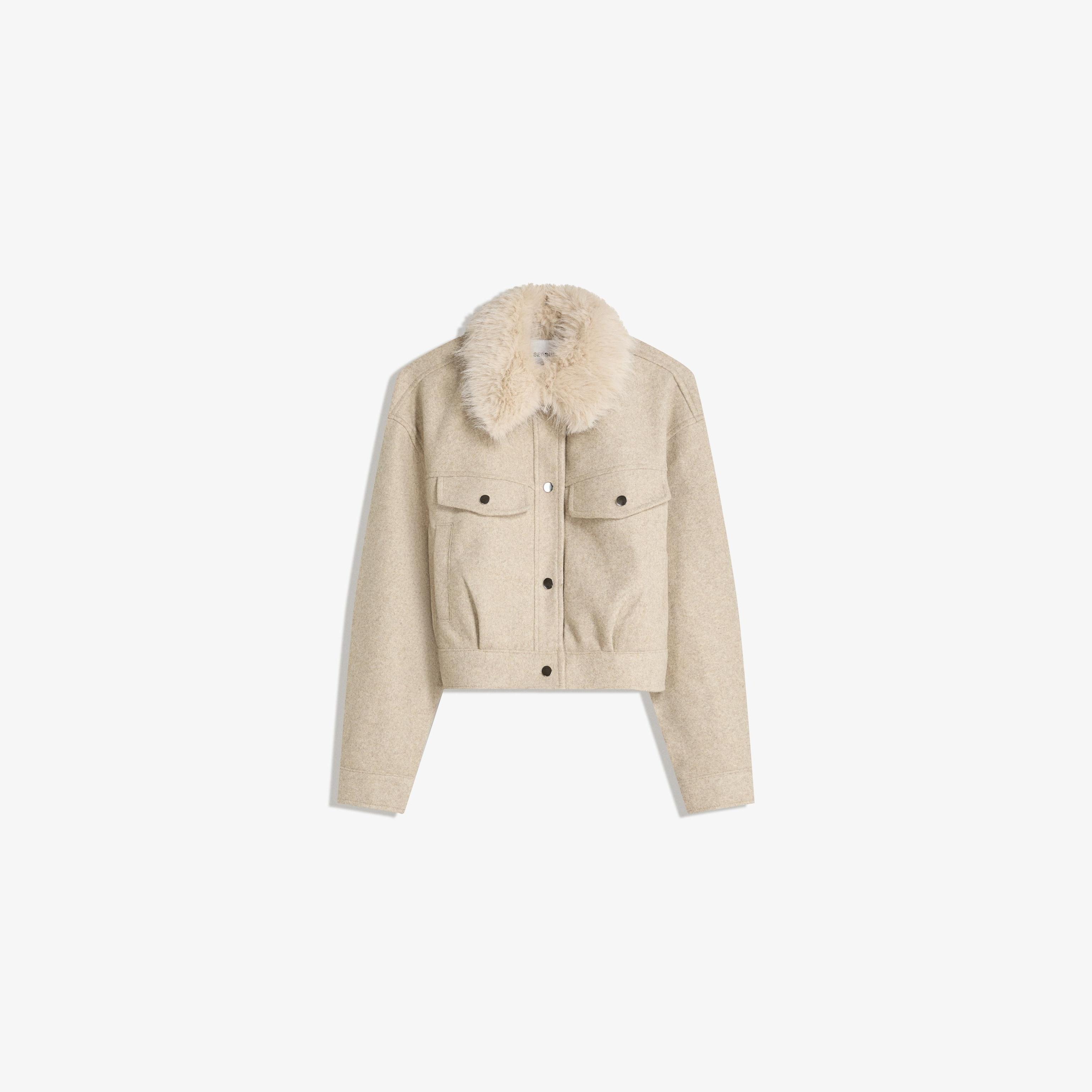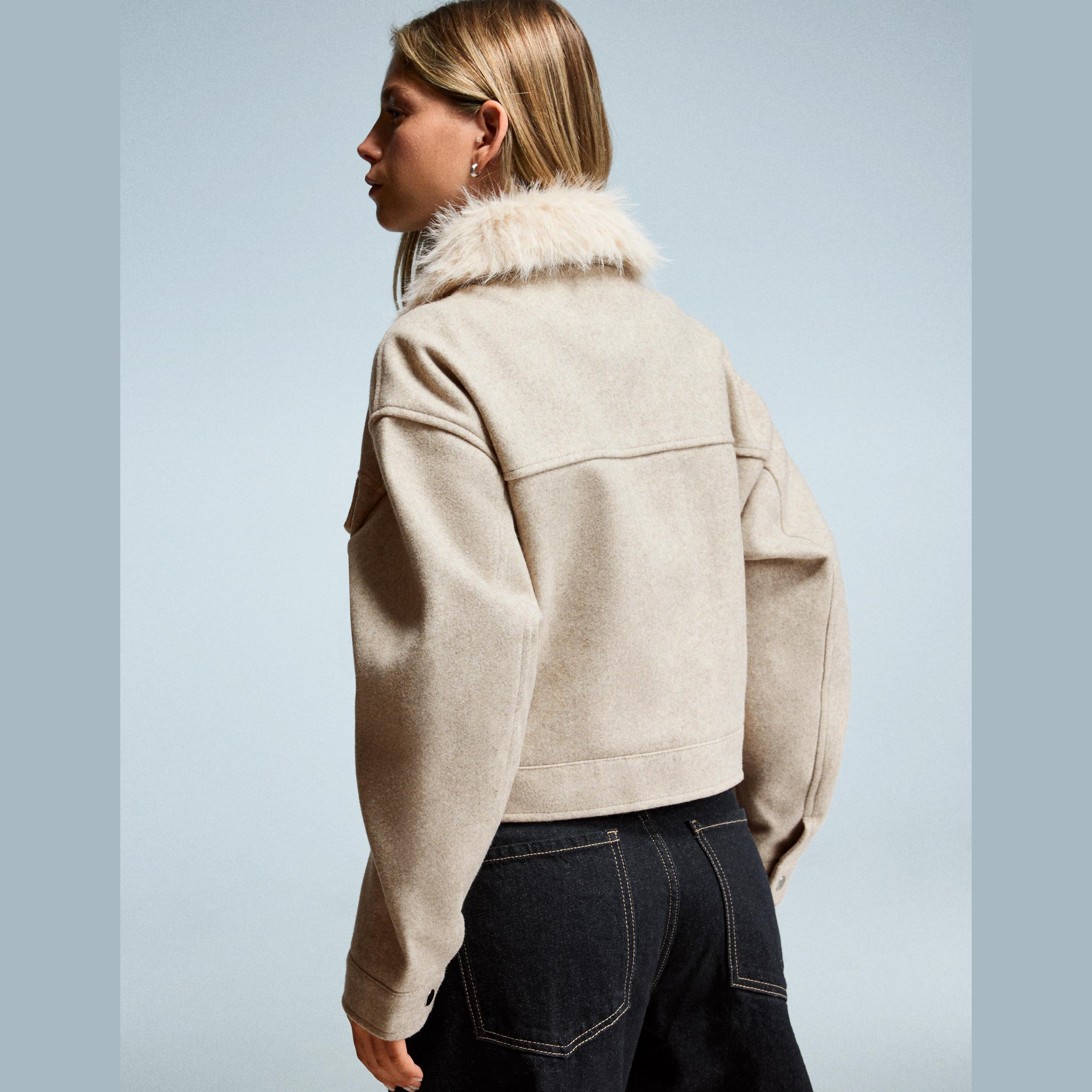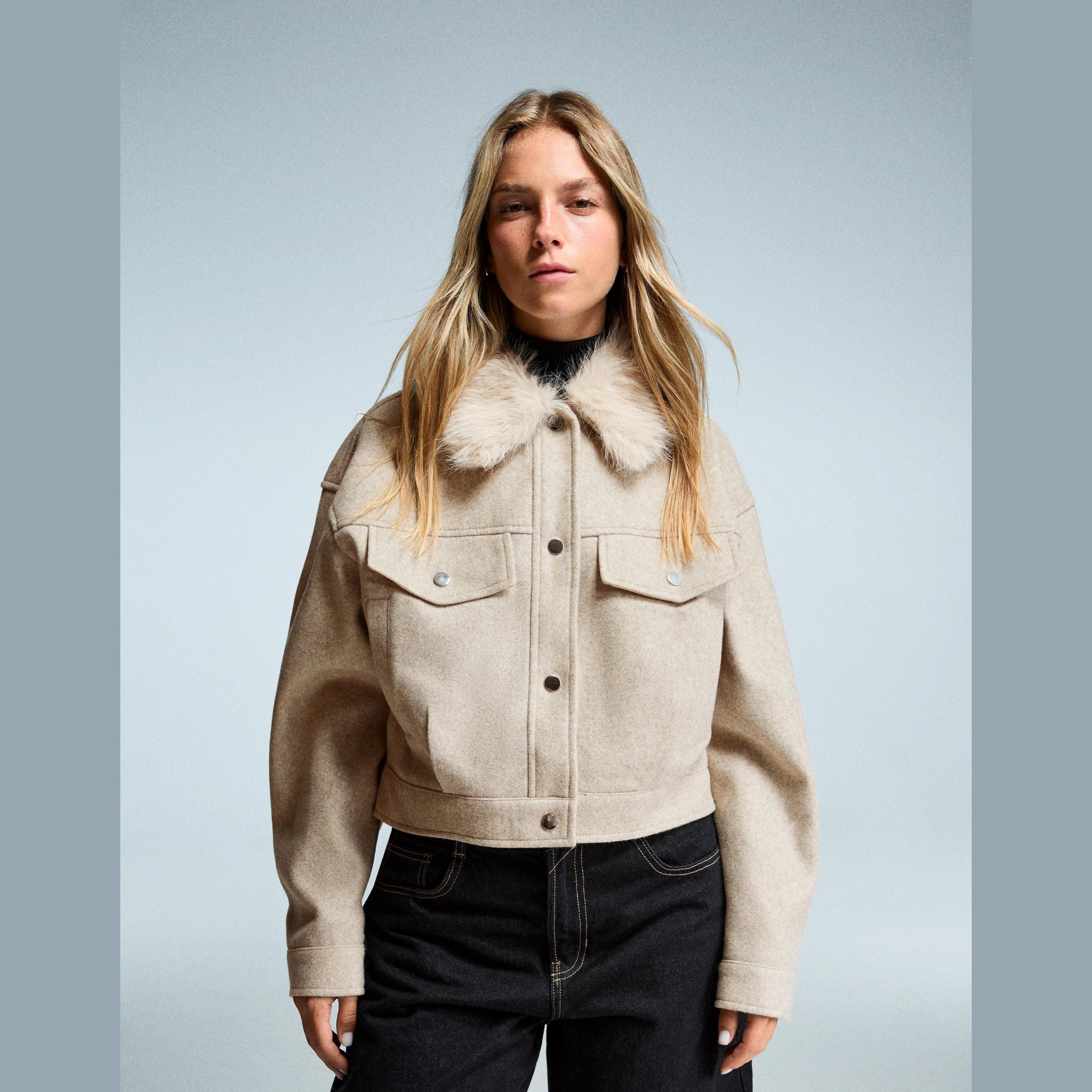 Bershka – جاكيت تروكر ناعم بياقة فرو صناعي بلون بيج