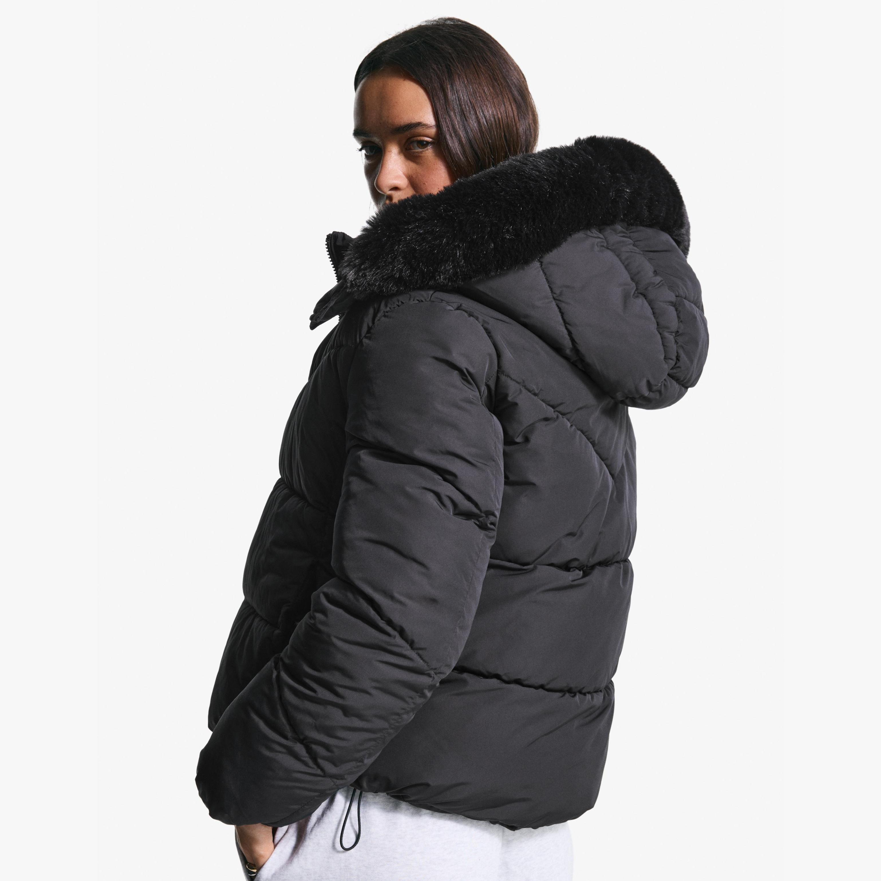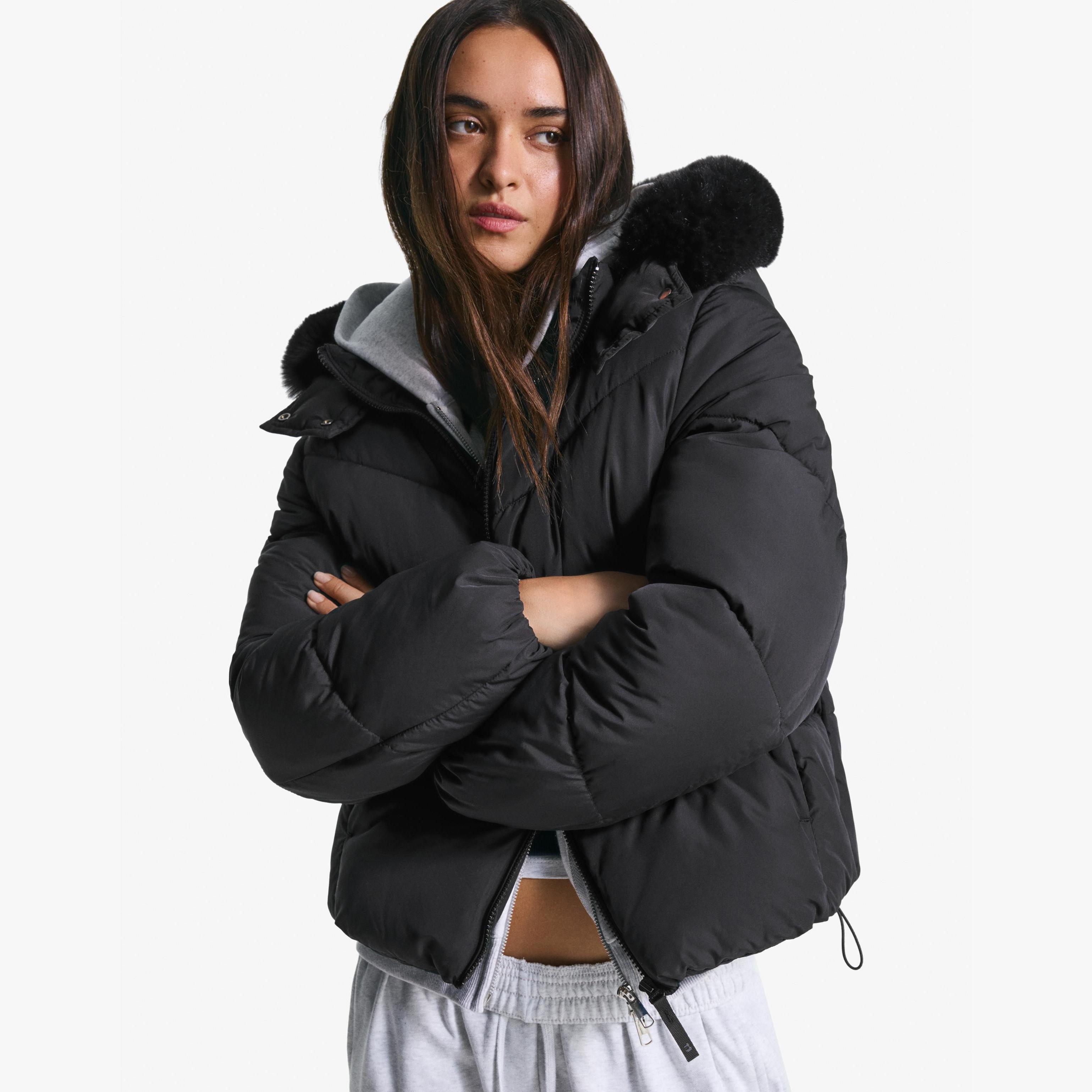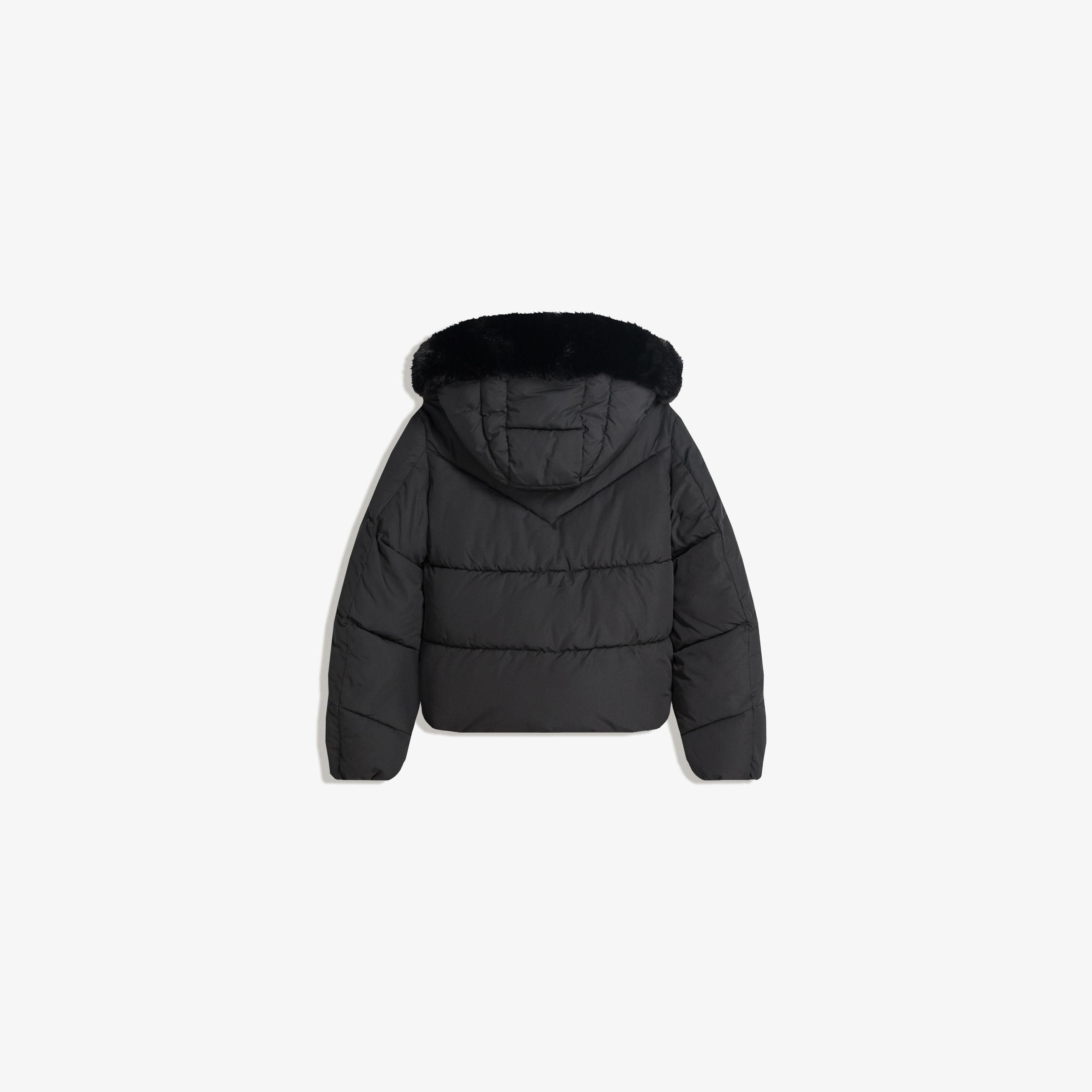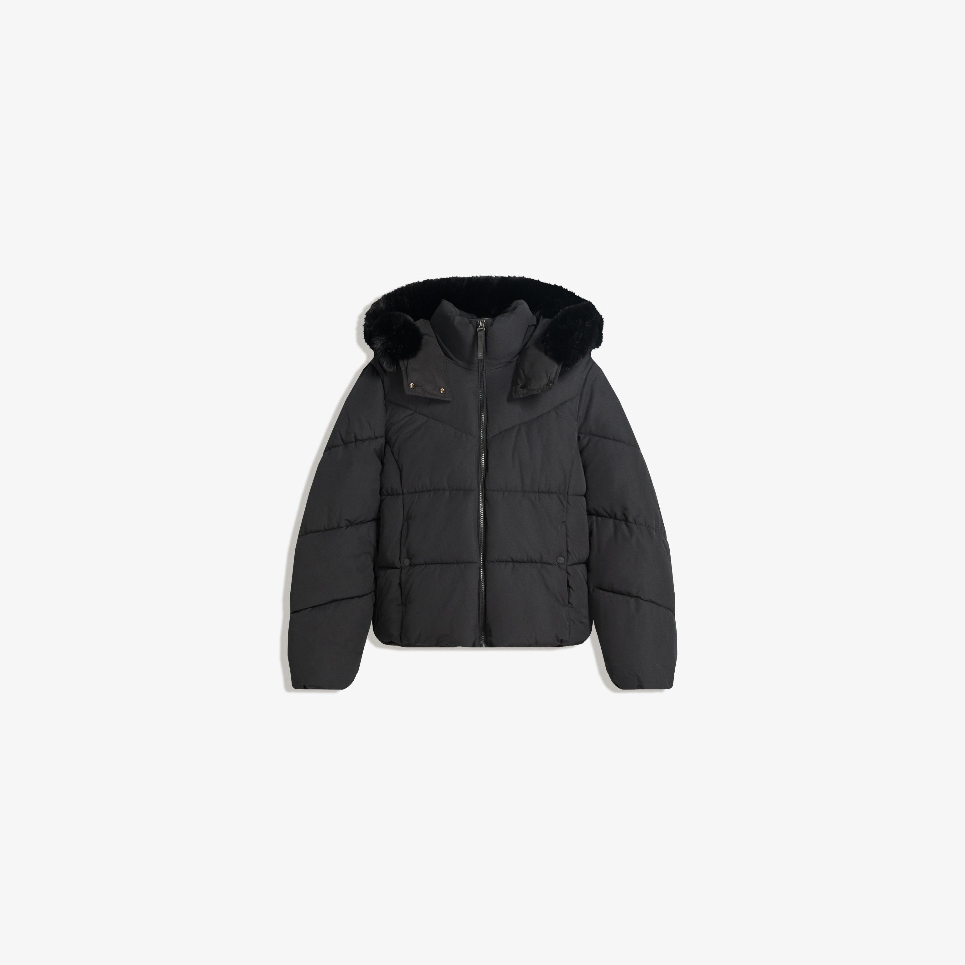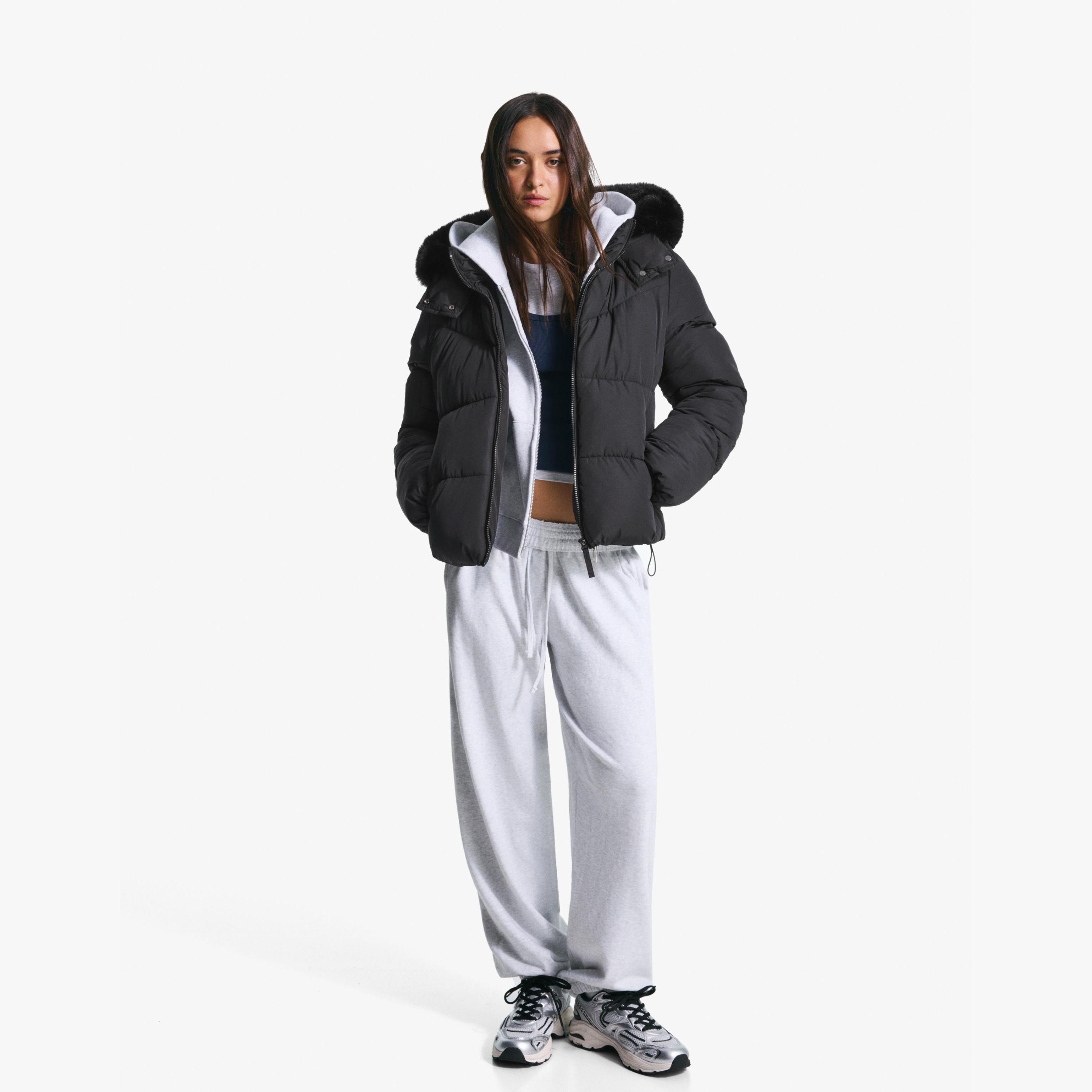 Bershka – جاكيت منتفخ مقاوم للماء بغطاء رأس من الفرو الصناعي بلون أسود
