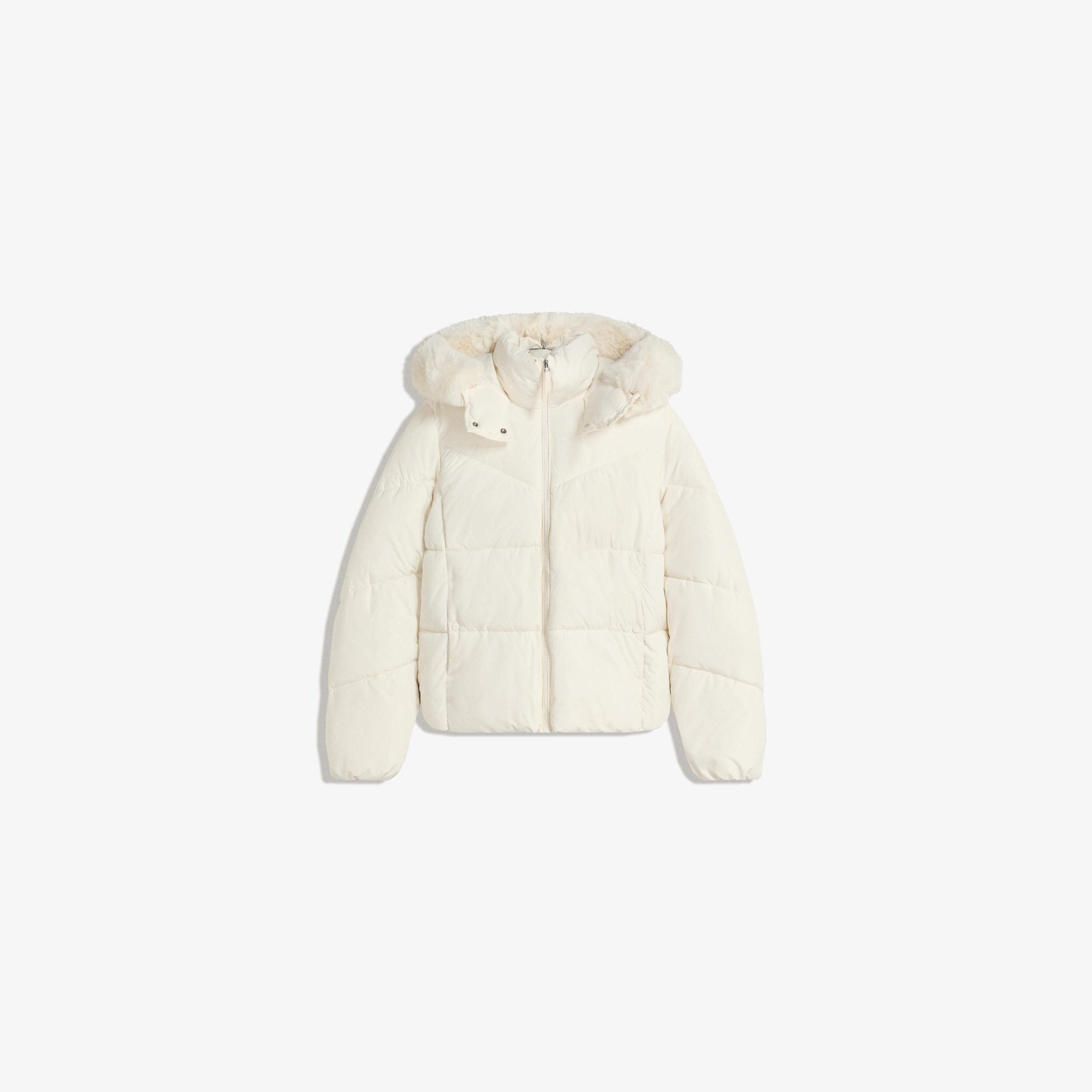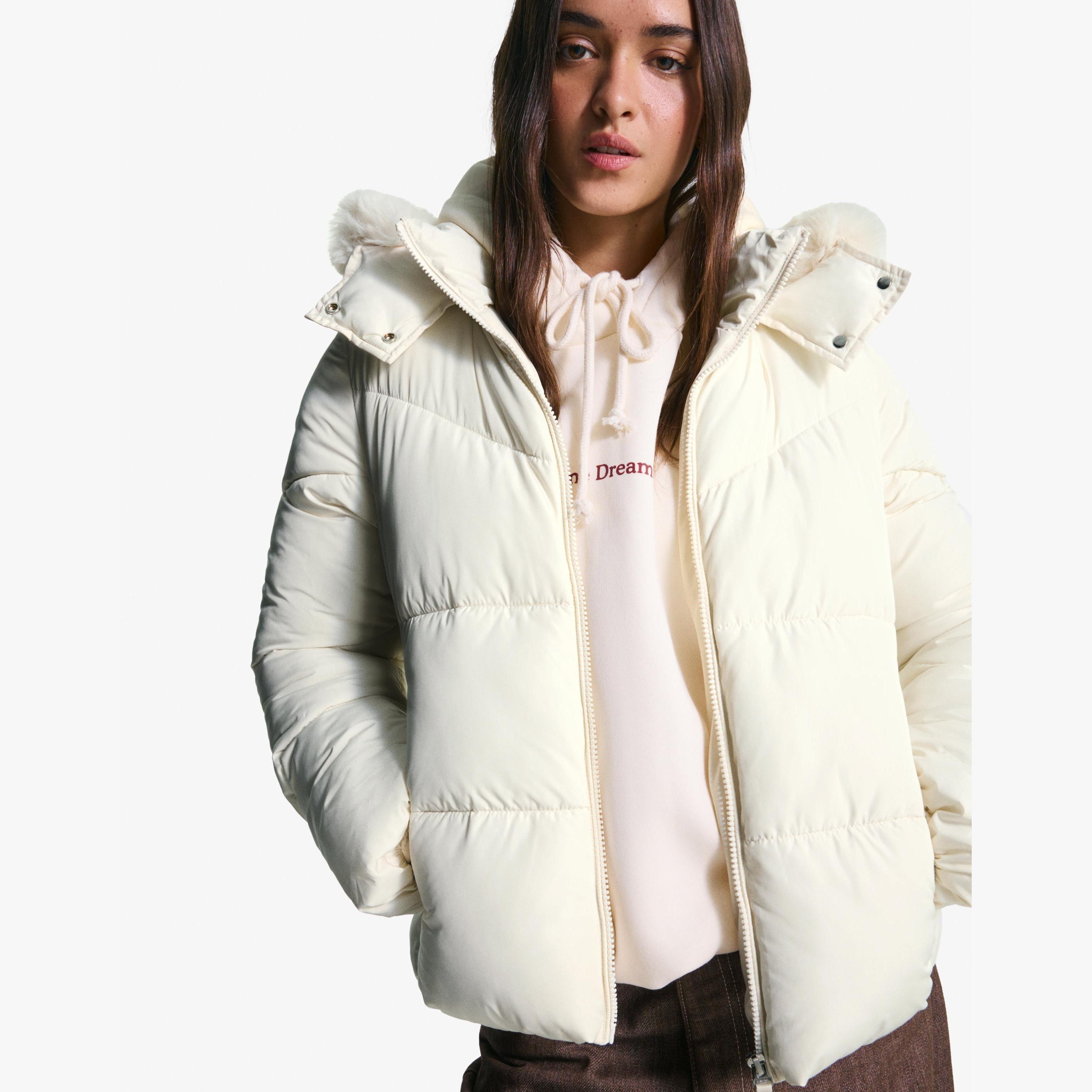 Bershka – جاكيت منتفخ مقاوم للماء بغطاء رأس من الفرو الصناعي بلون رملي