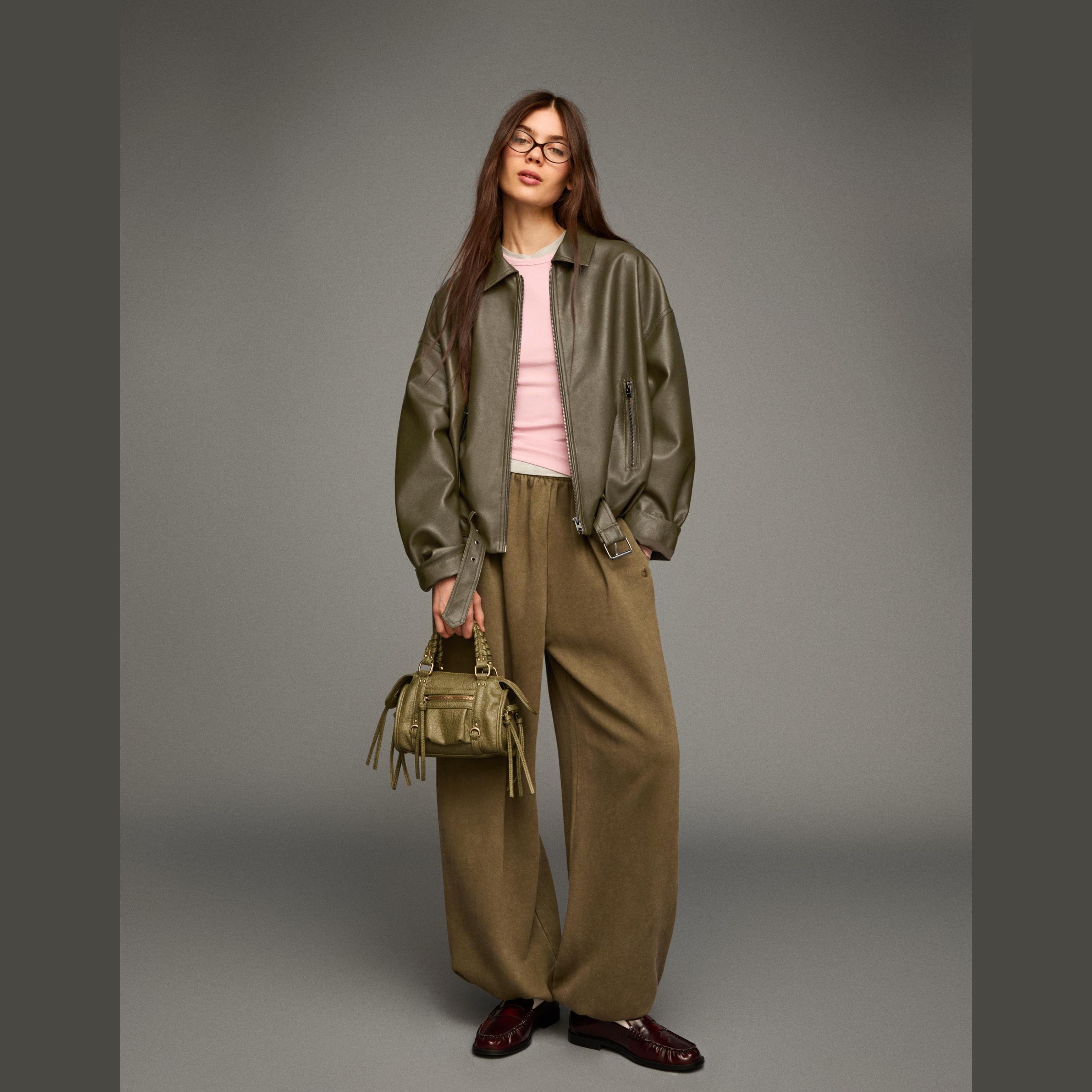 تميّزي بإطلالة قوية وعصرية مع هذا الجاكيت البومبر بتأثير الجلد من Bershka. تصميمه الجريء مع الحزام يضفي لمسة أنثوية على الأسلوب الرياضي، ليمنحك مظهرًا متوازنًا بين الراحة والأناقة.