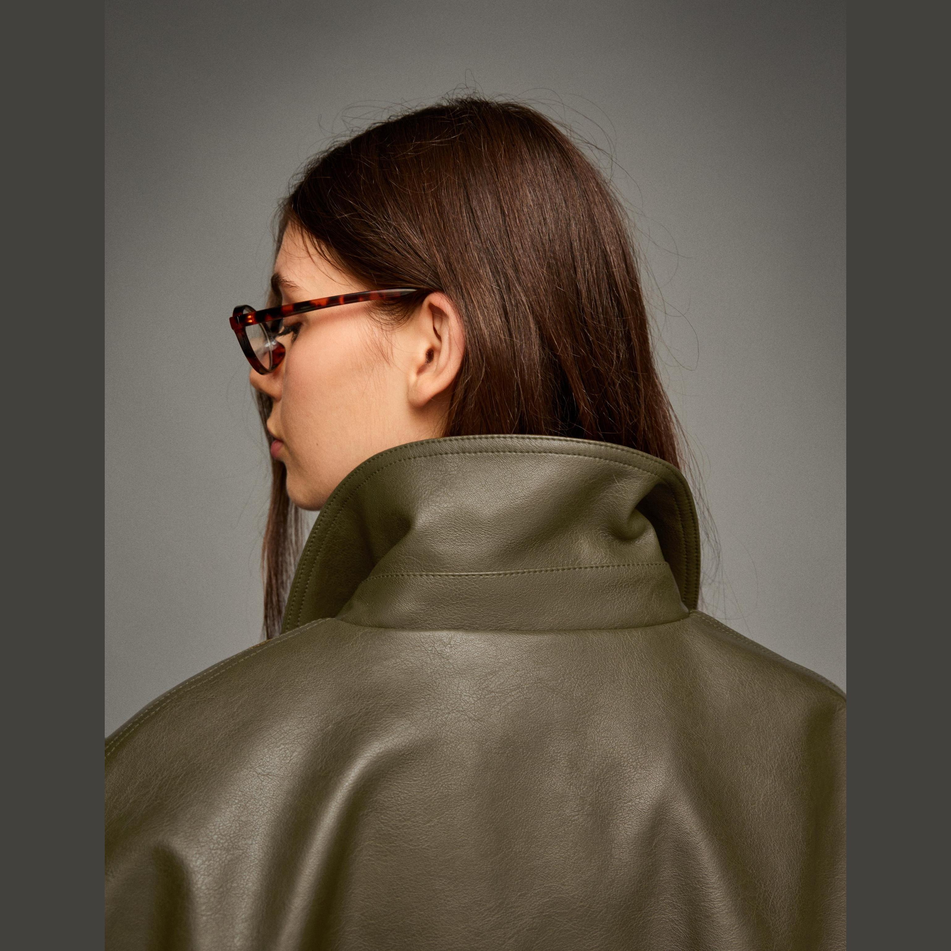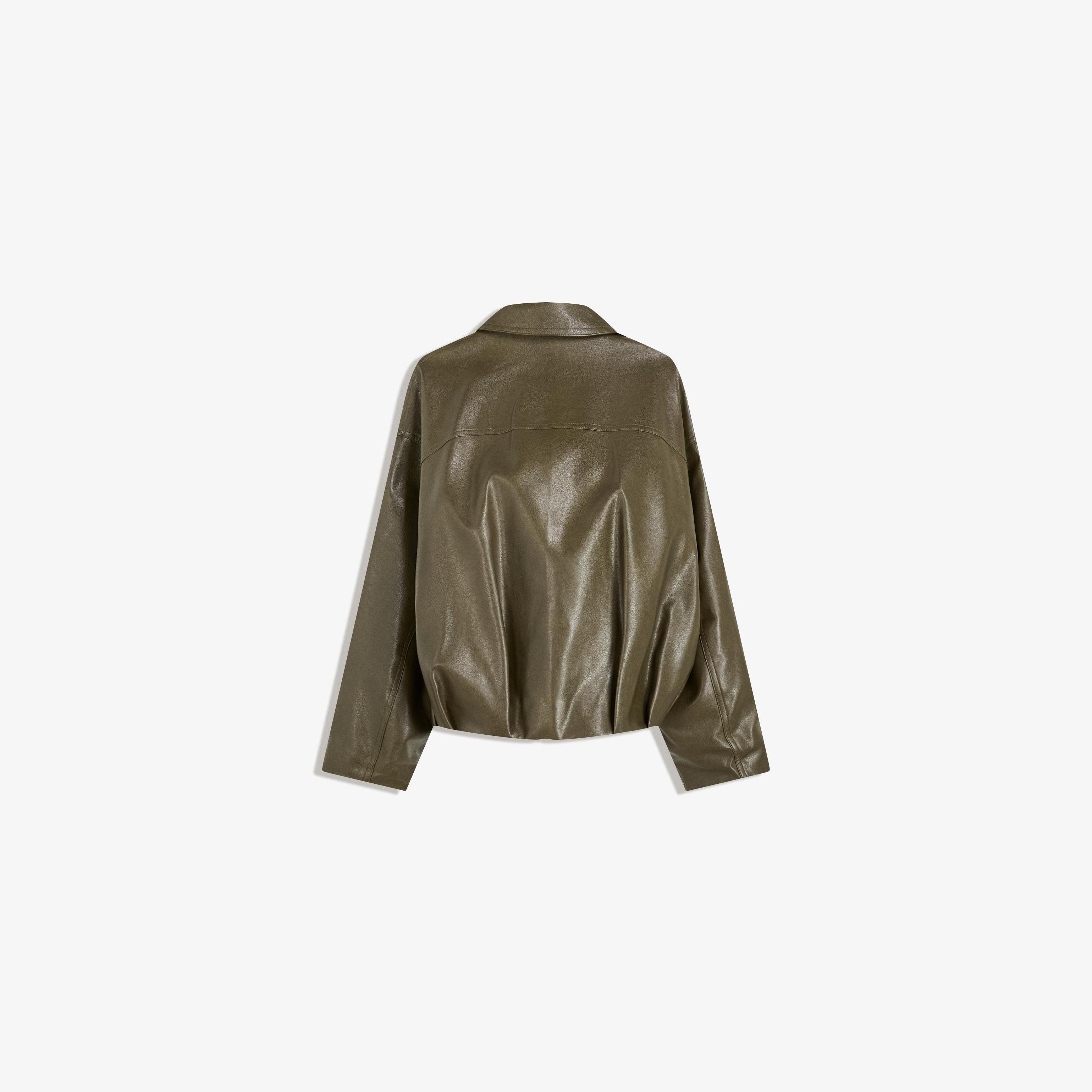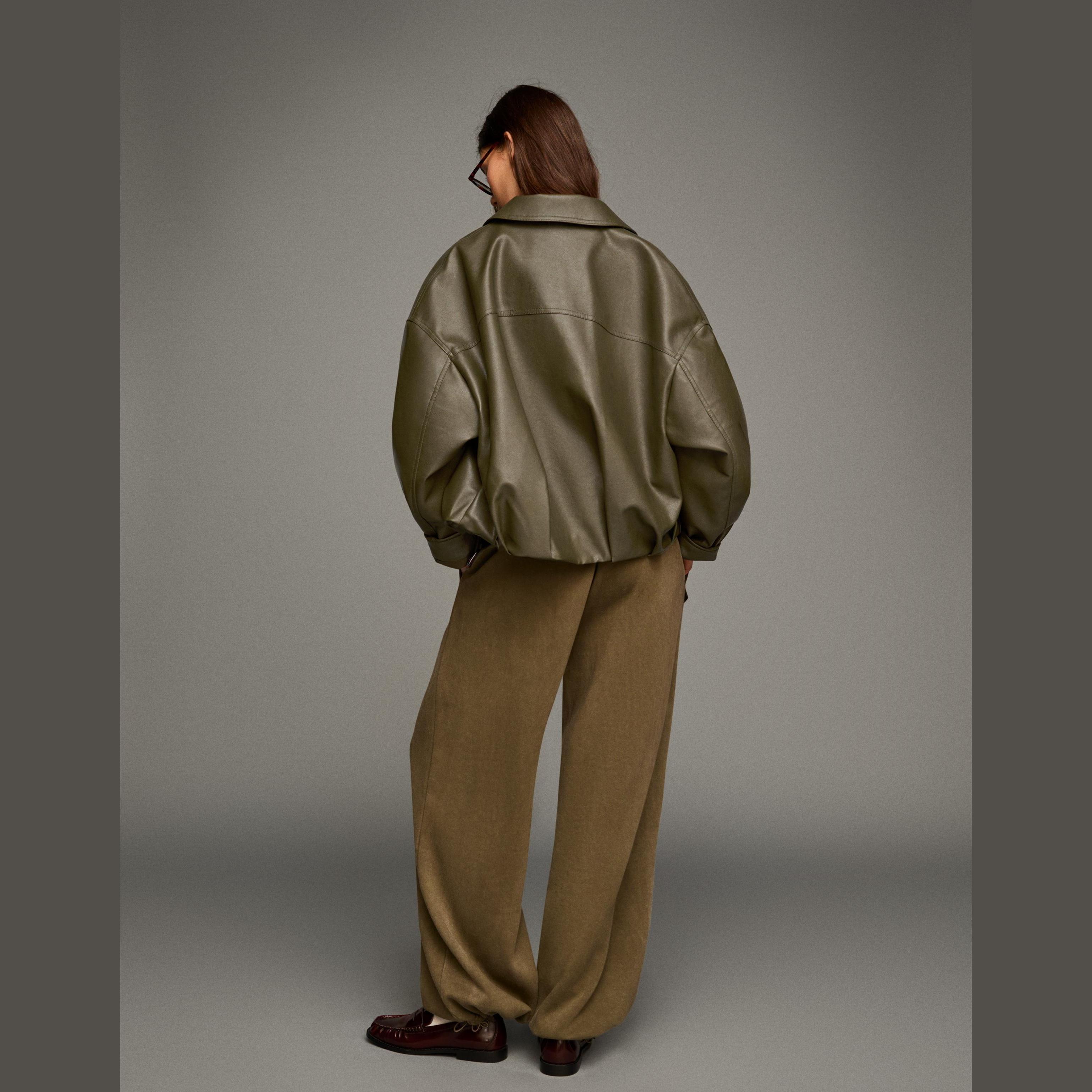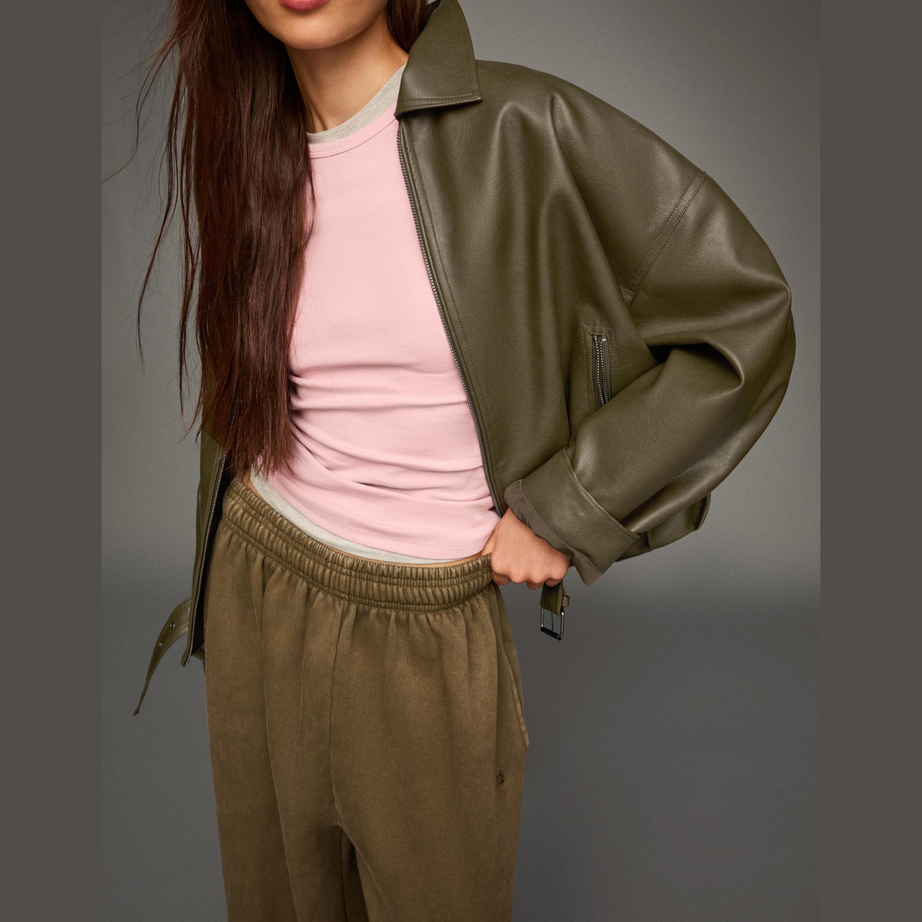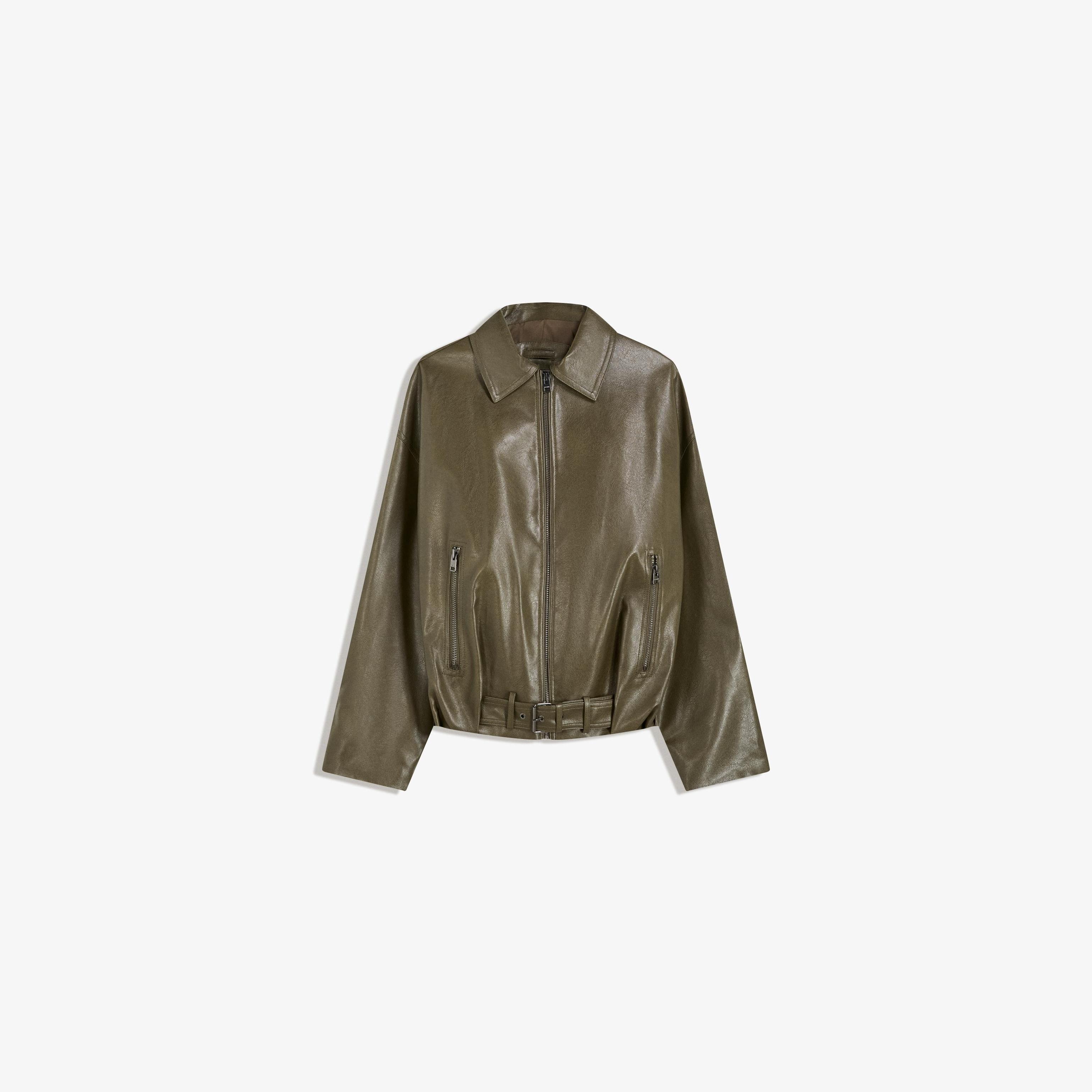 Bershka – جاكيت بومبر بتأثير الجلد مع حزام بلون كاكي