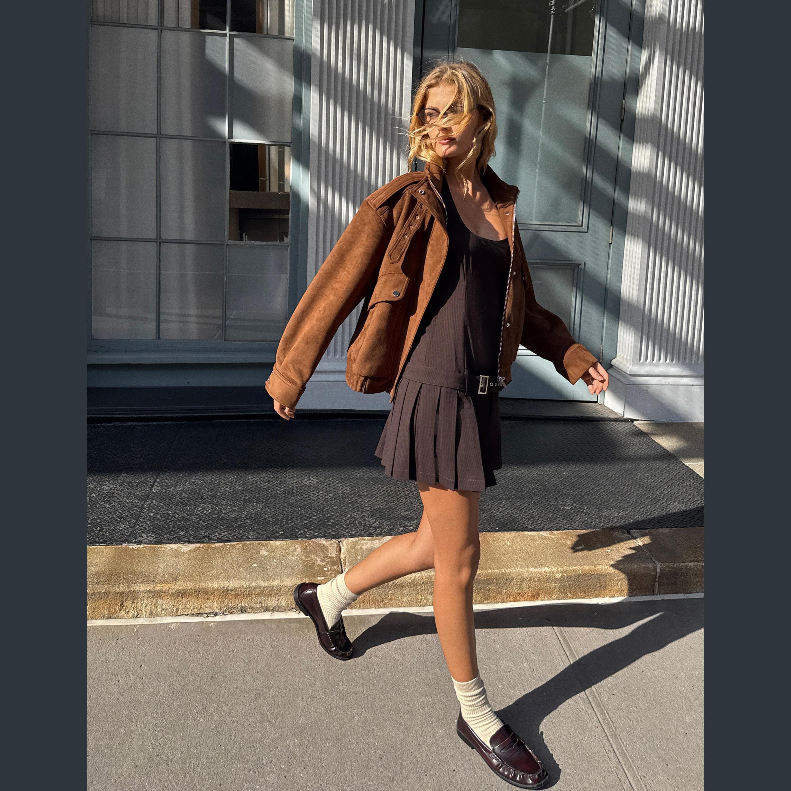 أضيفي لمسة دافئة وراقية إلى إطلالتك مع هذا الجاكيت المصنوع من الشامواه الصناعي من Bershka. تصميمه الناعم ولمسته المخملية يمنحانك مظهرًا أنيقًا وعصريًا، مثاليًا للخريف والشتاء.