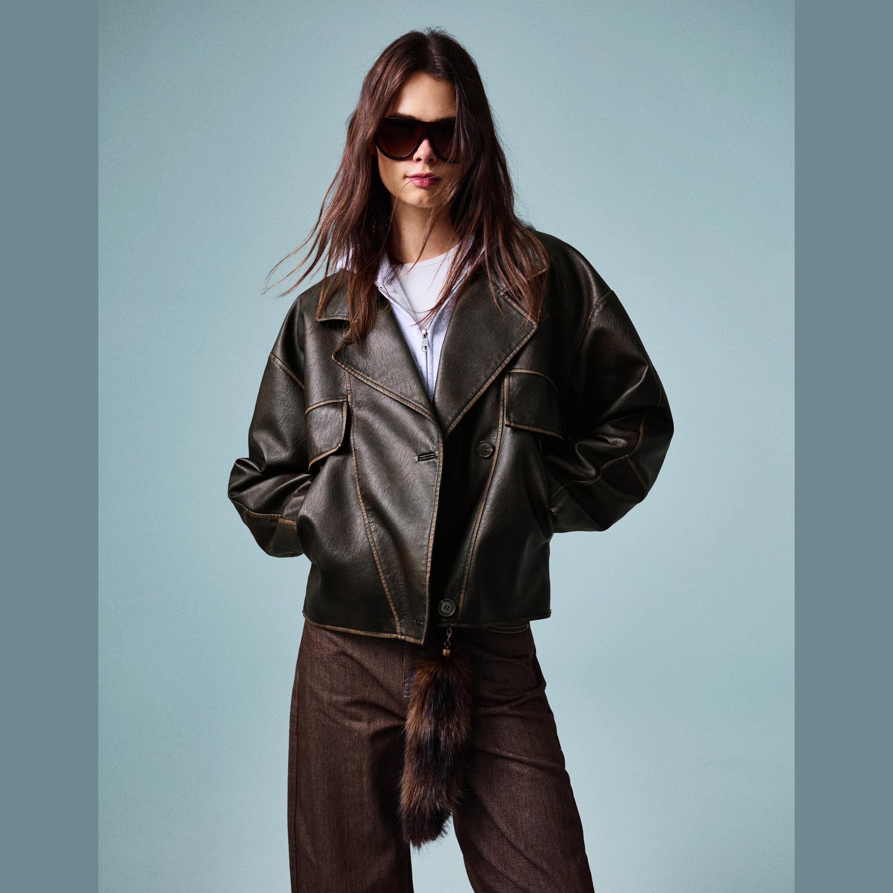 - التفاصيل: ملمس جلد صناعي لامع، أكمام طويلة، جيوب جانبية، خياطة بارزة