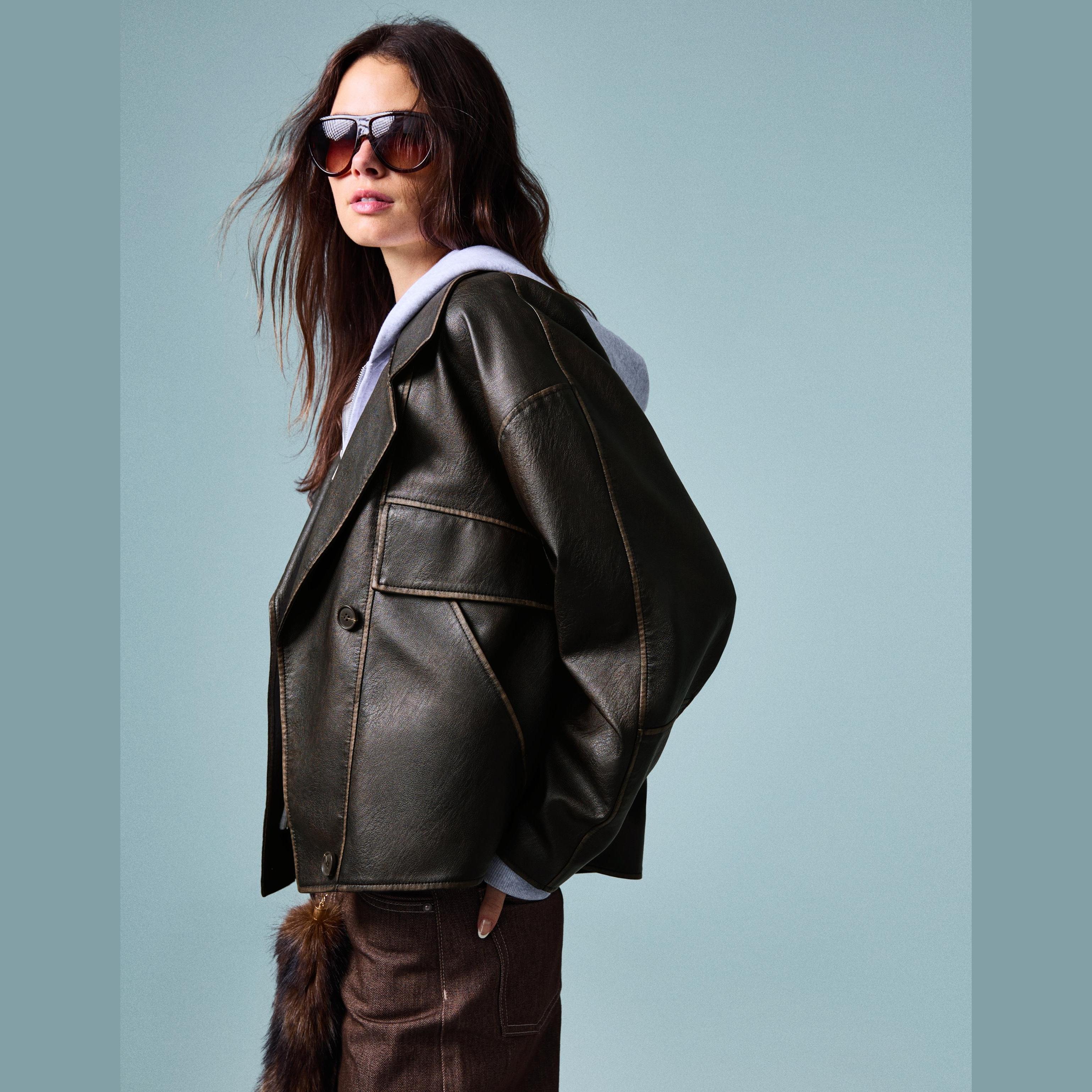 تميّزي بإطلالة تجمع بين الأناقة والجرأة مع هذا الجاكيت من Bershka بتأثير الجلد ولمسة لامعة. تصميمه الكلاسيكي بياقة قابلة للطي يمنحك مظهرًا عصريًا مثاليًا للخريف والشتاء، سواء في تنسيقات يومية أو مناسبات مسائية.