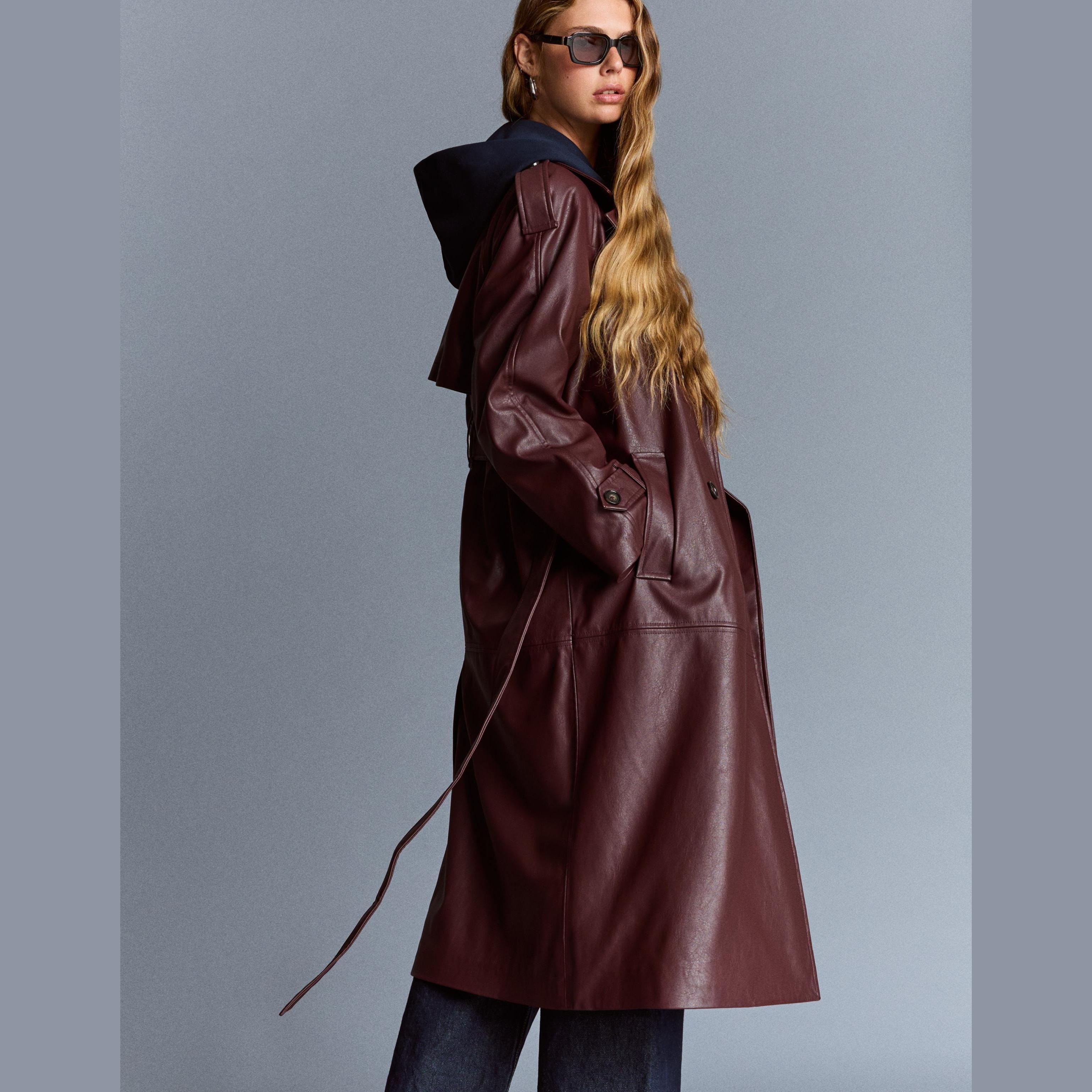 تميّزي بإطلالة جريئة وأنيقة مع هذا الترنش كوت المصنوع من الجلد الصناعي من Bershka. لونه النبيذي العميق يضيف دفئًا وجرأة، بينما التصميم الكلاسيكي بالحزام يبرز جمال القوام ويمنحك حضورًا لافتًا في كل مناسبة.
