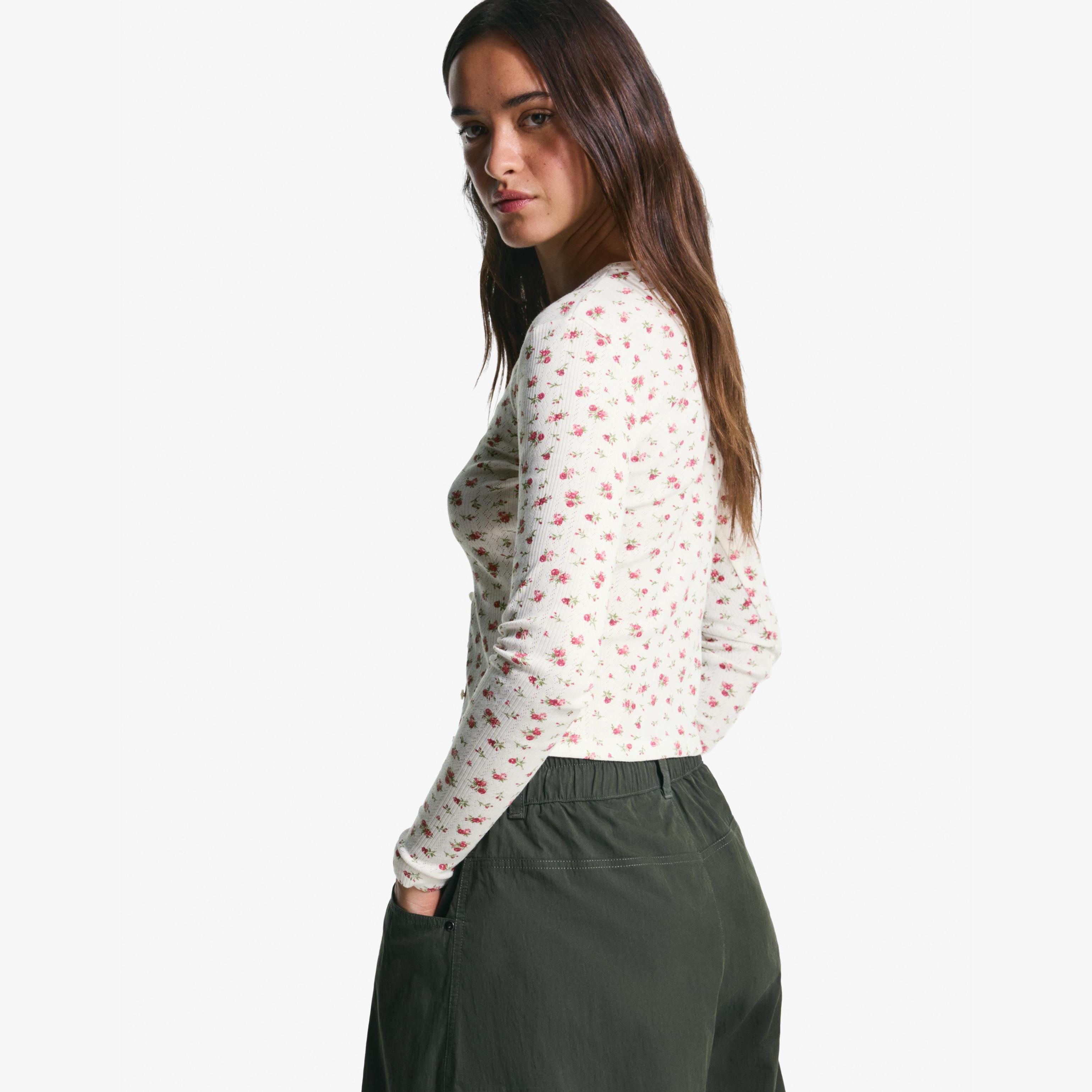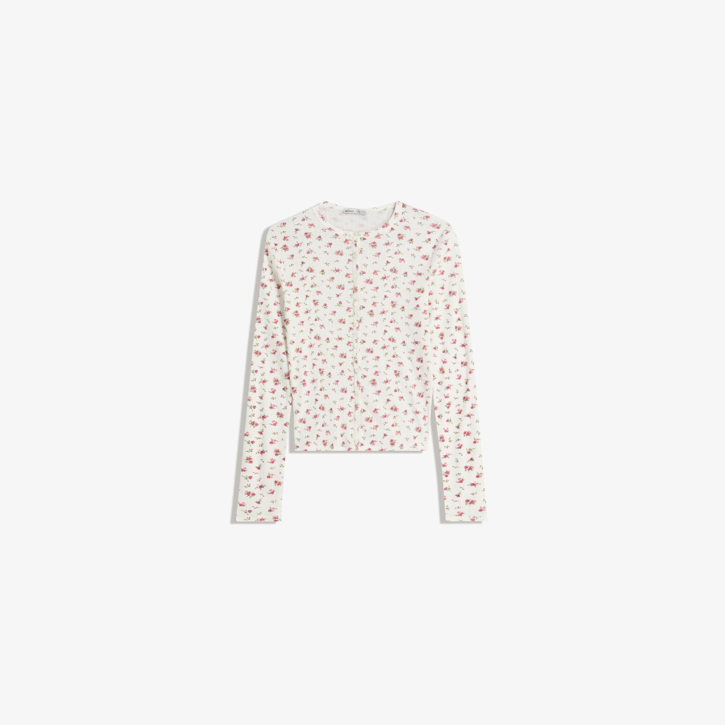 تميّزي بإطلالة ناعمة وعصرية مع هذا الكارديغان الكريمي من Bershka. تصميمه بنقشة Pointelle وأزراره الأمامية يمنحك لمسة أنثوية أنيقة، مثالية لأيام الربيع والخريف أو للارتداء داخل المنزل بأسلوب مريح ومتناسق.