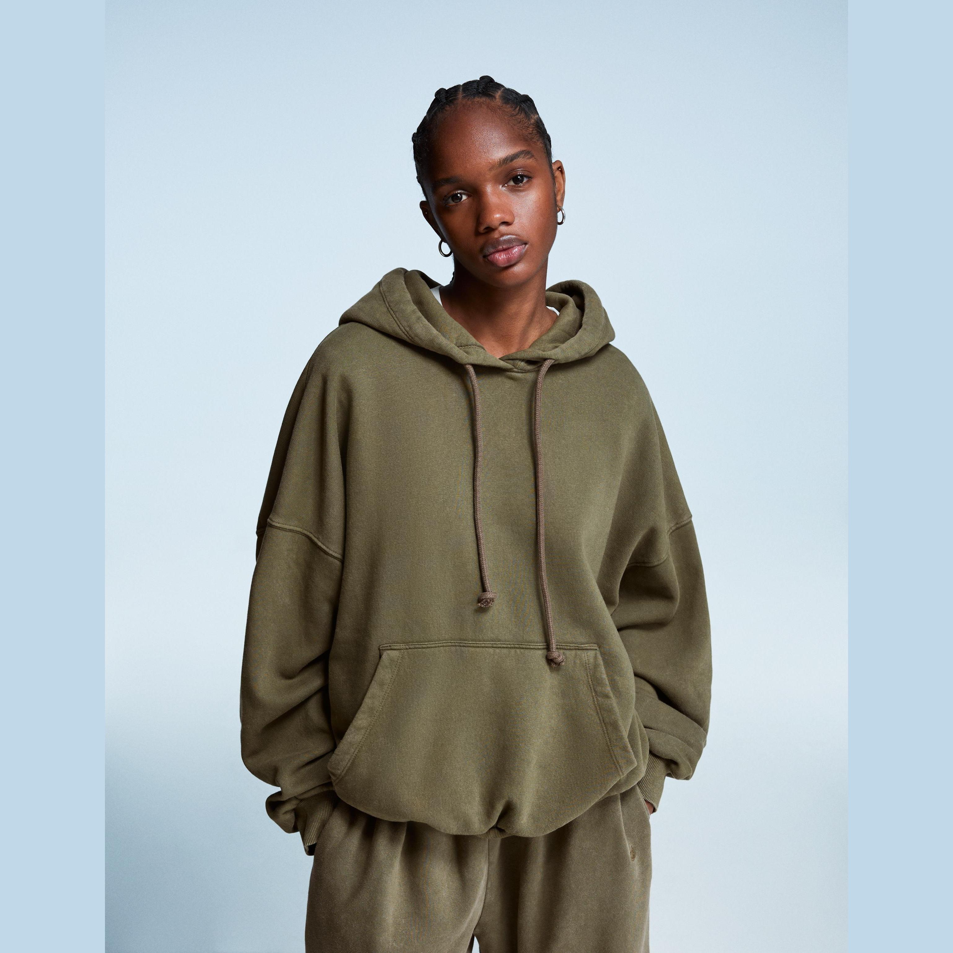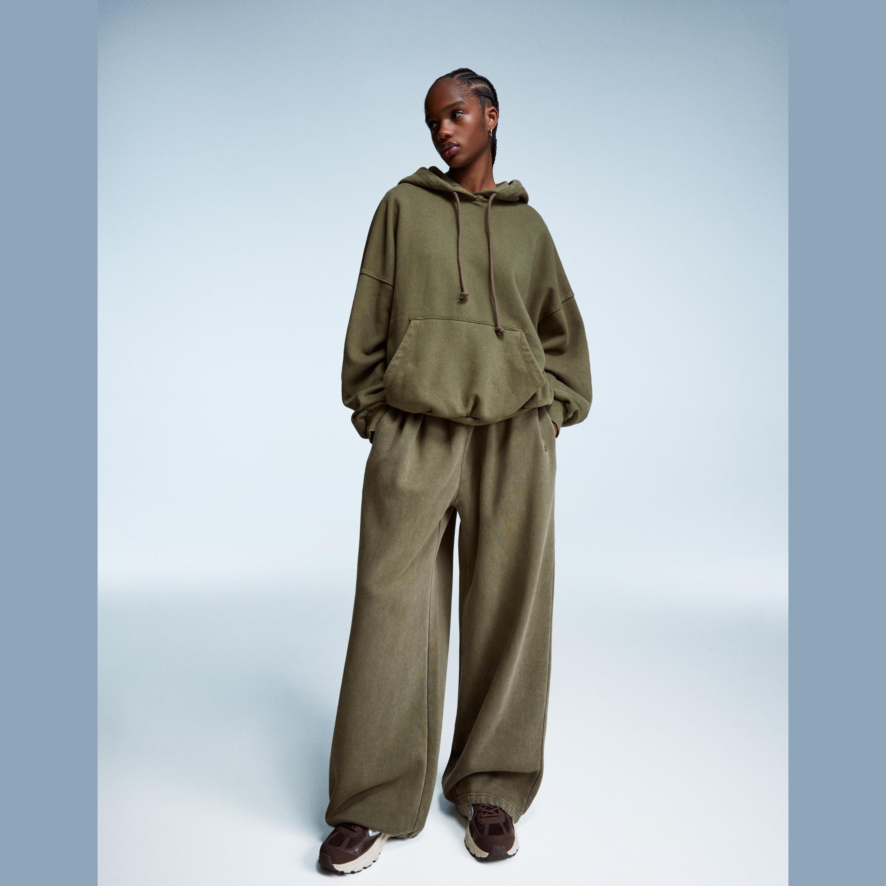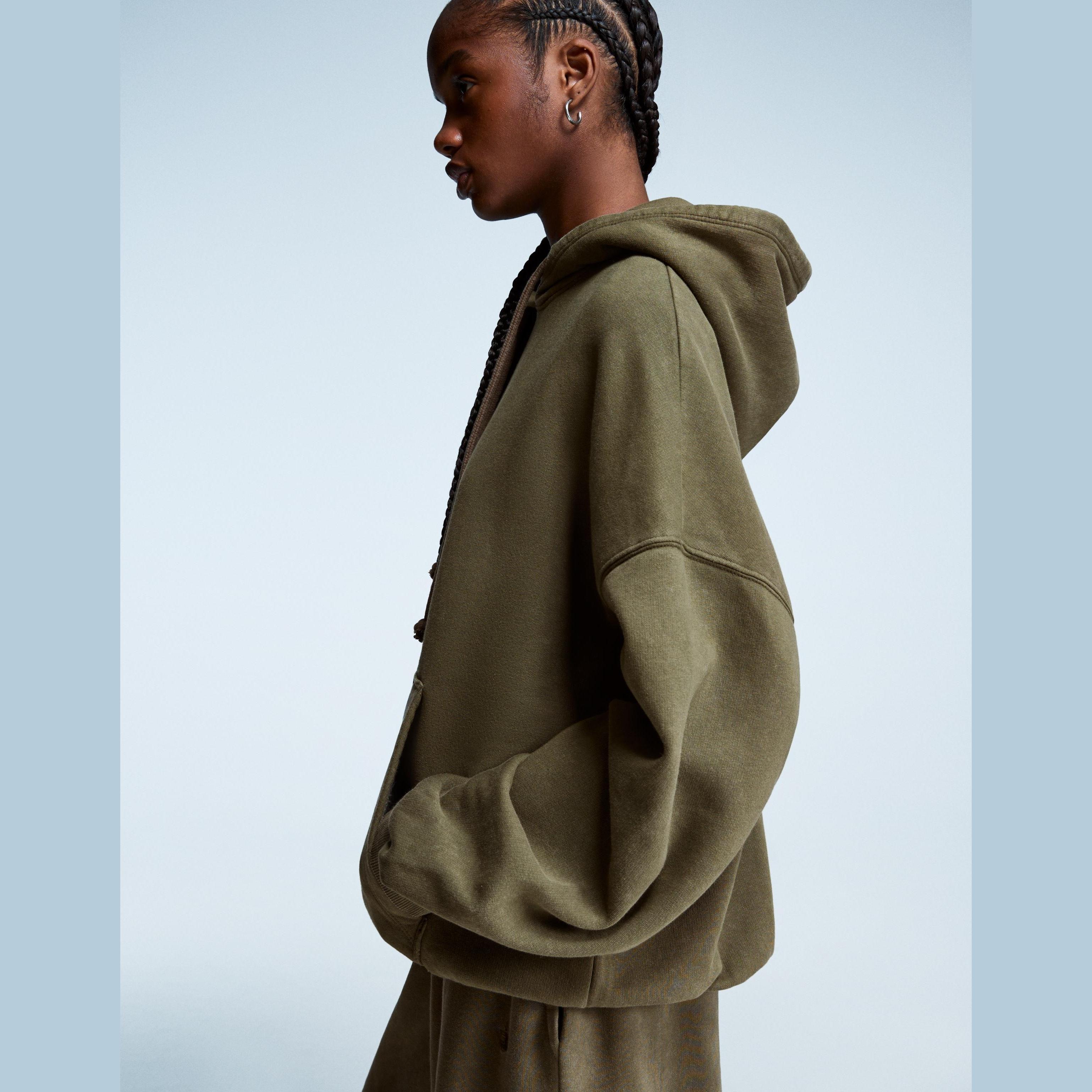 تميّزي بإطلالة كاجوال واسعة وعصرية مع هذا الهودي الأوفرسايز من مجموعة Bershka النسائية. تصميمه البسيط والفضفاض يمنحك راحة مثالية، بينما يضفي اللون الكاكي لمسة حيادية أنيقة تناسب كل المواسم.