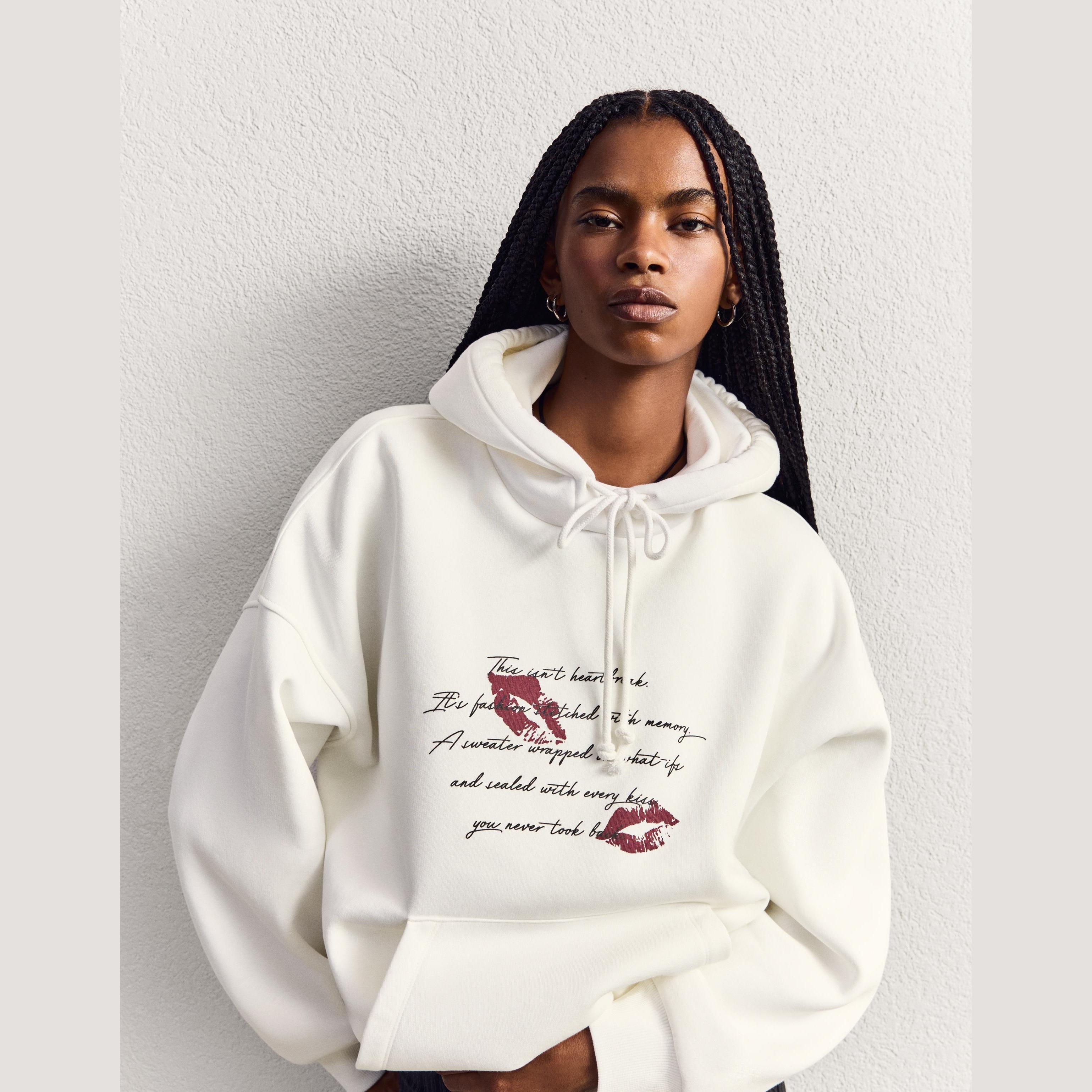 تميّزي بإطلالة كاجوال واسعة وعصرية مع هذا الهودي الأوفرسايز من مجموعة Bershka النسائية. تصميمه الفضفاض وطباعته الأمامية يمنحانك ستايل شبابي مريح، بينما يضفي اللون الكريمي لمسة حيادية ناعمة تناسب كل المواسم.