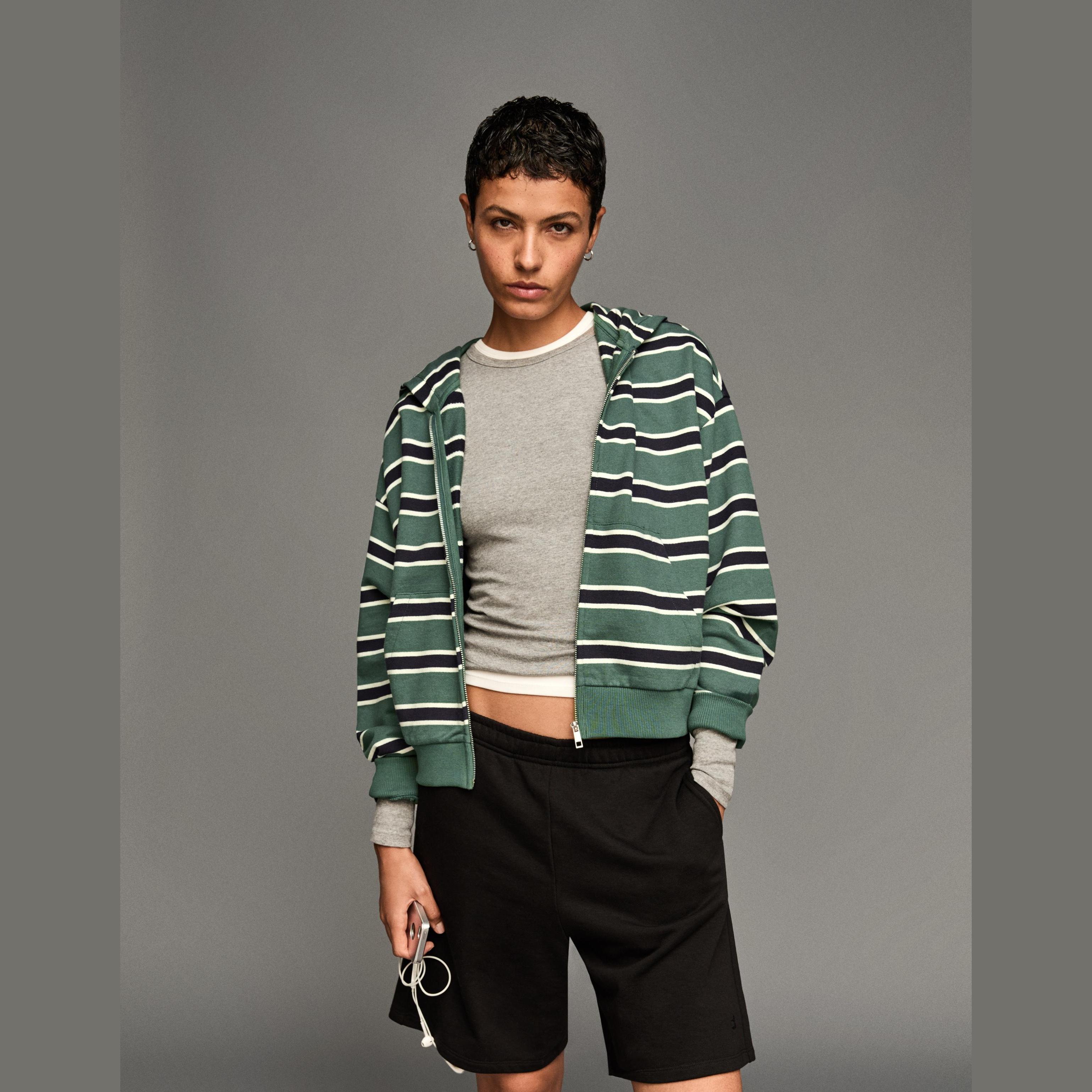 تميّزي بإطلالة شبابية واسعة وعصرية مع هذا الهودي الأوفرسايز المخطط من مجموعة BSK Teen لدى Bershka. تصميمه الفضفاض وسحابه الأمامي يمنحك راحة مثالية، بينما تضيف الخطوط الأفقية لمسة ديناميكية بلون أخضر حيوي.