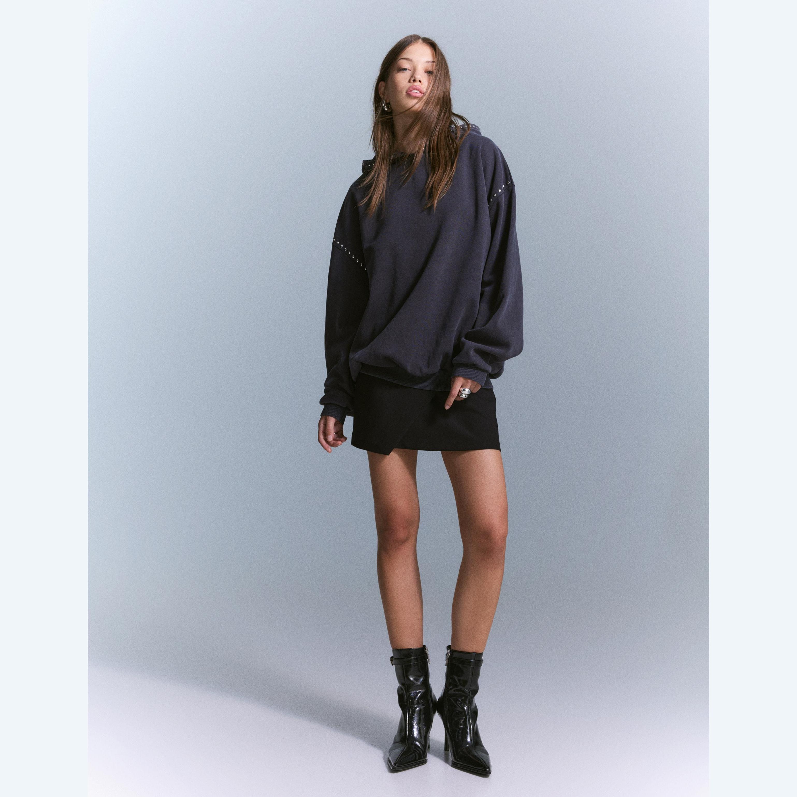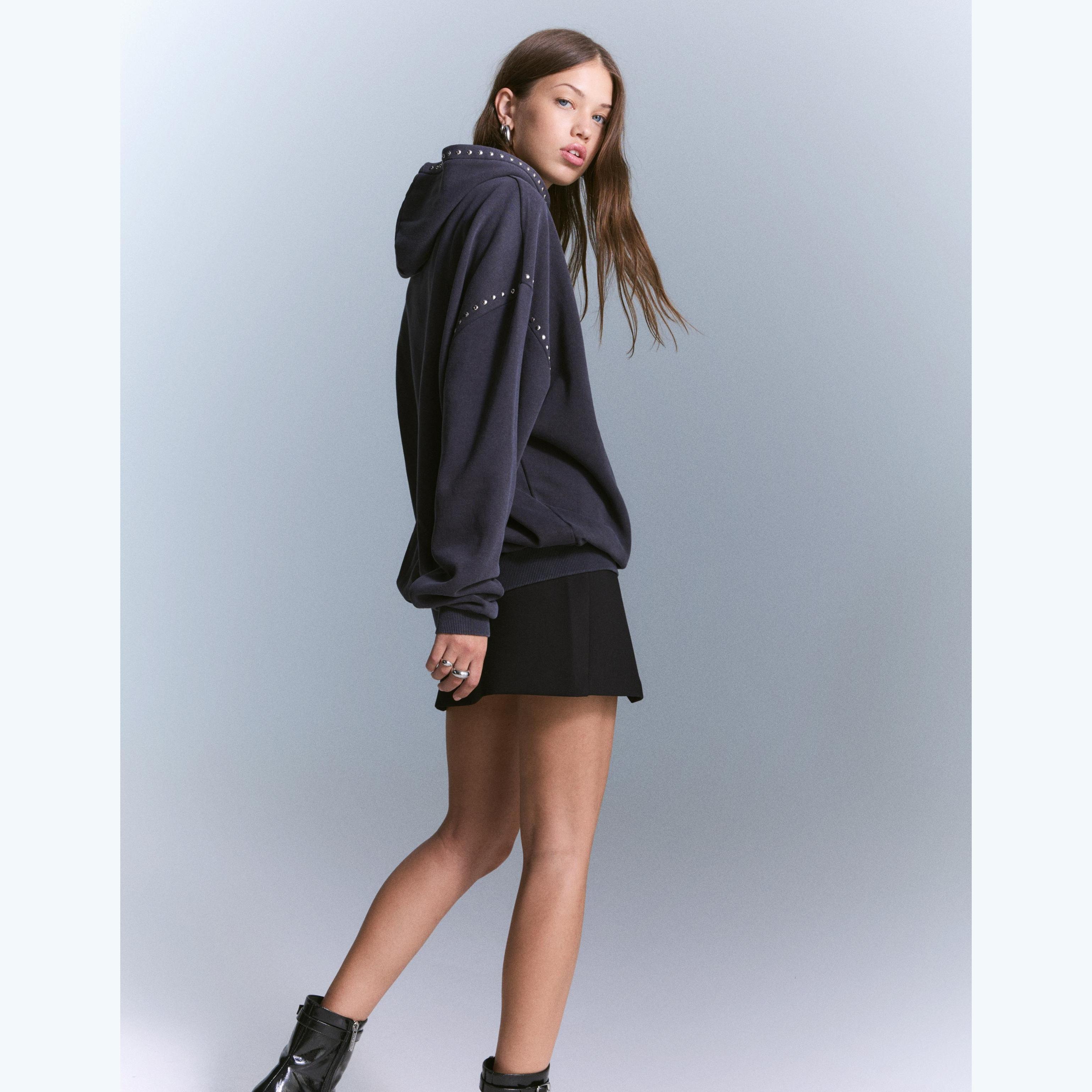 تميّزي بإطلالة شبابية جريئة وعصرية مع هذا الهودي الأوفرسايز من مجموعة BSK Teen لدى Bershka. تصميمه الفضفاض وتفاصيل المسامير المعدنية تضيف لمسة روك أنيقة، بينما يمنحك اللون الرمادي الغامق حيادية مثالية للتنسيق اليومي.