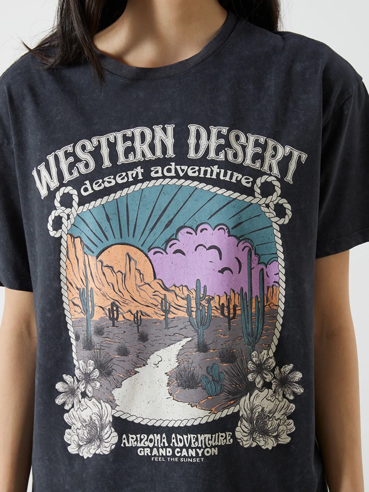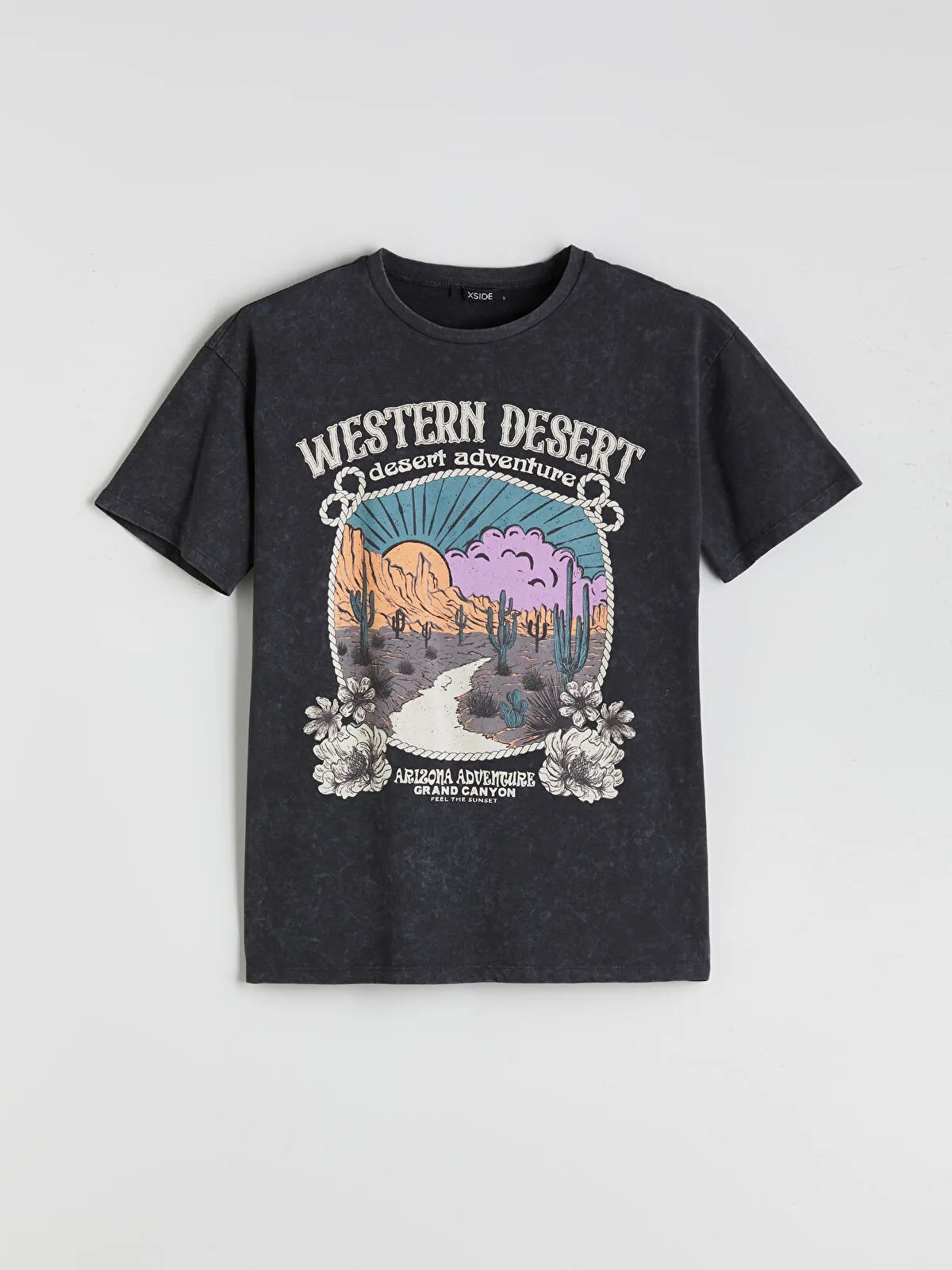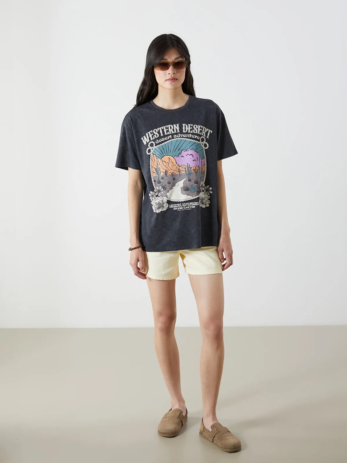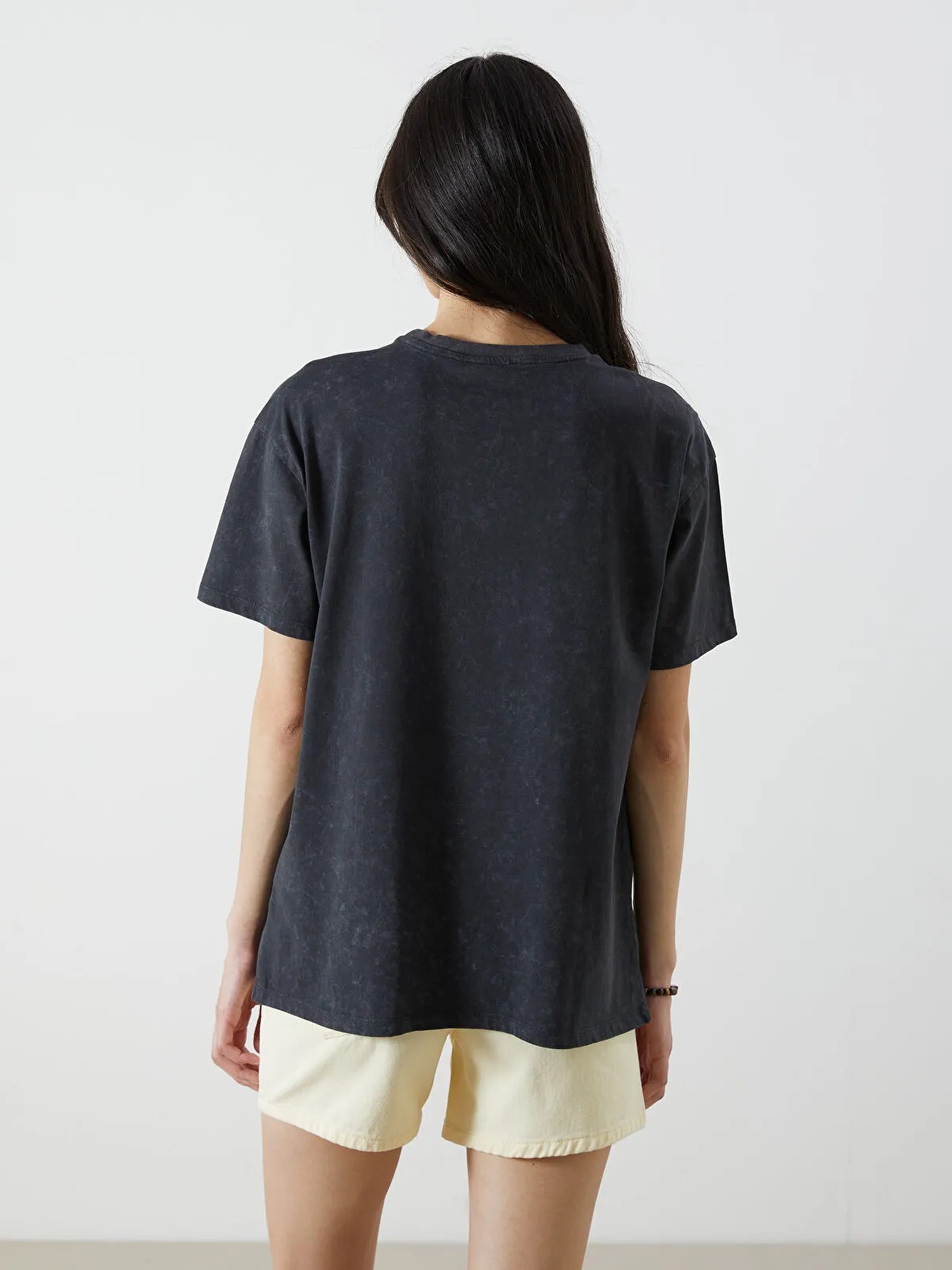تيشيرت نسائي بلون أنثرسيت (رمادي داكن) أنيق، بياقة دائرية وأكمام قصيرة، مزين بطبعة عصرية تضيف لمسة شبابية وعصرية. تصميم Loose Fit يمنحك حرية حركة وراحة طوال اليوم، مثالي للأيام الكاجوال بتفاصيل بسيطة وعصرية.