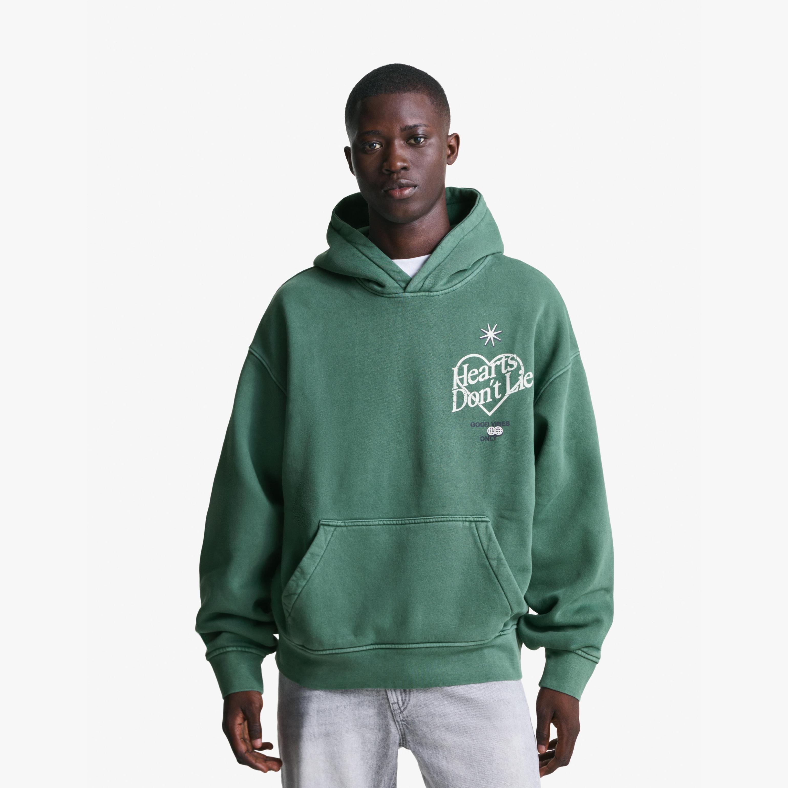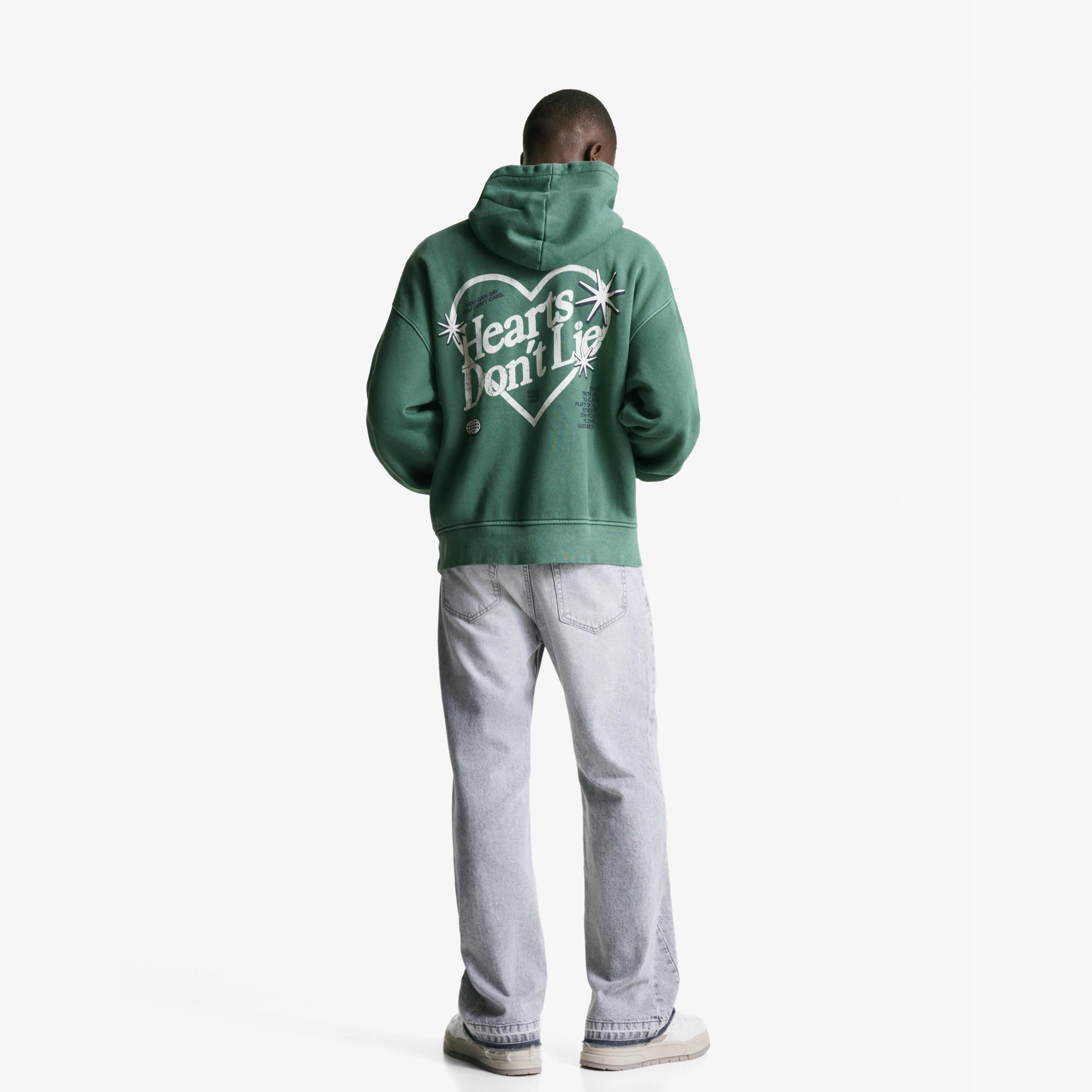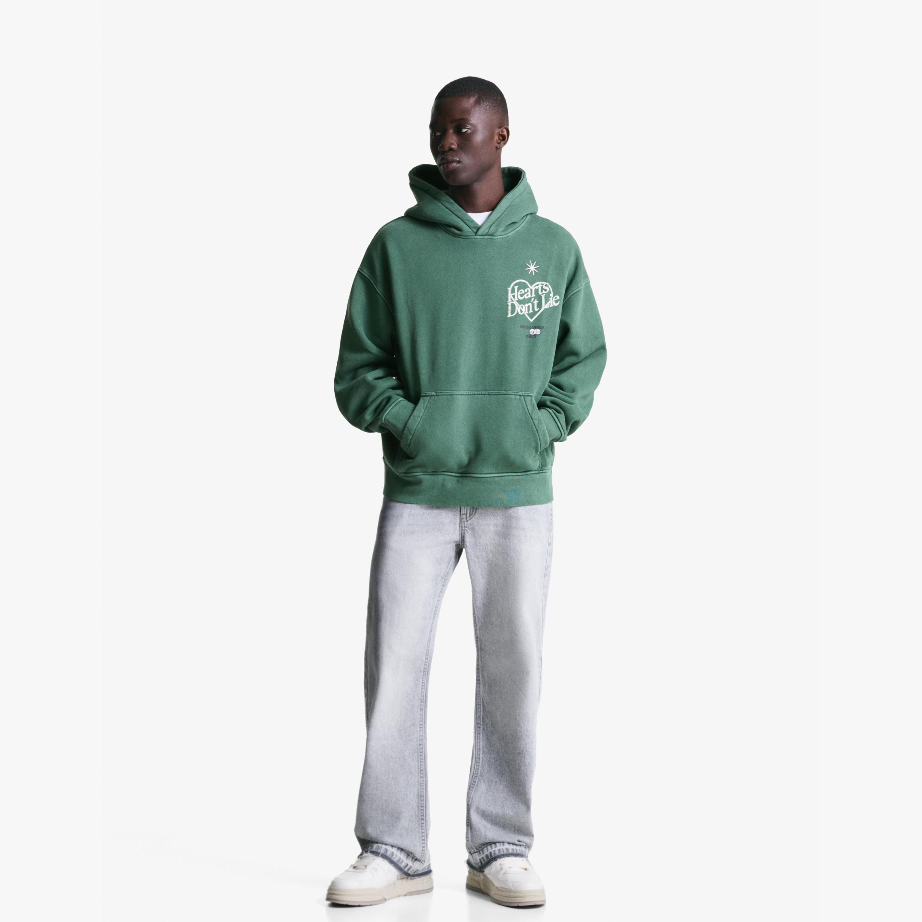 تميّز بإطلالة فنية غير تقليدية مع هذا السويت شيرت من Bershka المصمم بطبعة أمامية وتأثير باهت يمنحك مظهرًا عصريًا ومريحًا. اللون الأخضر يضفي لمسة طبيعية هادئة، والخامة المختلطة توفر نعومة مثالية ومرونة للارتداء اليومي.
