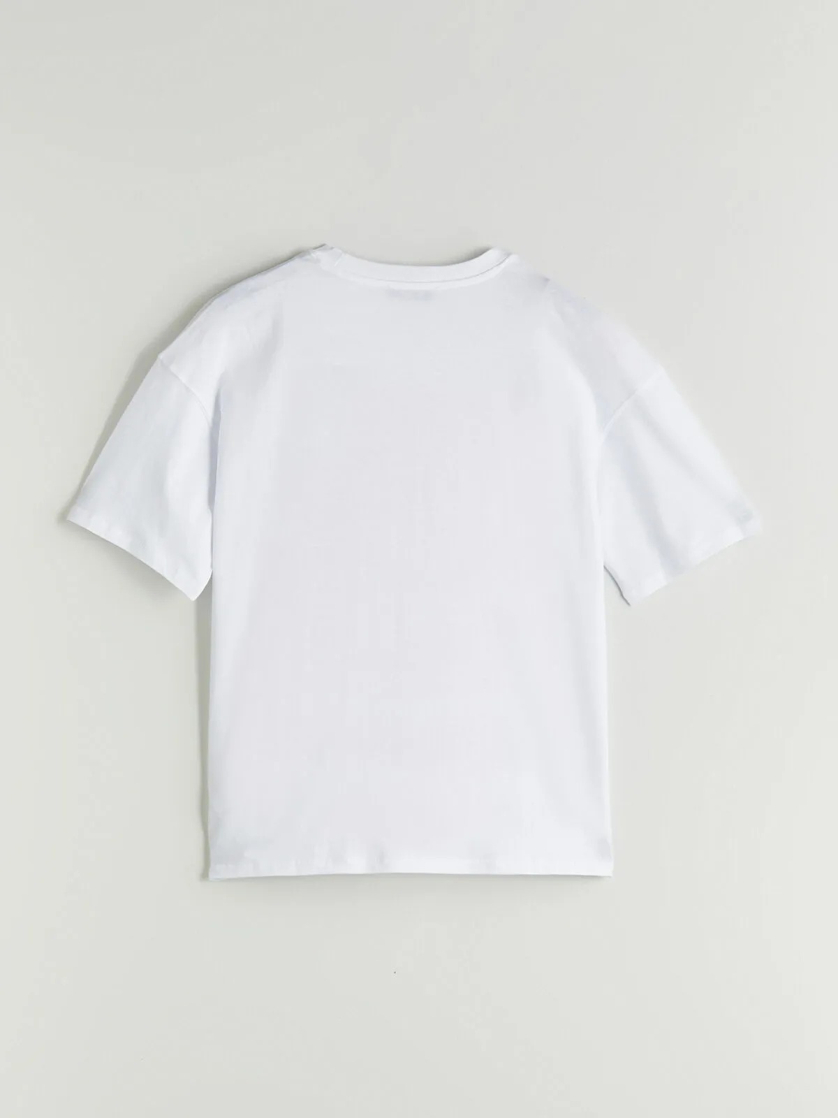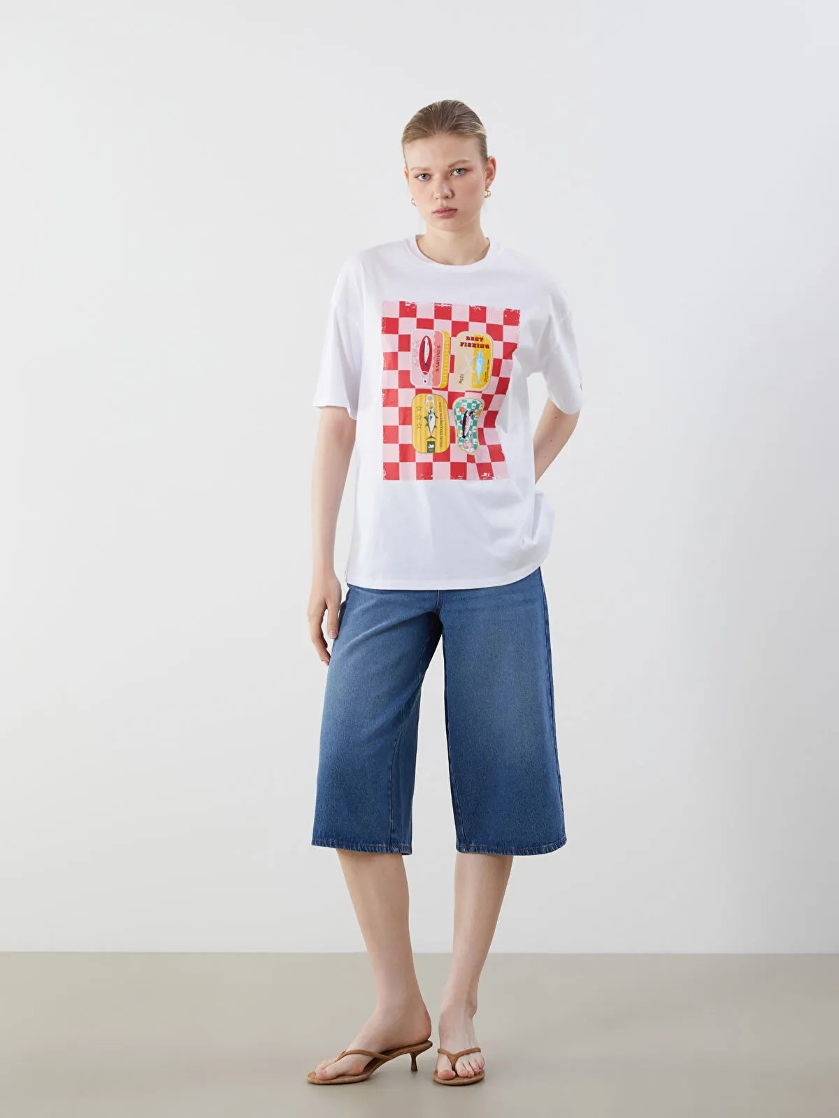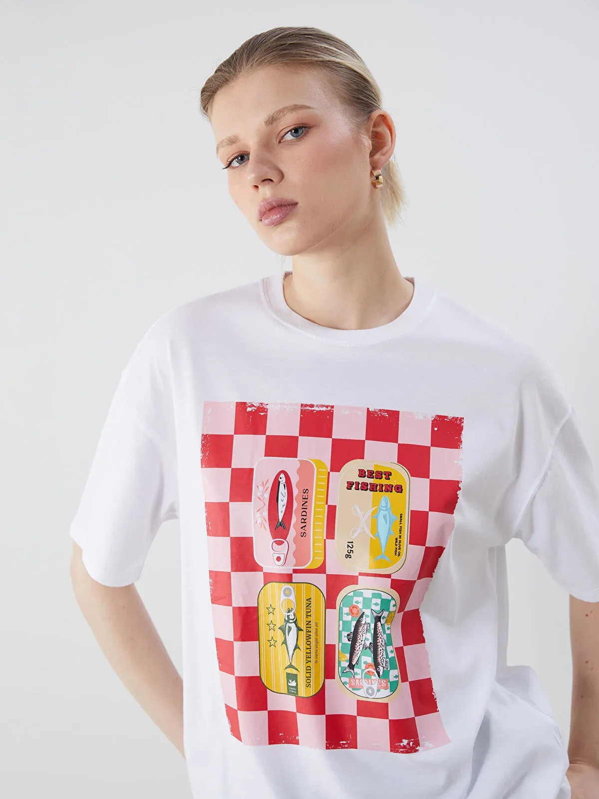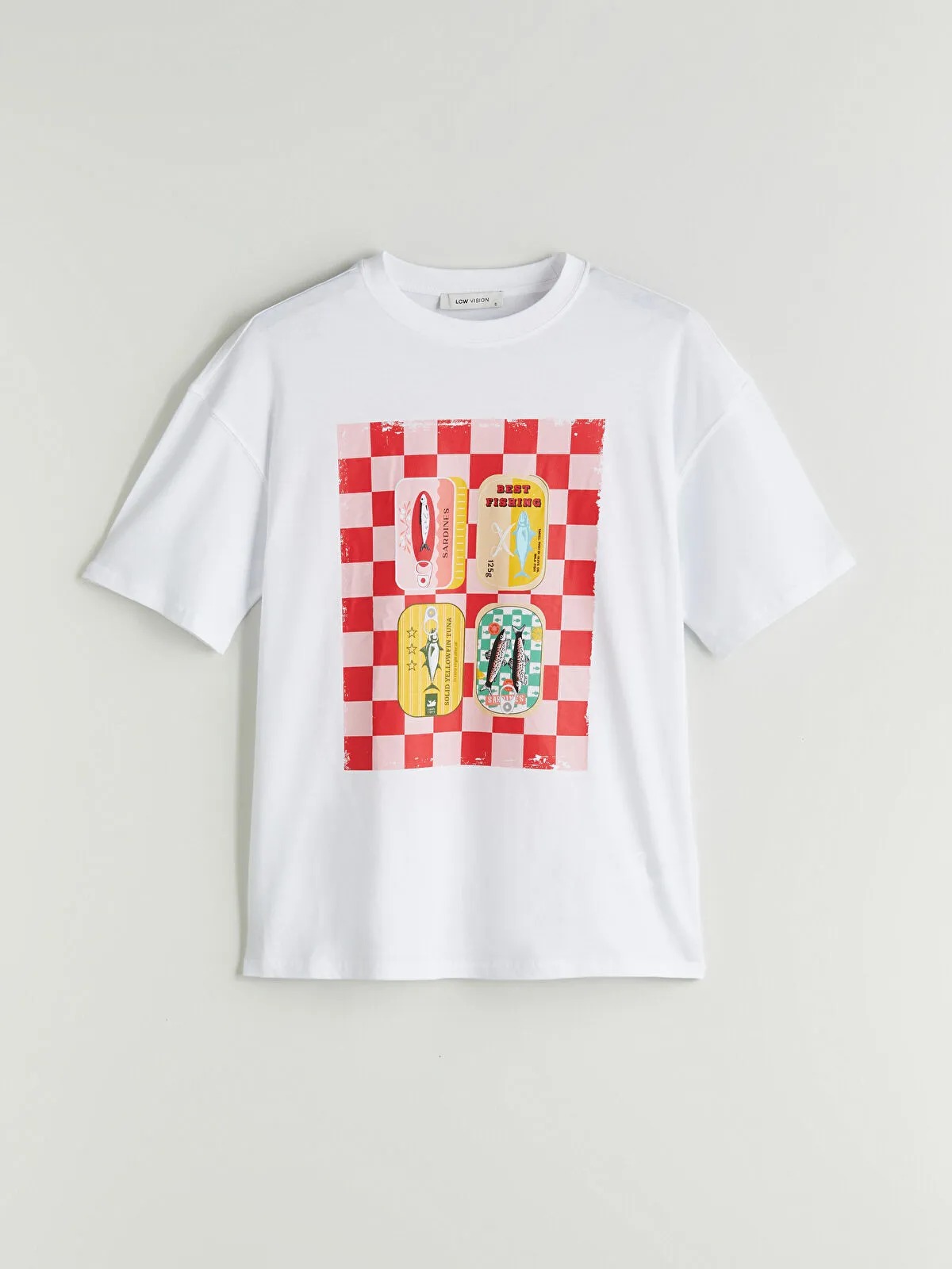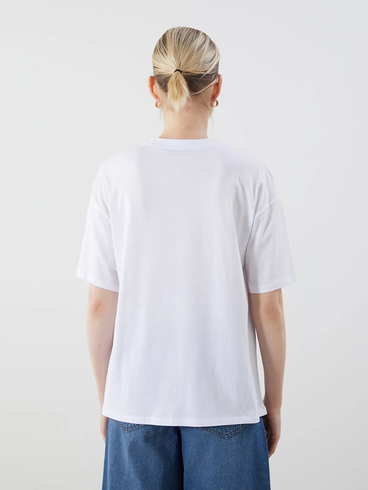 تيشيرت نسائي بلون أبيض ناصع، بياقة دائرية قصيرة وأكمام قصيرة، مزين بطبعة عصرية أمامية تعزز الإطلالة الكاجوال. تصميم Oversize يمنح حرية حركة وراحة طوال اليوم، مثالي للمظهر اليومي الواسع والمريح.