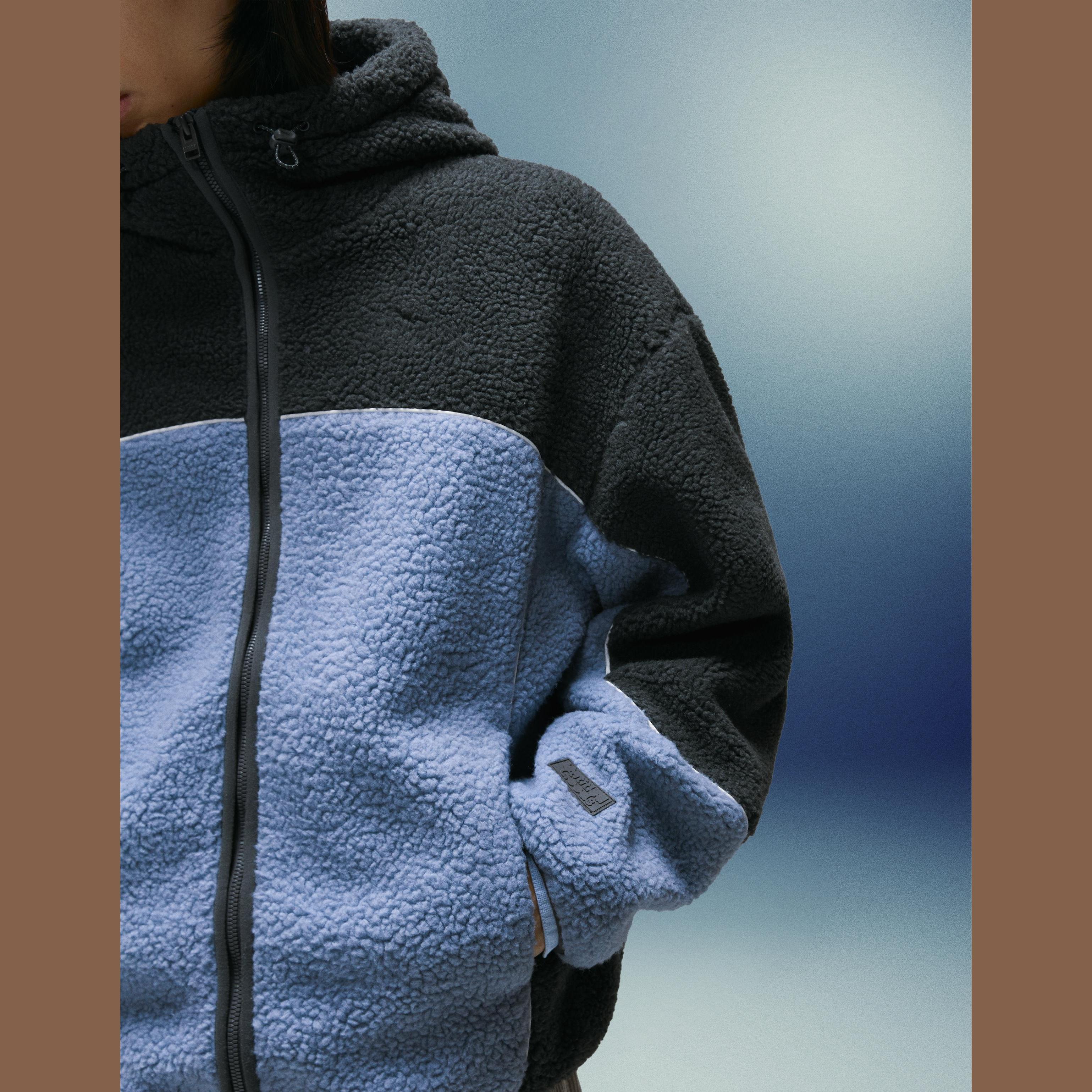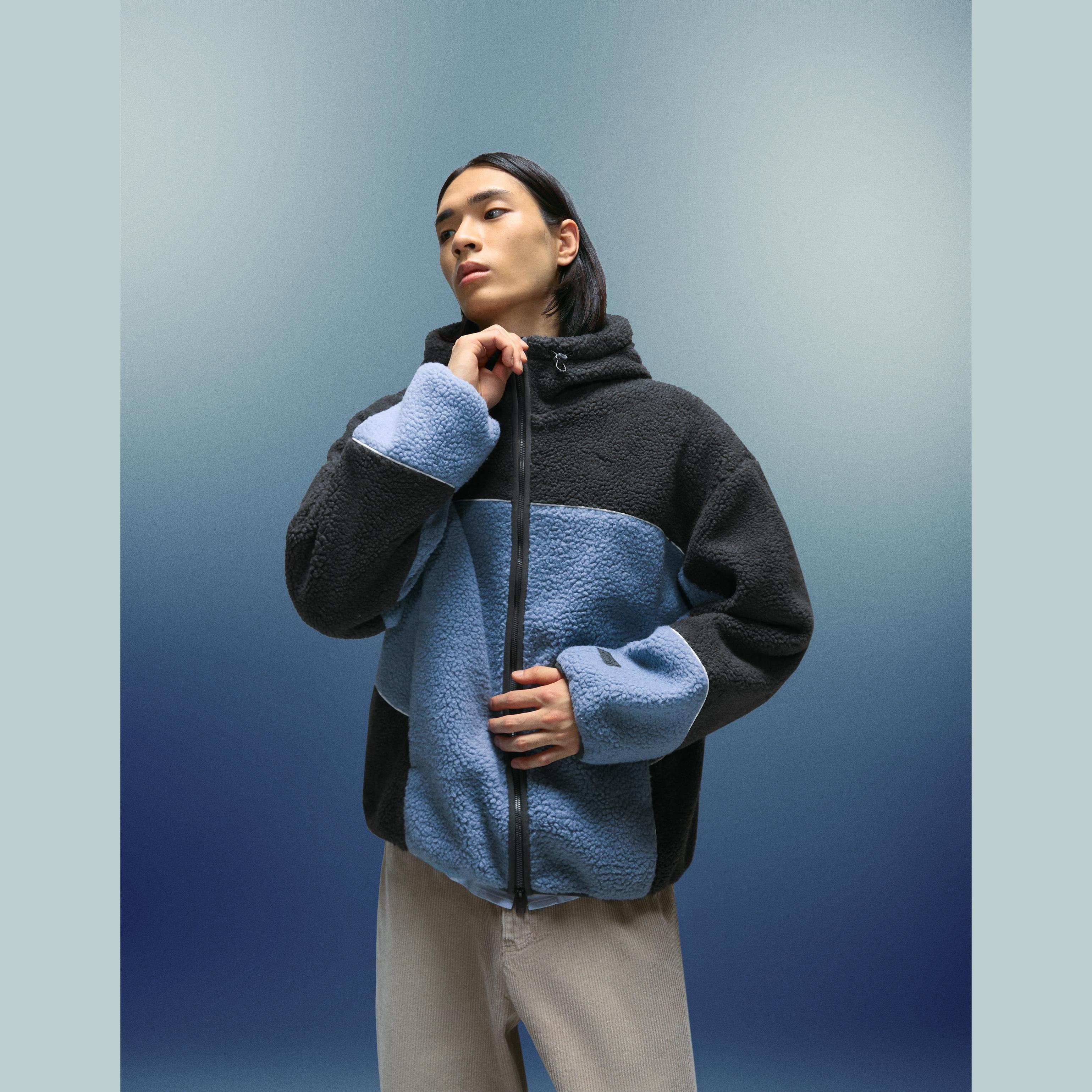 - النوع: جاكيت شيرلينغ صناعي بأكمام طويلة، سحاب أمامي كامل، وياقة بارزة