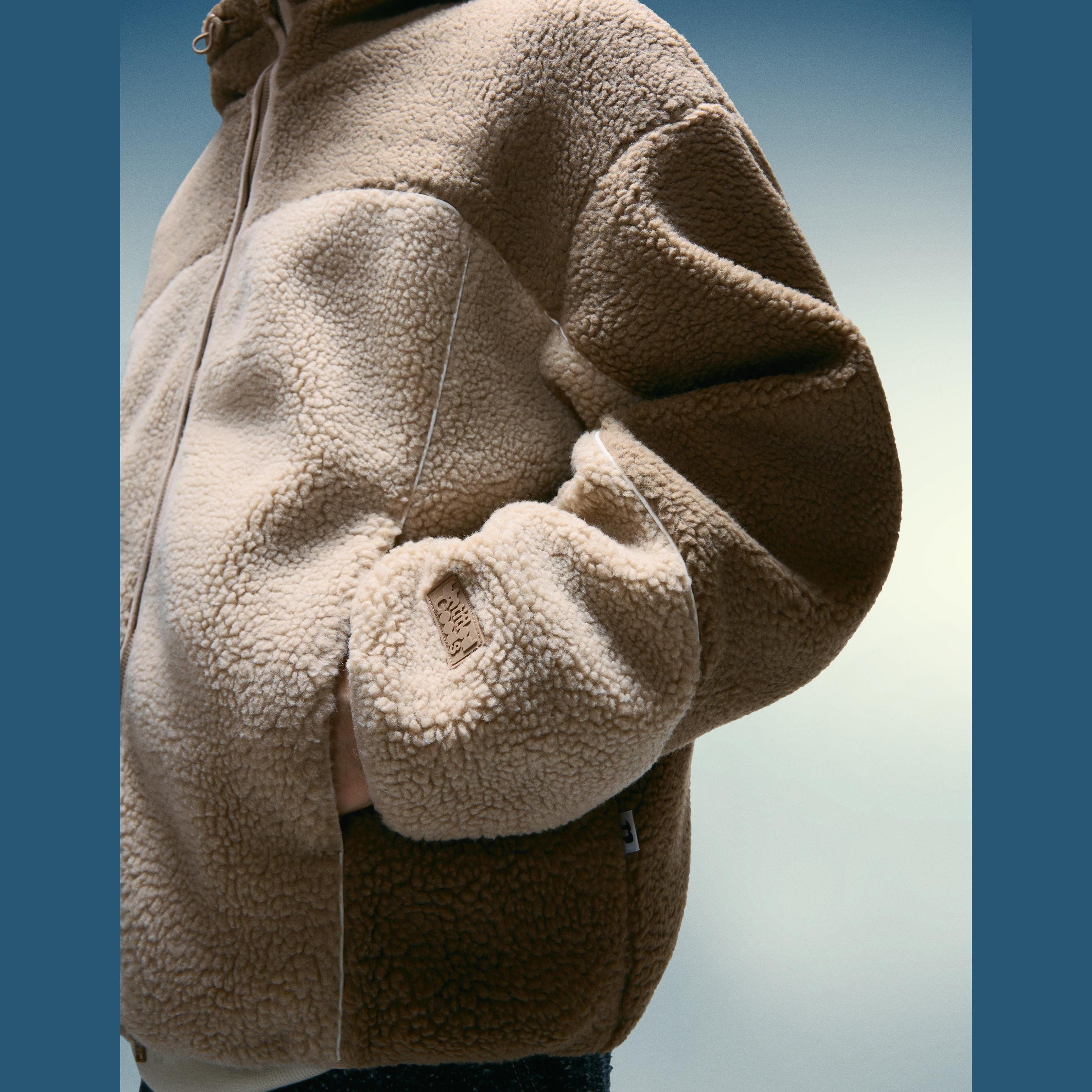- النوع: جاكيت شيرلينغ صناعي بأكمام طويلة، سحاب أمامي كامل، وياقة بارزة