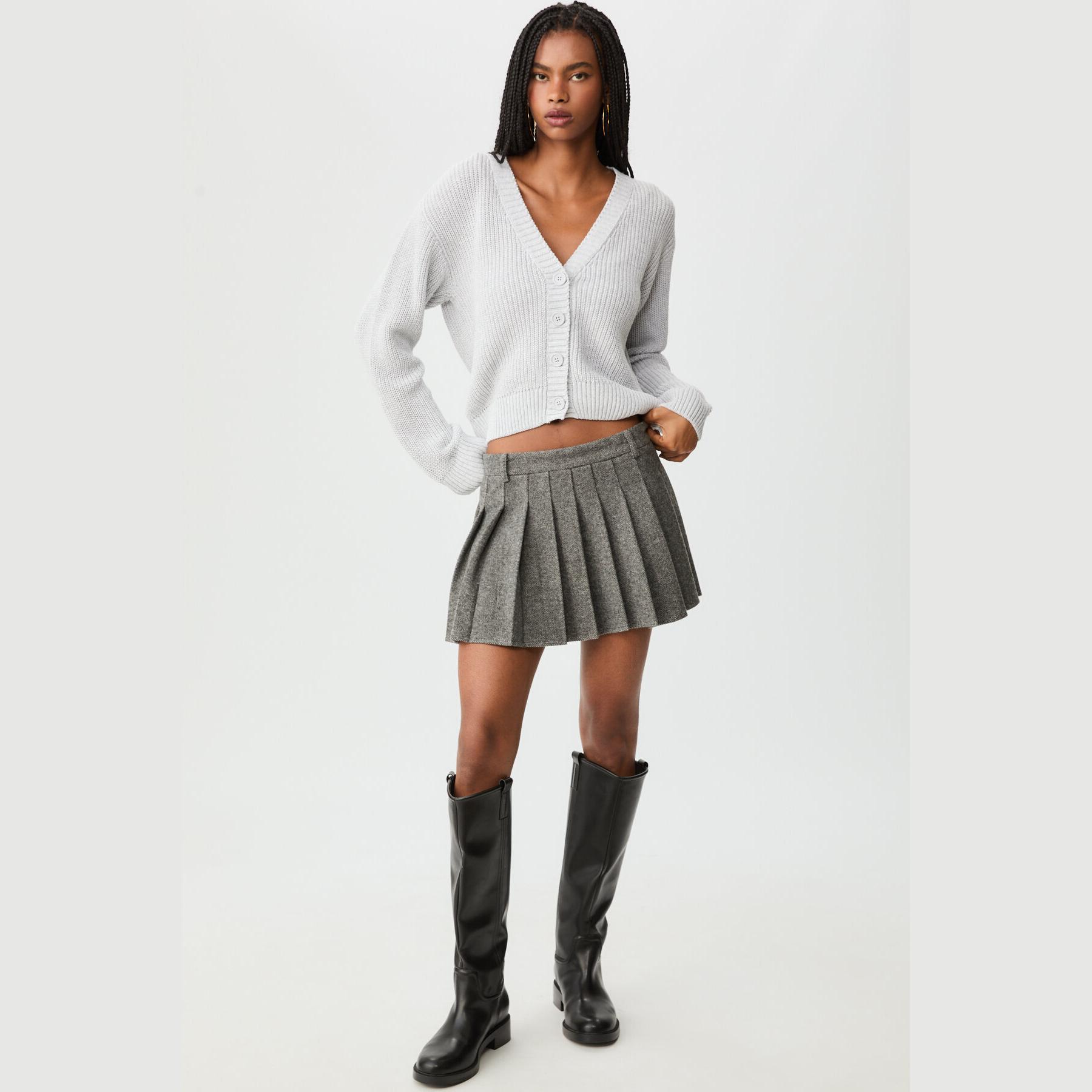 كارديغان قصير من Stradivarius مصنوع من خامة تريكو ناعمة تجمع بين البوليستر والقطن، بتصميم V-ياقة وأزرار أمامية بلون متناسق، مع تفاصيل Ribana تضيف لمسة أنيقة وعصرية، مثالي للإطلالات اليومية أو الكاجوال.
