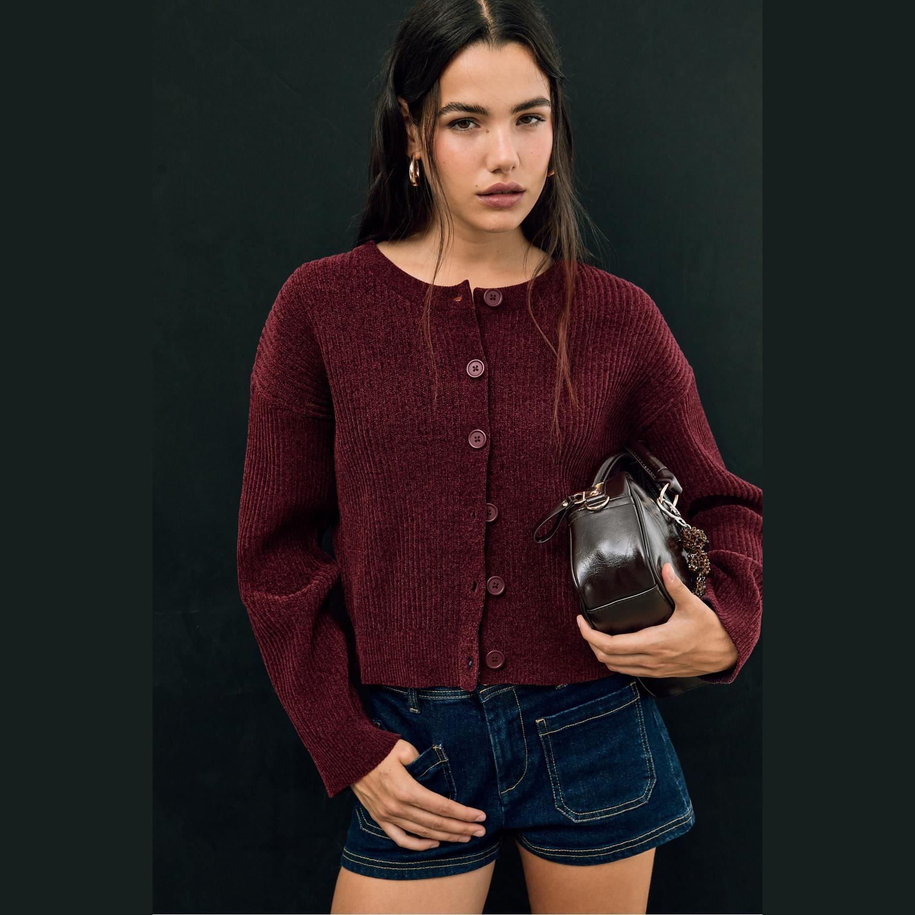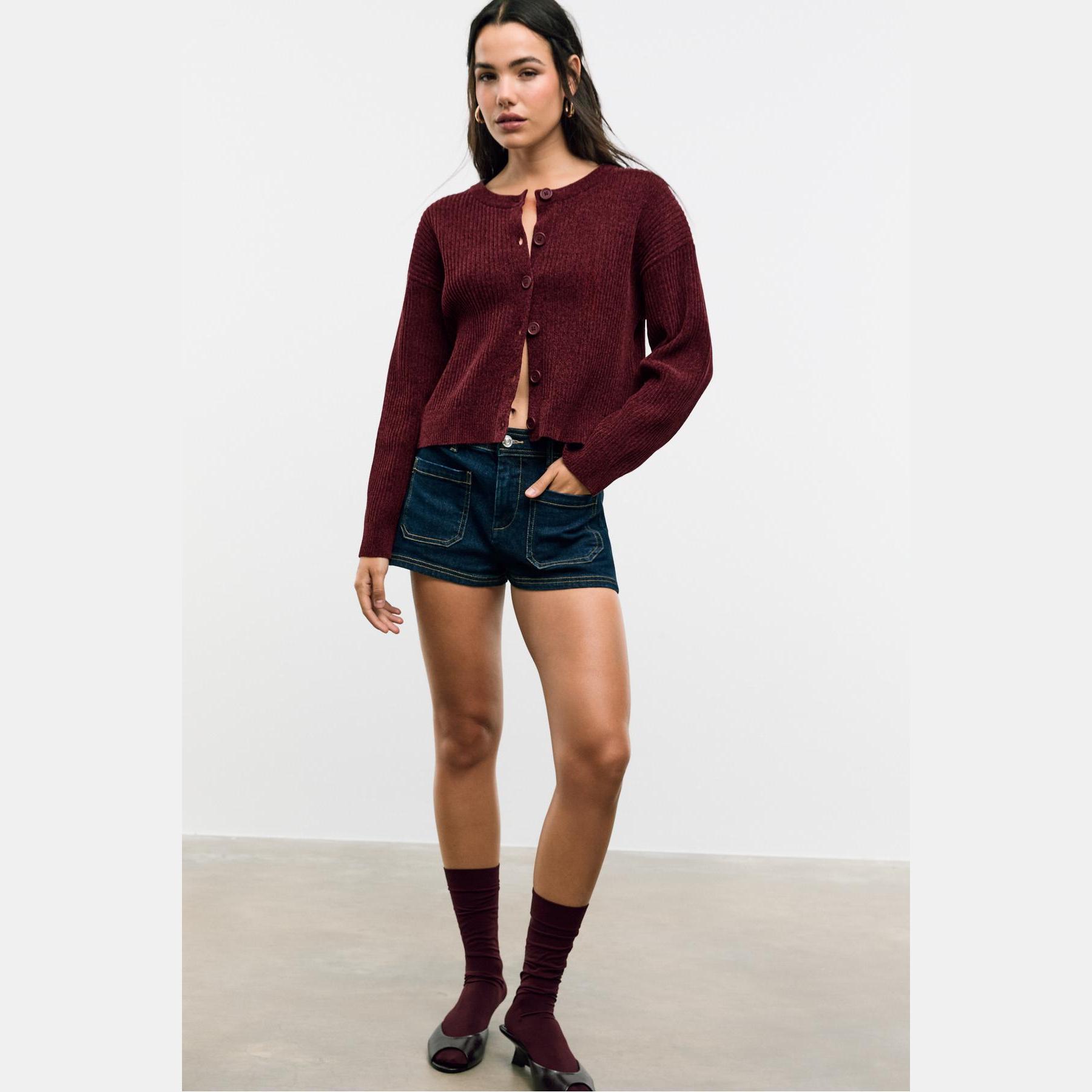 جاكيت تريكو من Stradivarius مصنوع من خامة ناعمة بملمس مضلع، بتصميم مستقيم وياقة دائرية، مزود بأزرار أمامية بلون متناسق، يمنح مظهرًا أنيقًا ومريحًا يناسب مختلف الإطلالات اليومية.