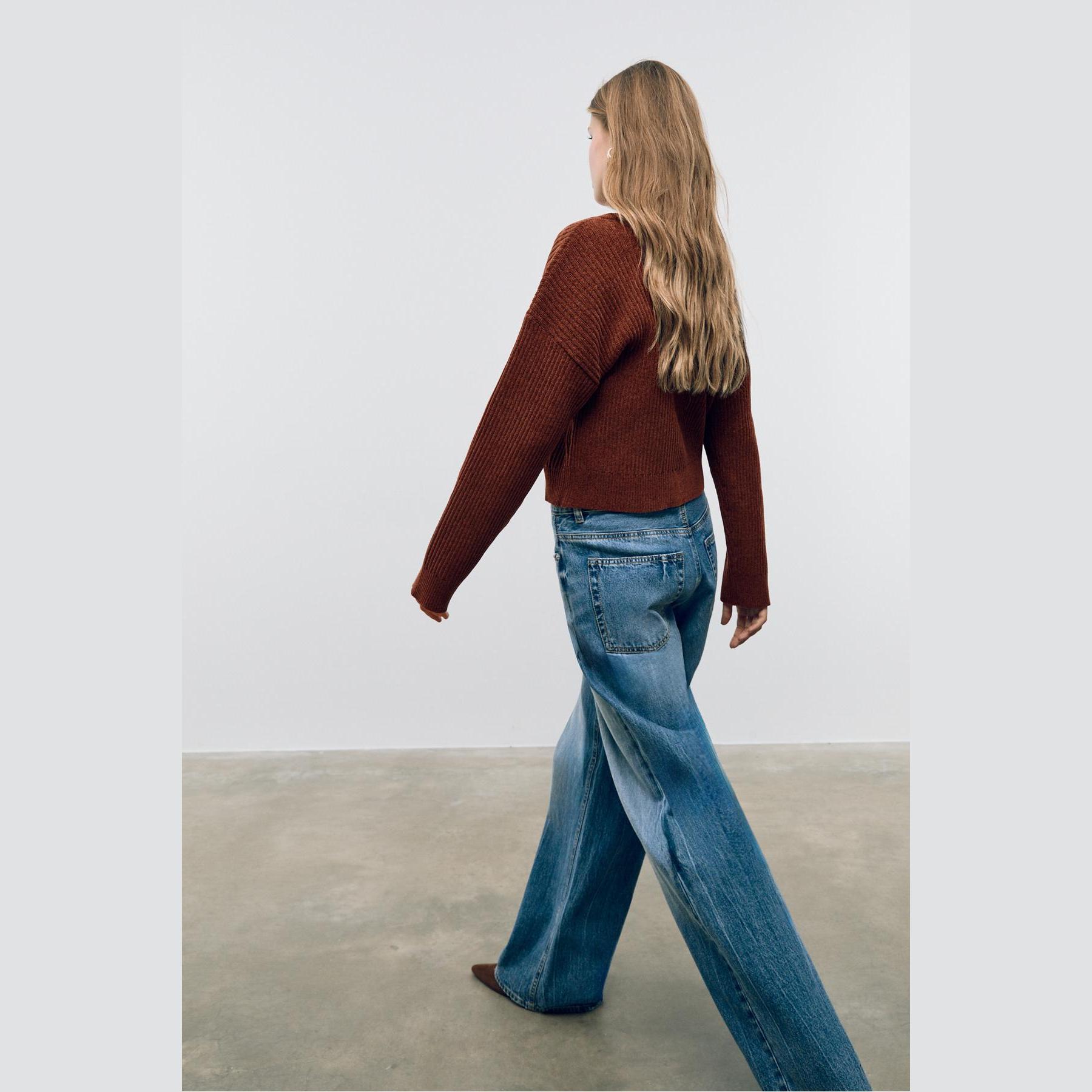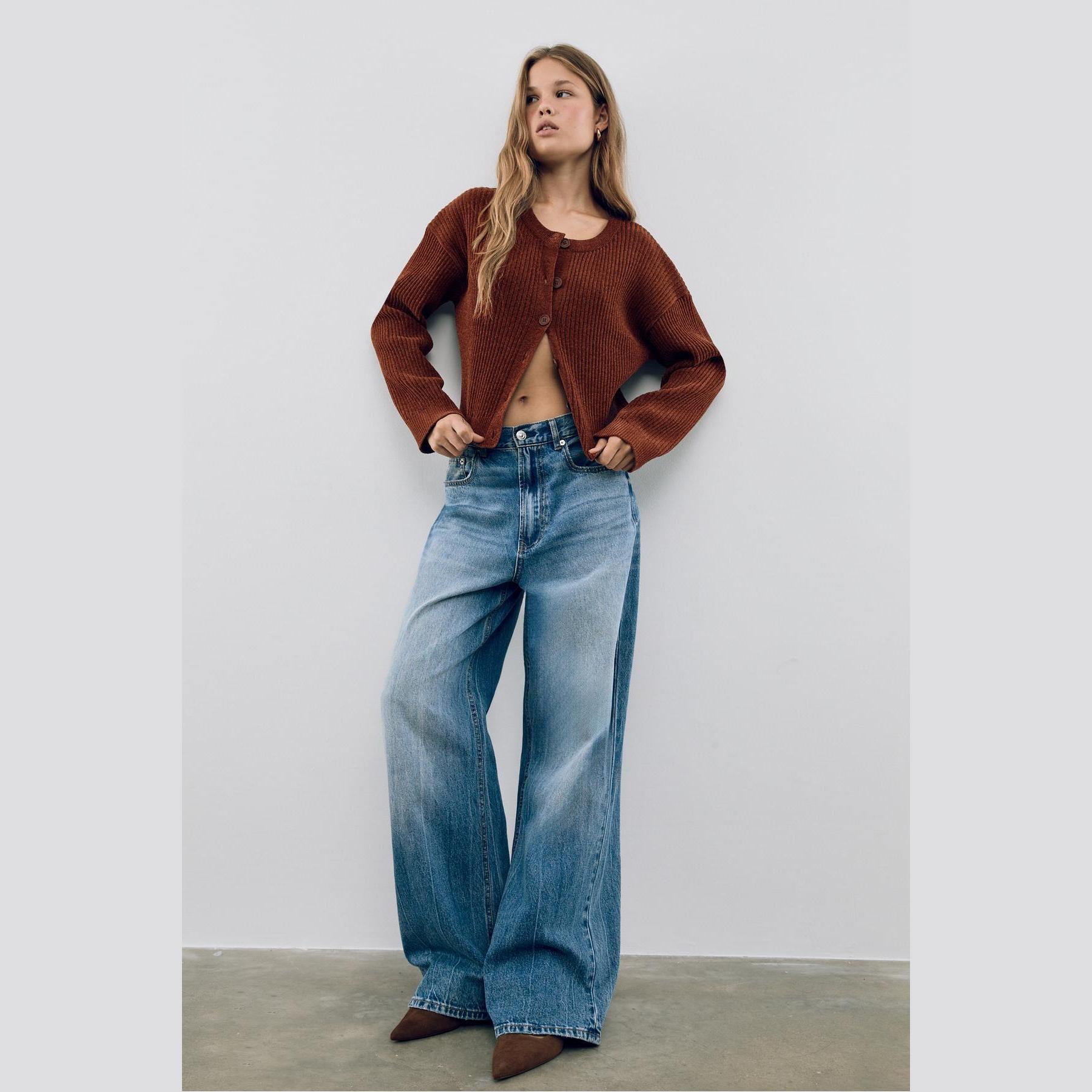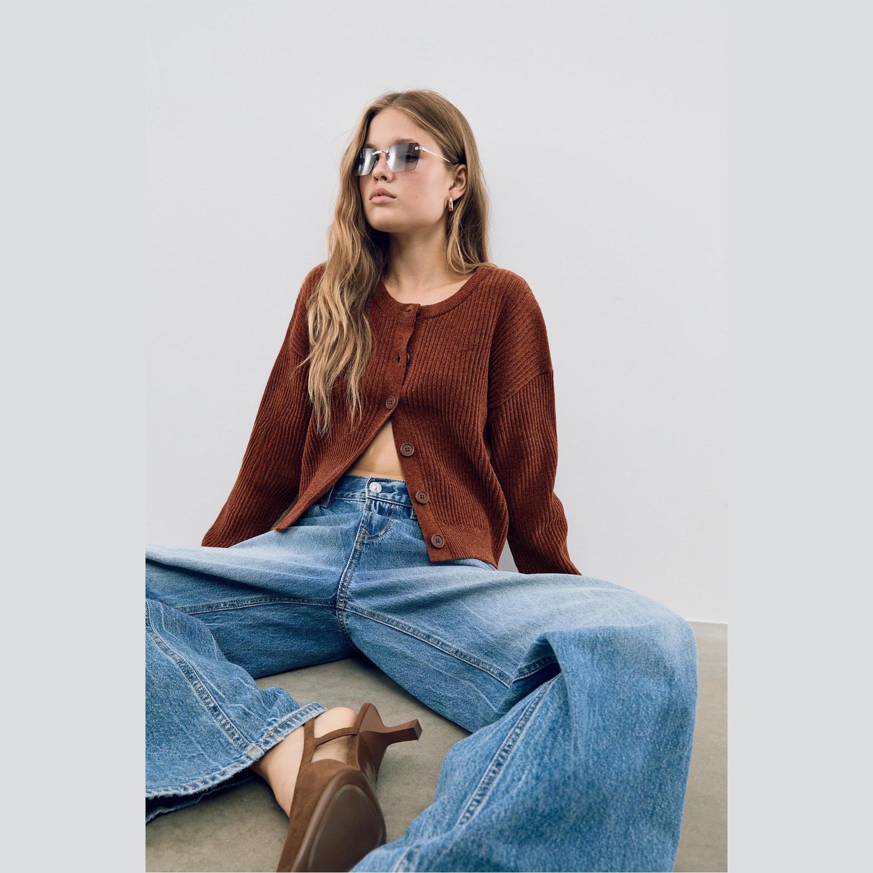 جاكيت تريكو أنيق من Stradivarius مصنوع من خامة بوليستر ناعمة بملمس مضلع، بتصميم Comfort Fit وياقة دائرية، مزود بأزرار أمامية بلون متناسق، يمنح مظهرًا عصريًا ومريحًا يناسب مختلف الإطلالات اليومية.