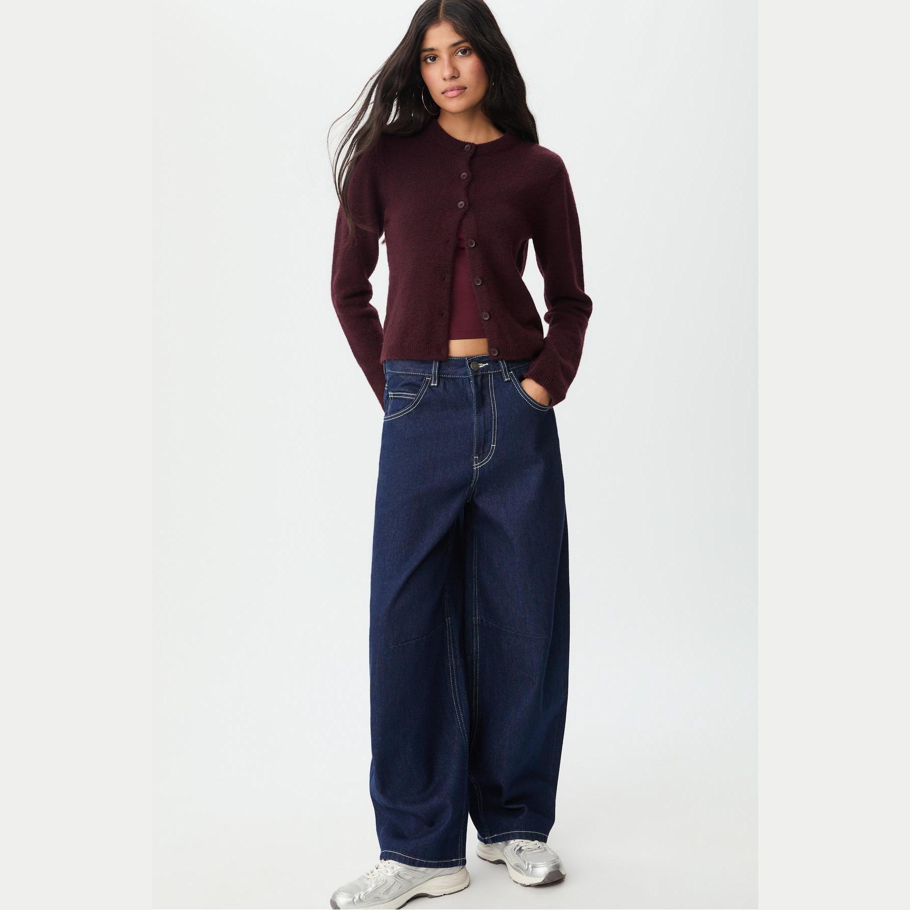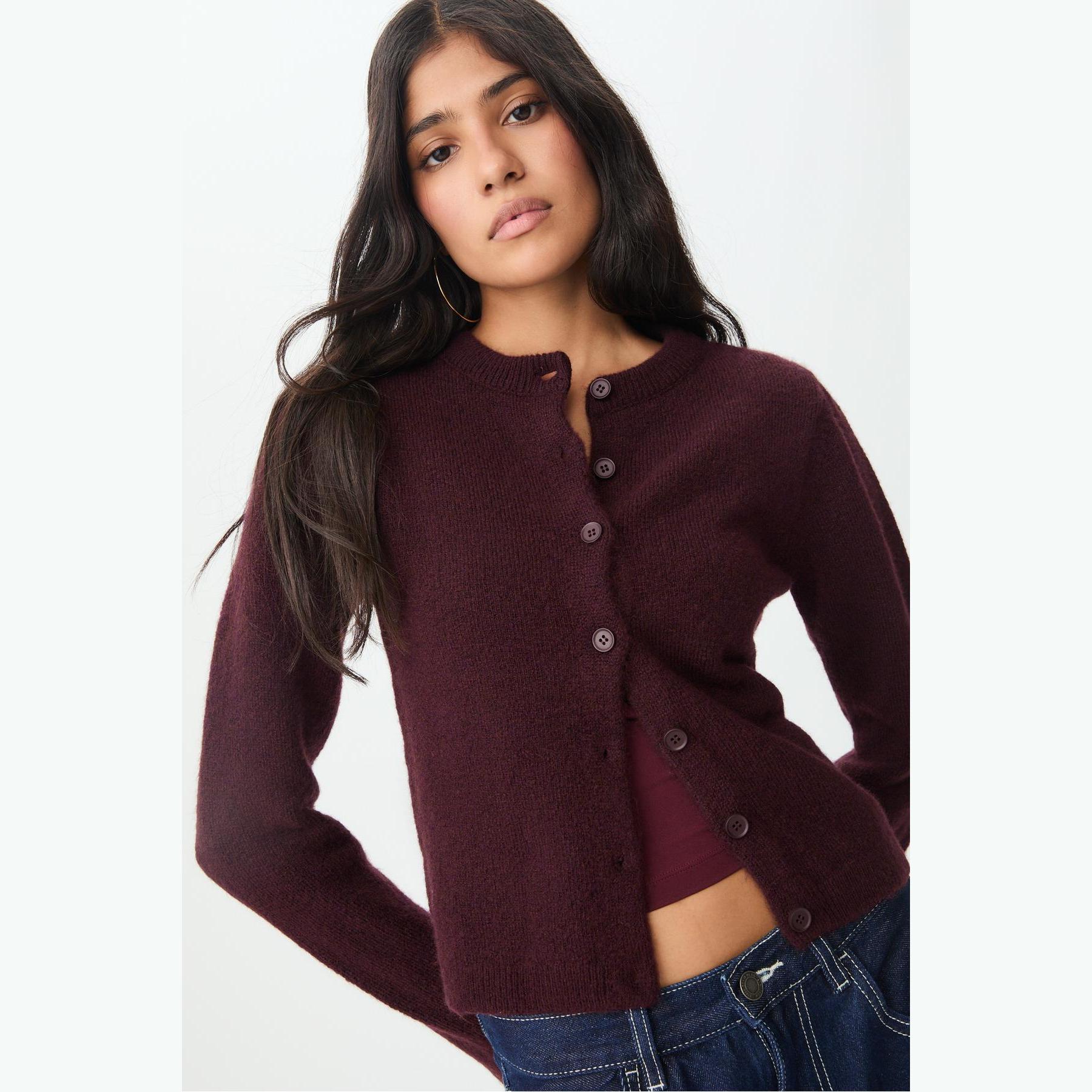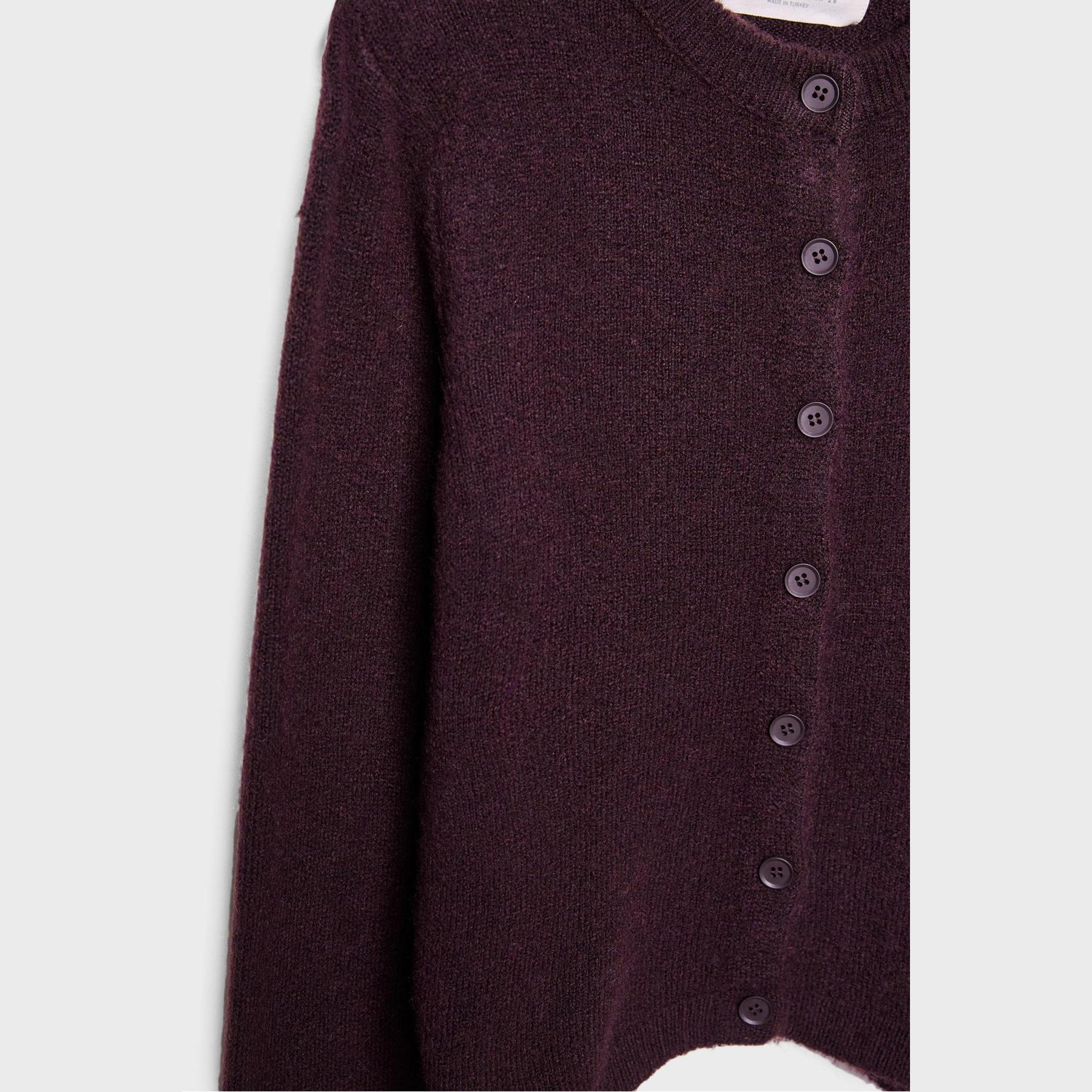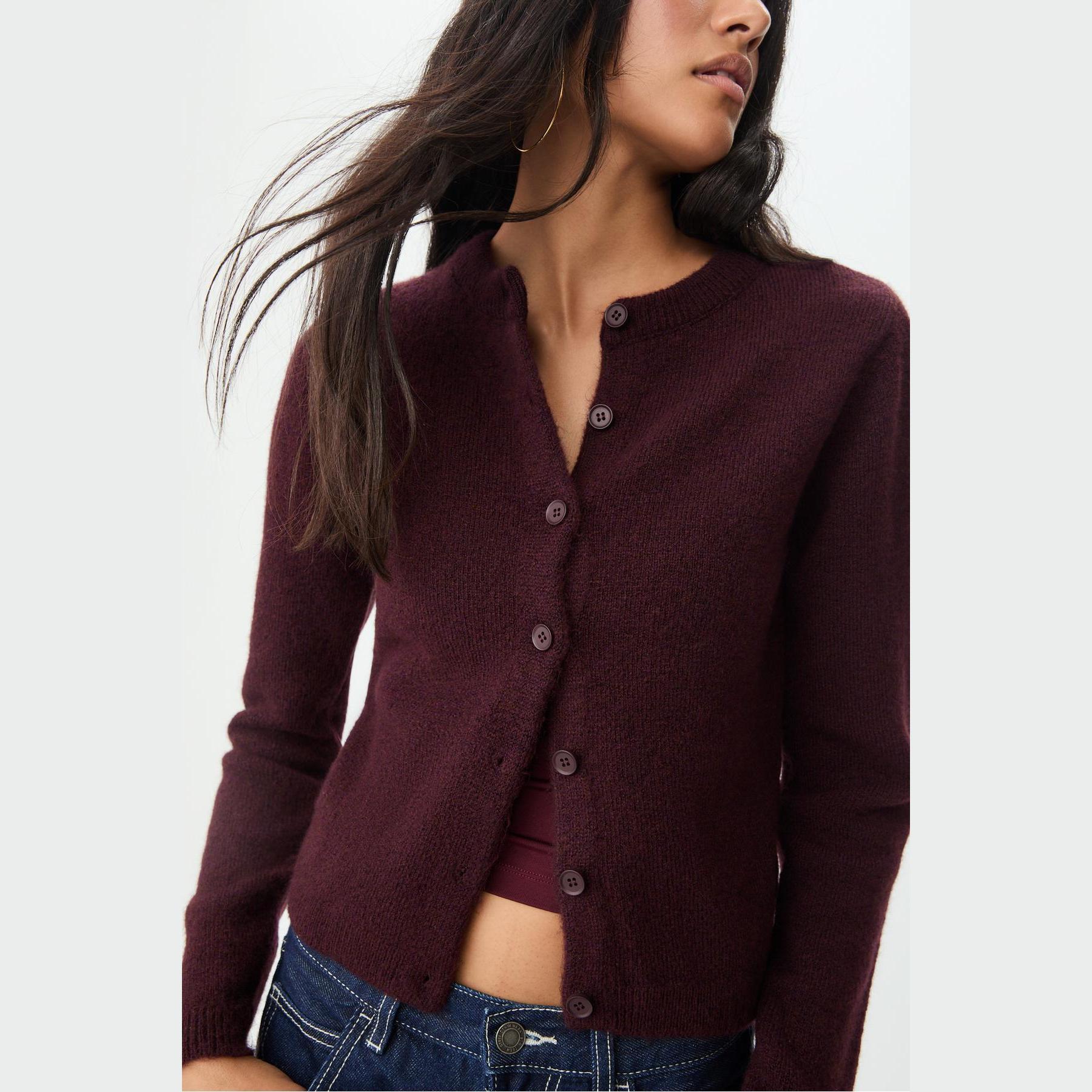 جاكيت تريكو أنيق من Stradivarius بلون بوردو، مصنوع من خامة تريكو ناعمة بتركيبة مرنة، بتصميم Comfort Fit وياقة دائرية، مزود بأزرار أمامية بلون متناسق، يمنحك إطلالة دافئة وعصرية مثالية للاستخدام اليومي.