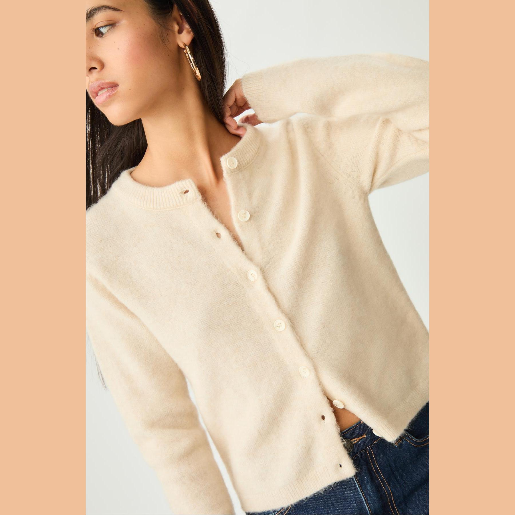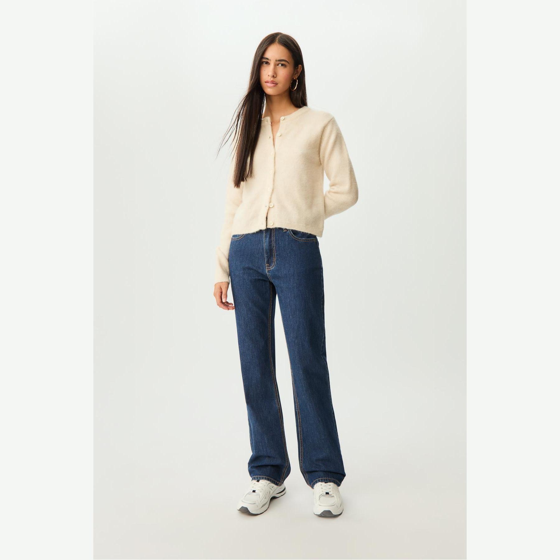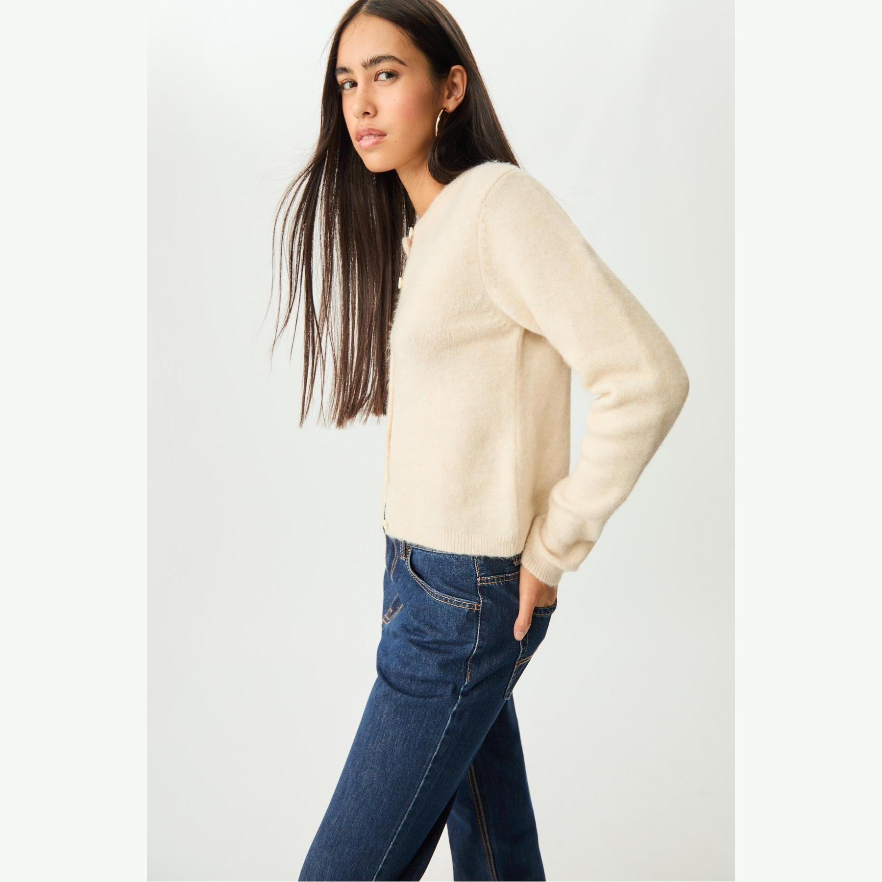 كارديغان أنيق من Stradivarius بلون إكرو، مصنوع من خامة تريكو ناعمة بتركيبة مرنة، بتصميم Comfort Fit وياقة دائرية، مزود بأزرار أمامية بلون متناسق، يمنحك إطلالة مريحة وعصرية مثالية للاستخدام اليومي.