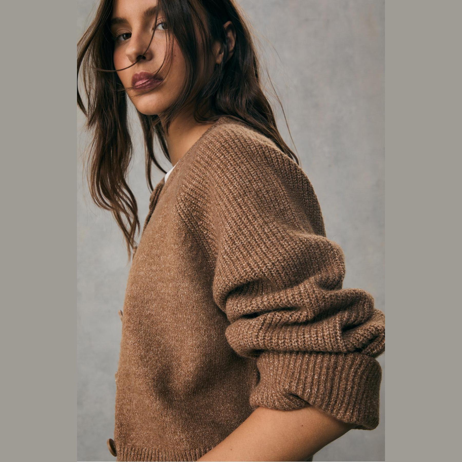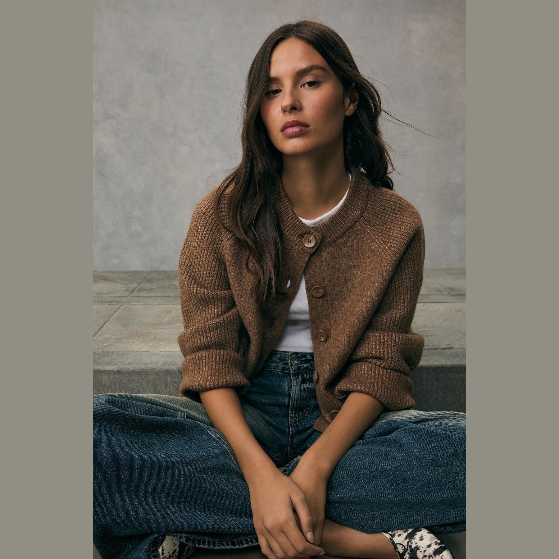 كارديغان أنيق من Stradivarius بلون كاميل دافئ، مصنوع من خامة تريكو مرنة بنقشة ضفائر، بتصميم Comfort Fit وياقة دائرية، مزود بأزرار أمامية بلون متناسق، يمنحك إطلالة كلاسيكية ومريحة مثالية للاستخدام اليومي.