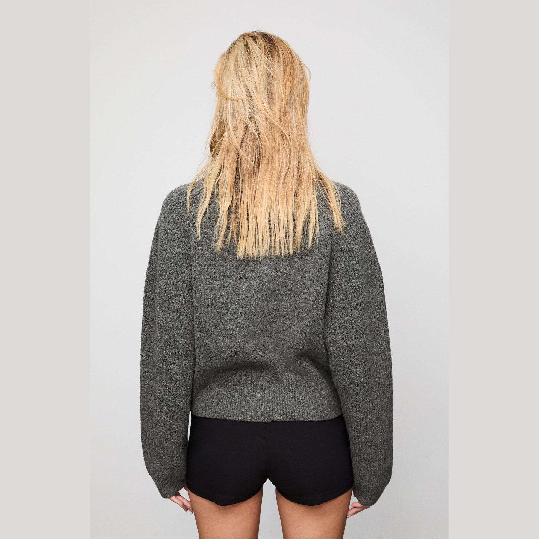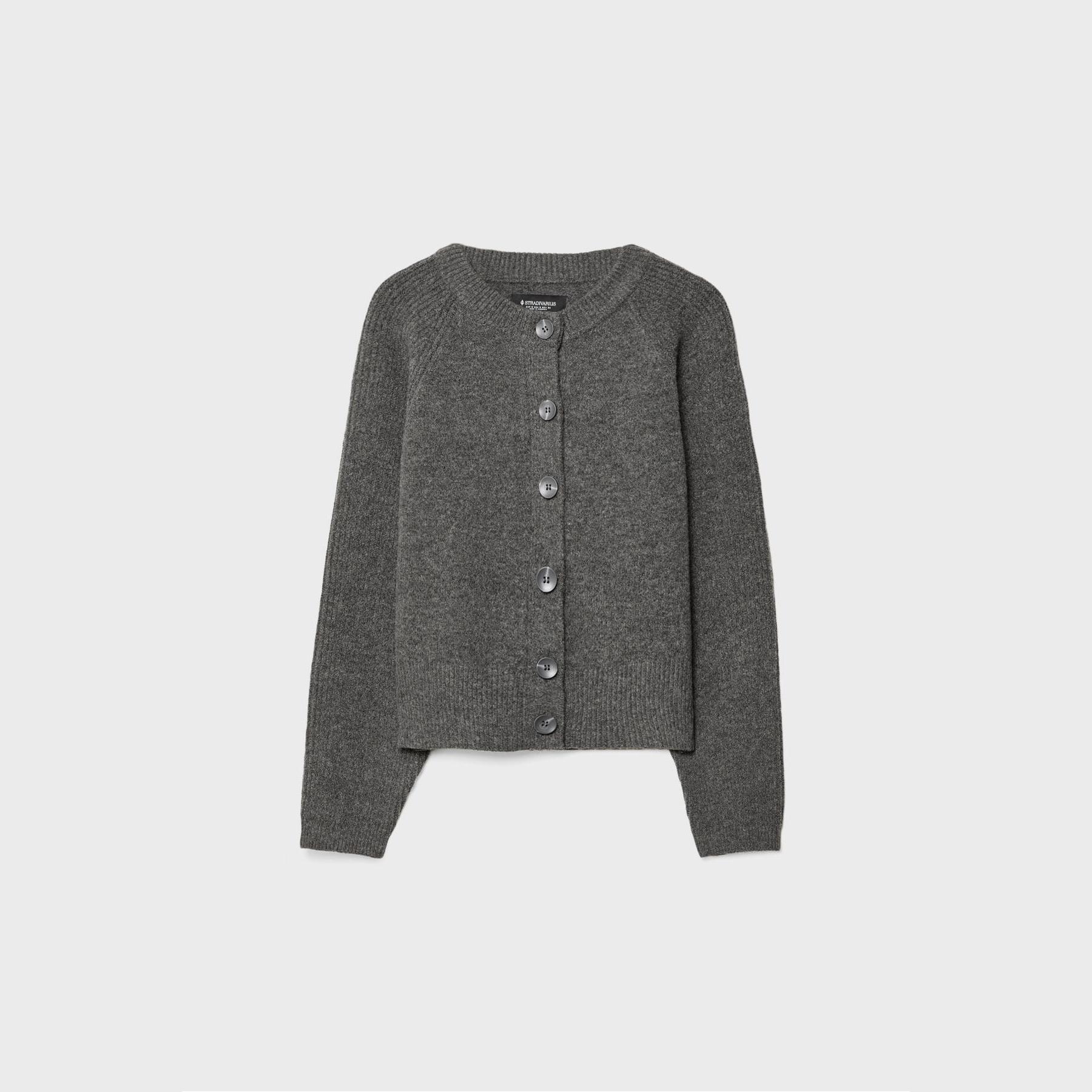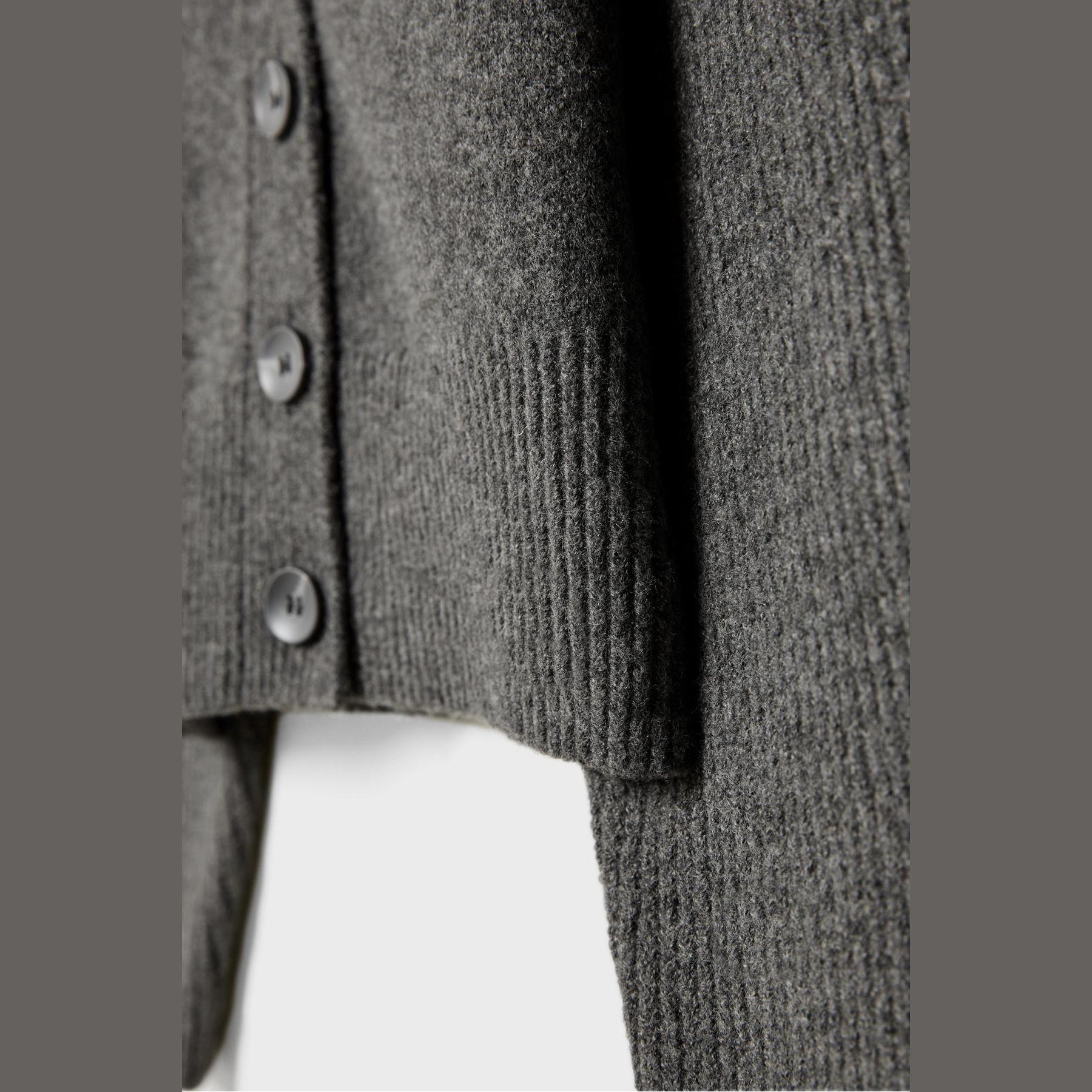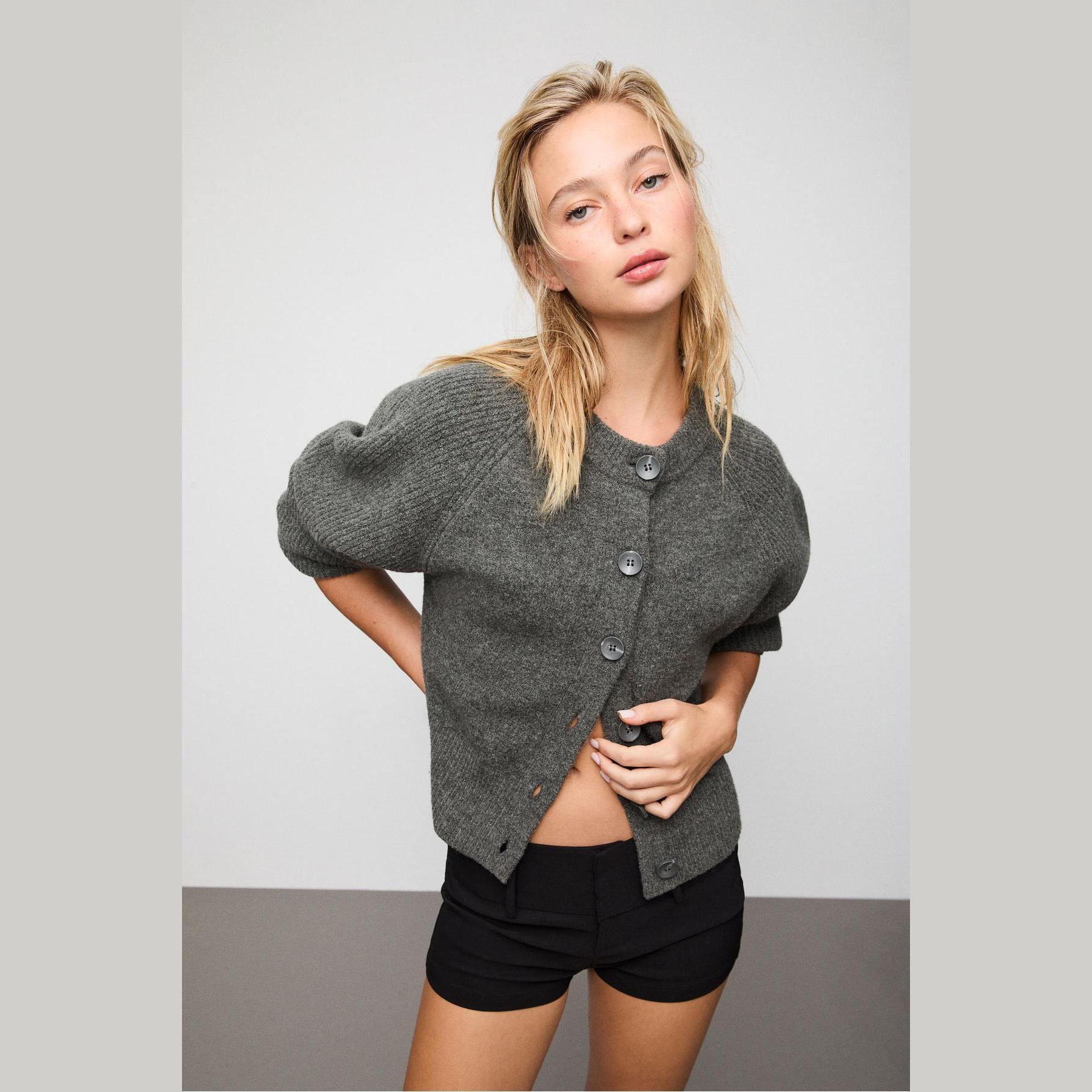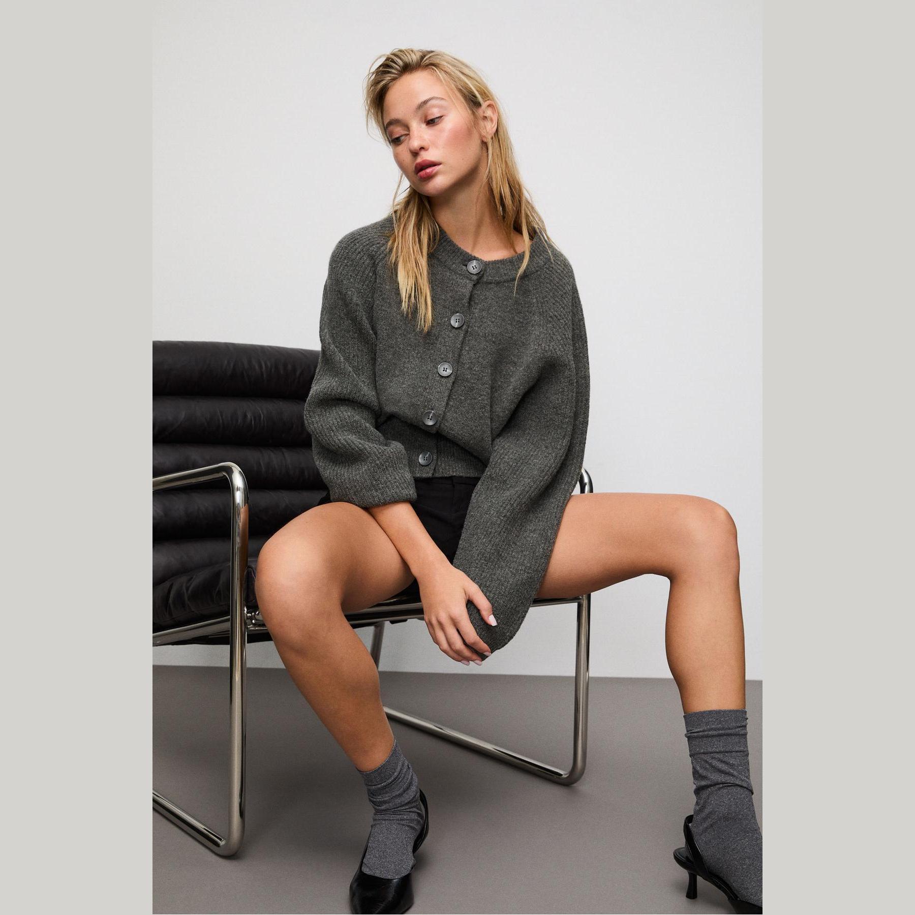 كارديغان أنيق من Stradivarius بلون رمادي غامق، مصنوع من خامة تريكو مرنة بنقشة ضفائر، بتصميم Comfort Fit وياقة دائرية، مزود بأزرار أمامية بلون متناسق، يمنحك إطلالة دافئة وعصرية مثالية للاستخدام اليومي.