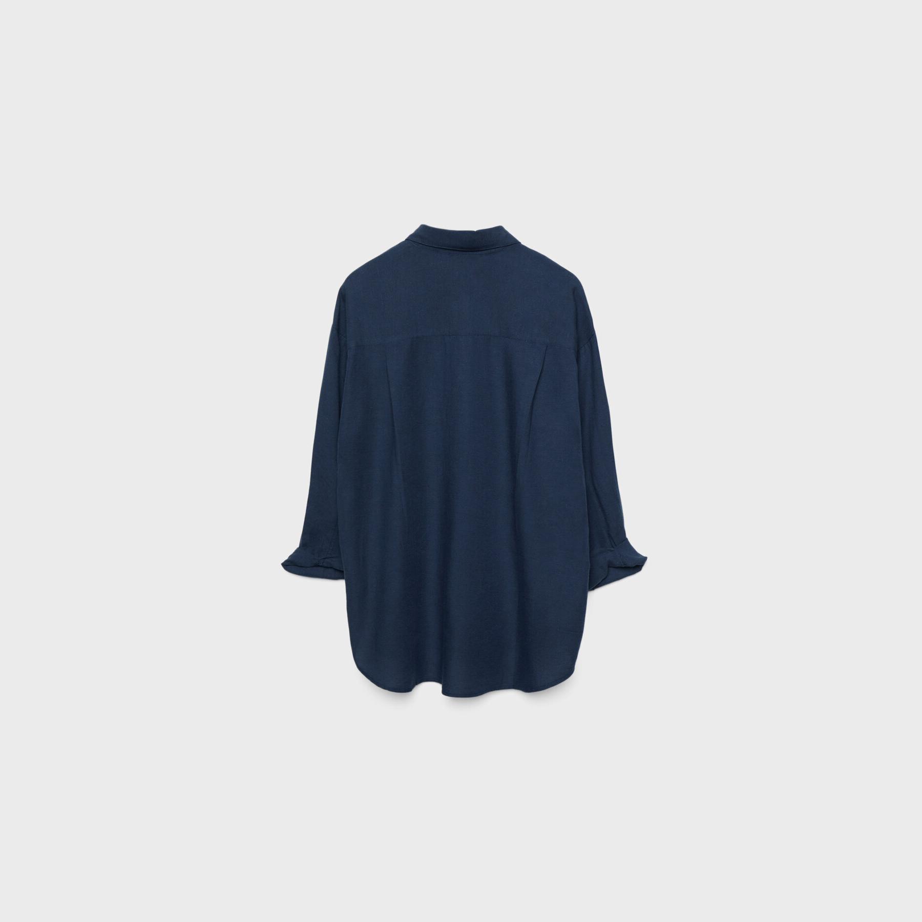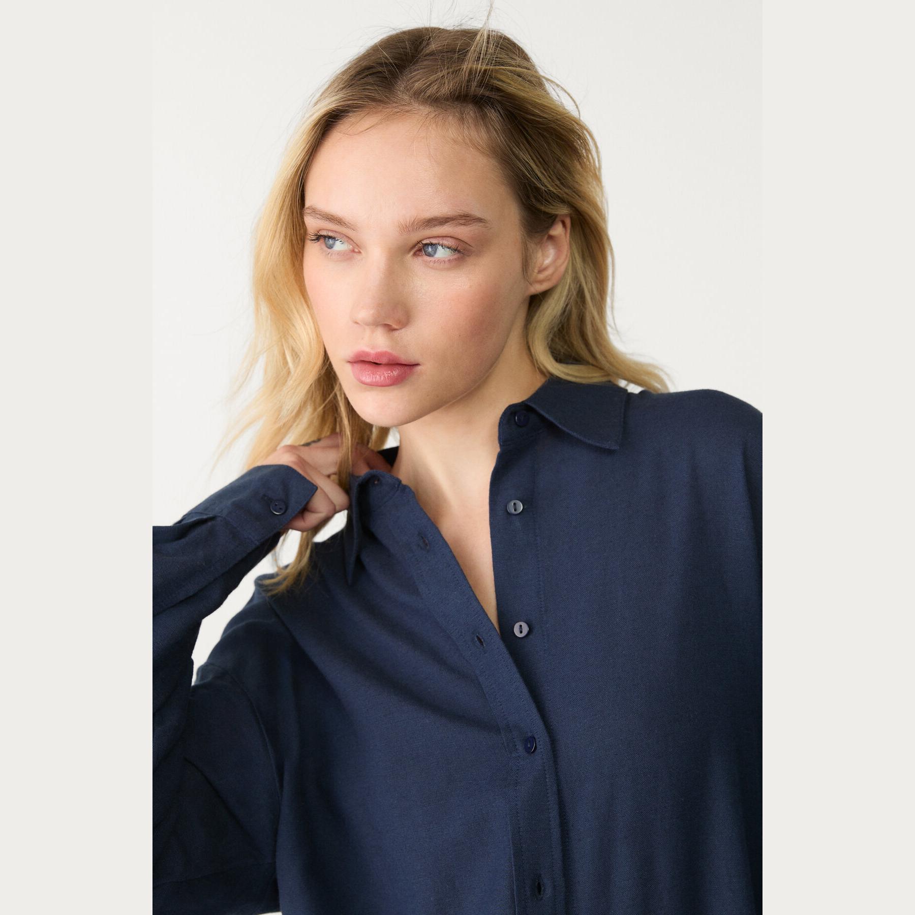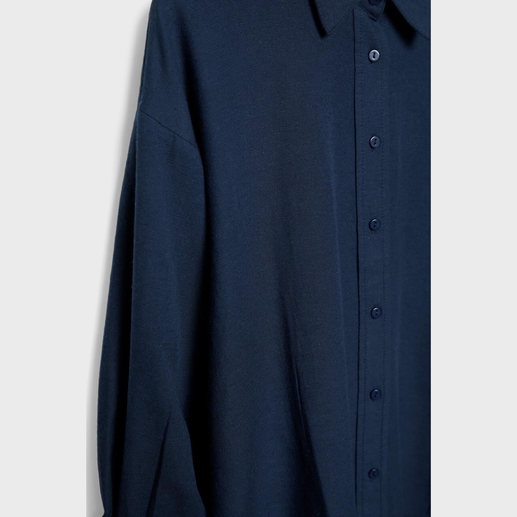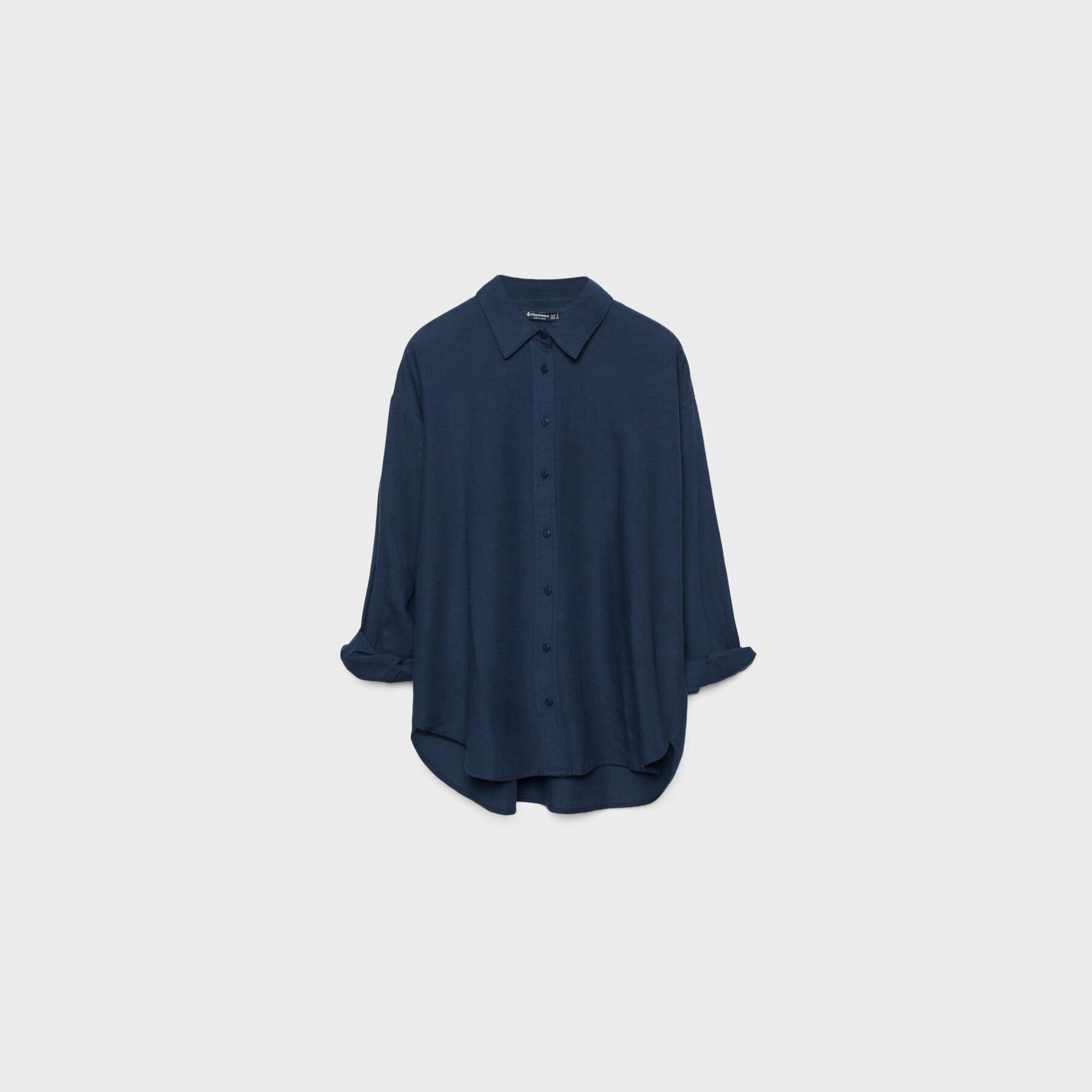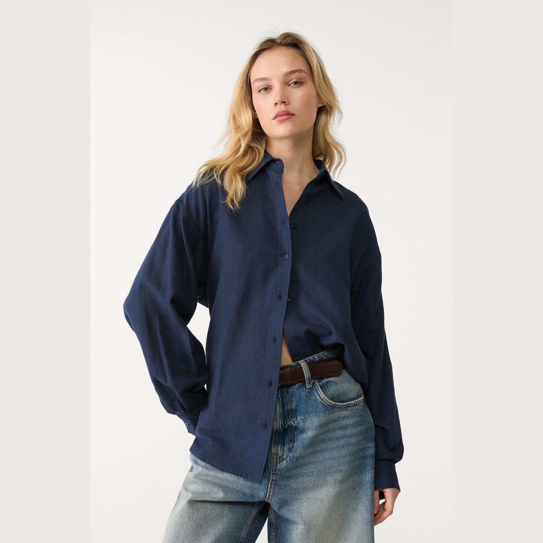 قميص أنيق من Stradivarius بلون كحلي، مصنوع من خامة خفيفة ومريحة بخليط من الفيسكوز والقطن والكتان، بتصميم Regular Fit وياقة كلاسيكية، مزود بأزرار أمامية وأكمام طويلة مع أساور، يمنحك إطلالة بسيطة وعصرية مثالية للاستخدام اليومي.