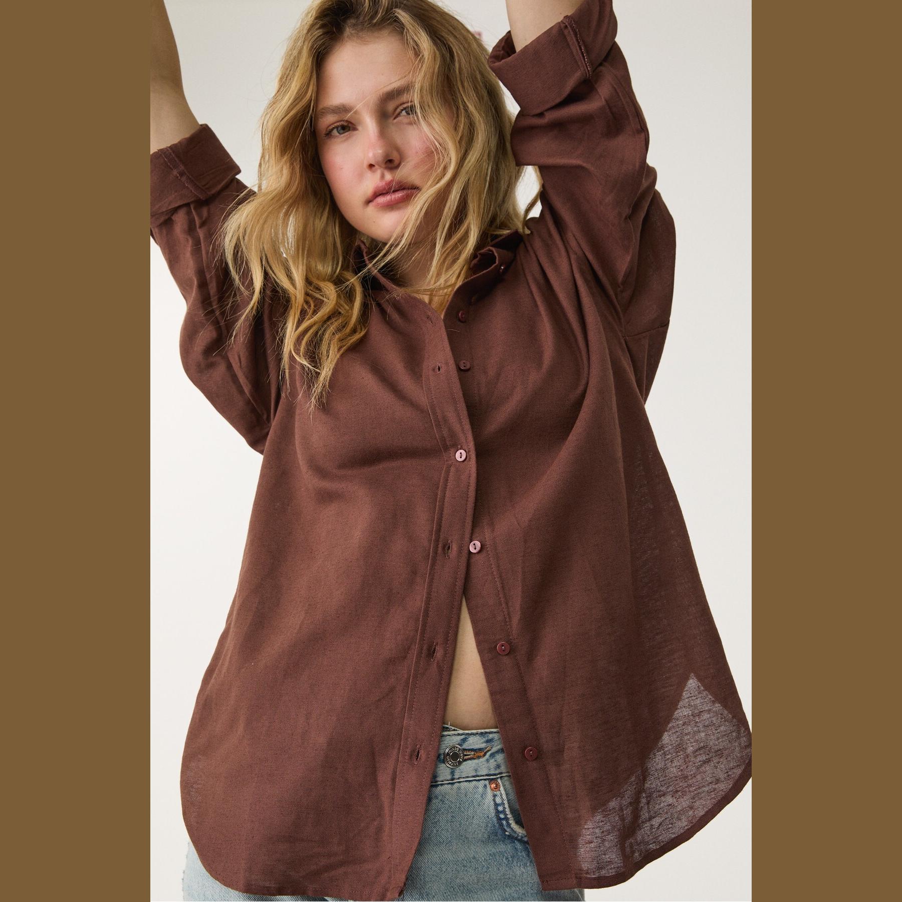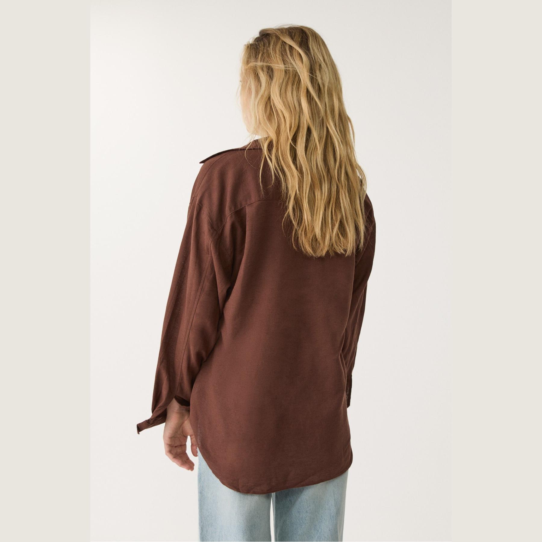 قميص أنيق من Stradivarius بلون بني، مصنوع من خامة منسوجة خفيفة ومريحة بخليط من الفيسكوز والقطن والكتان، بتصميم Regular Fit وياقة قميص كلاسيكية، مزود بأزرار أمامية وأكمام طويلة مع أساور، يمنحك إطلالة بسيطة وعصرية مثالية للاستخدام اليومي أو المكتبي.