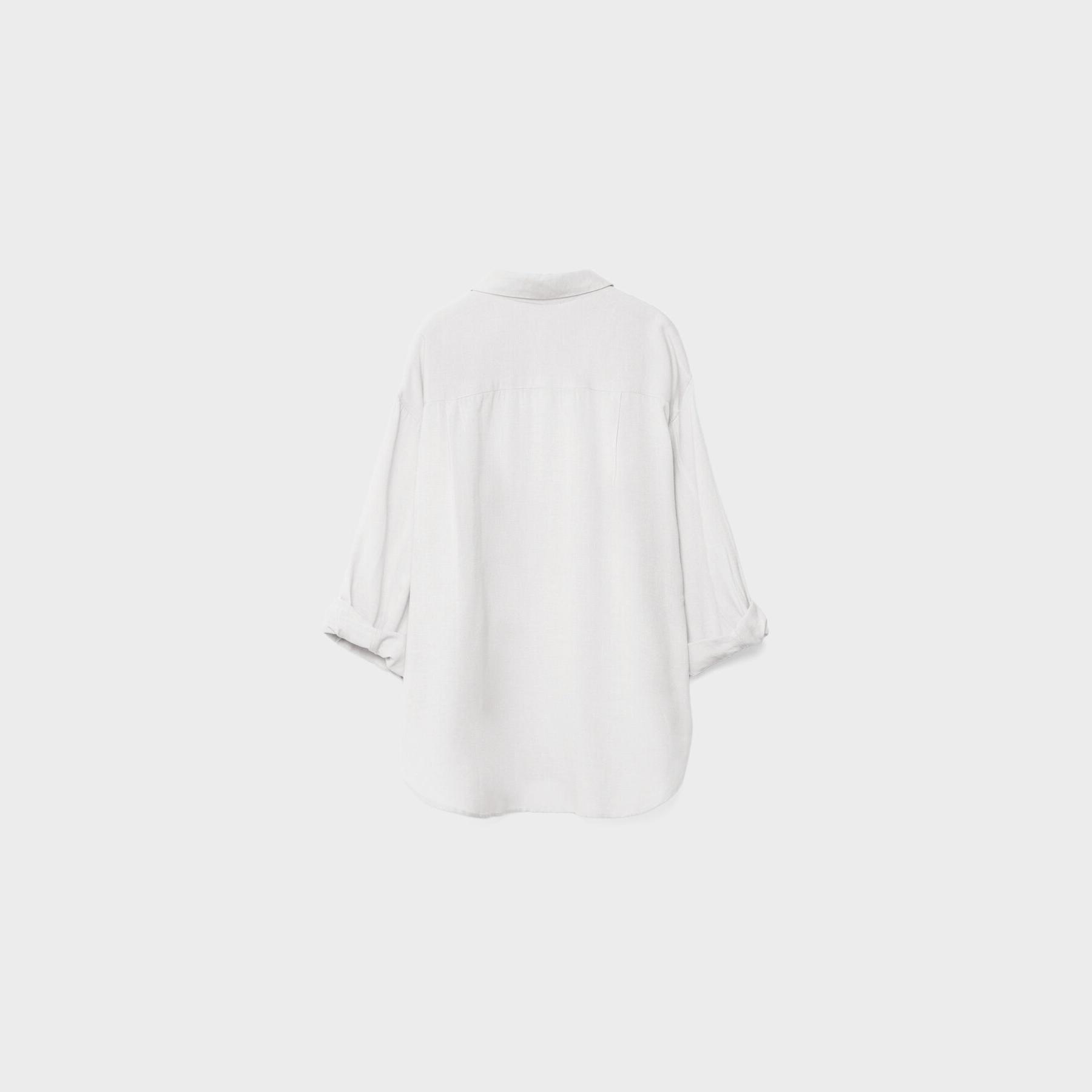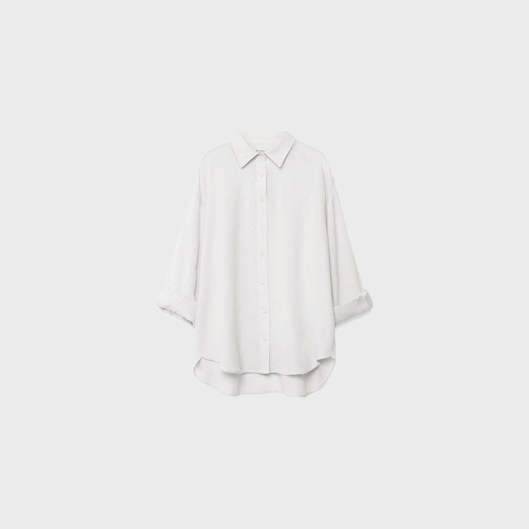 قميص أنيق من Stradivarius بلون أبيض، مصنوع من خامة منسوجة خفيفة ومريحة بخليط من الفيسكوز والقطن والكتان، بتصميم Relaxed Fit وياقة قميص كلاسيكية، مزود بأزرار أمامية وأكمام طويلة مع أساور، يمنحك إطلالة بسيطة وعصرية مثالية للاستخدام اليومي أو المكتبي.