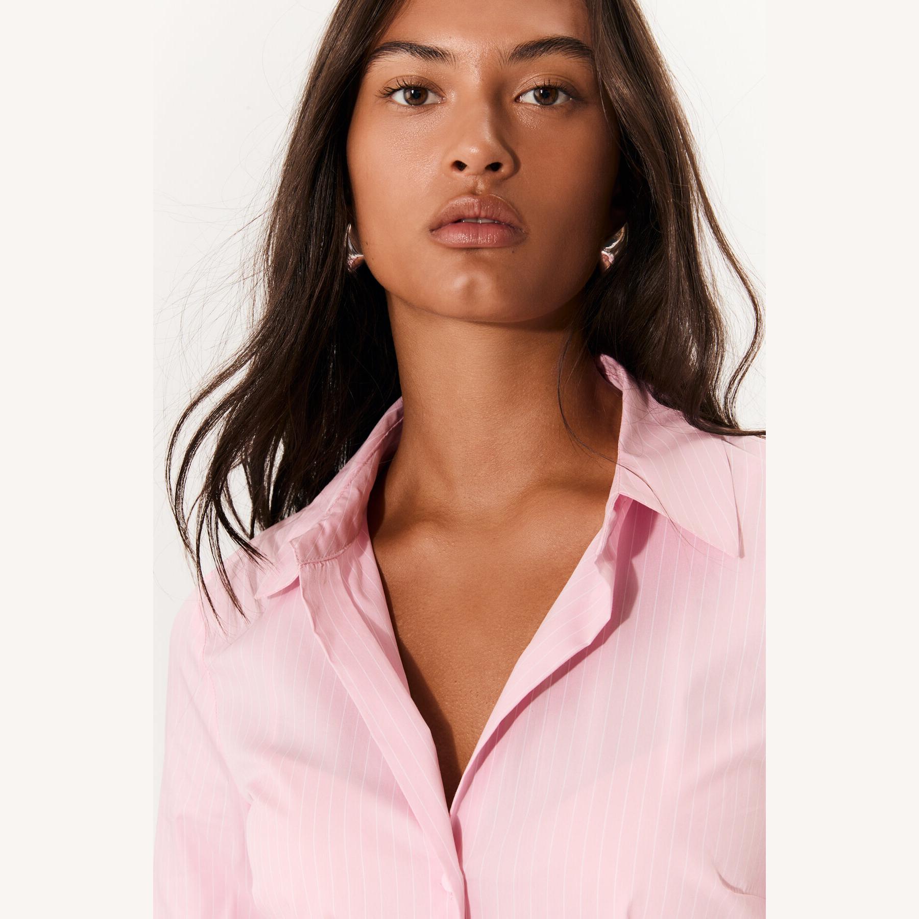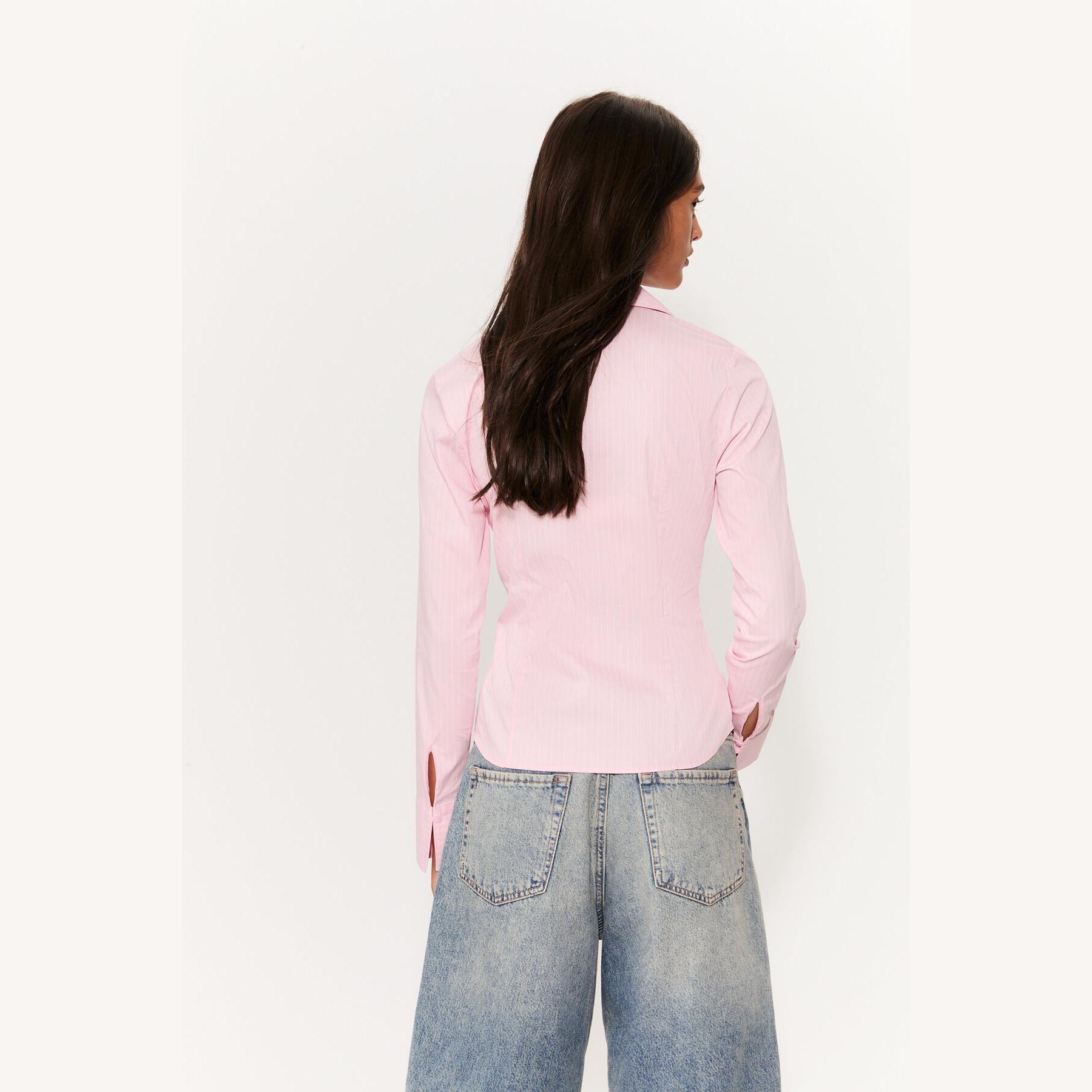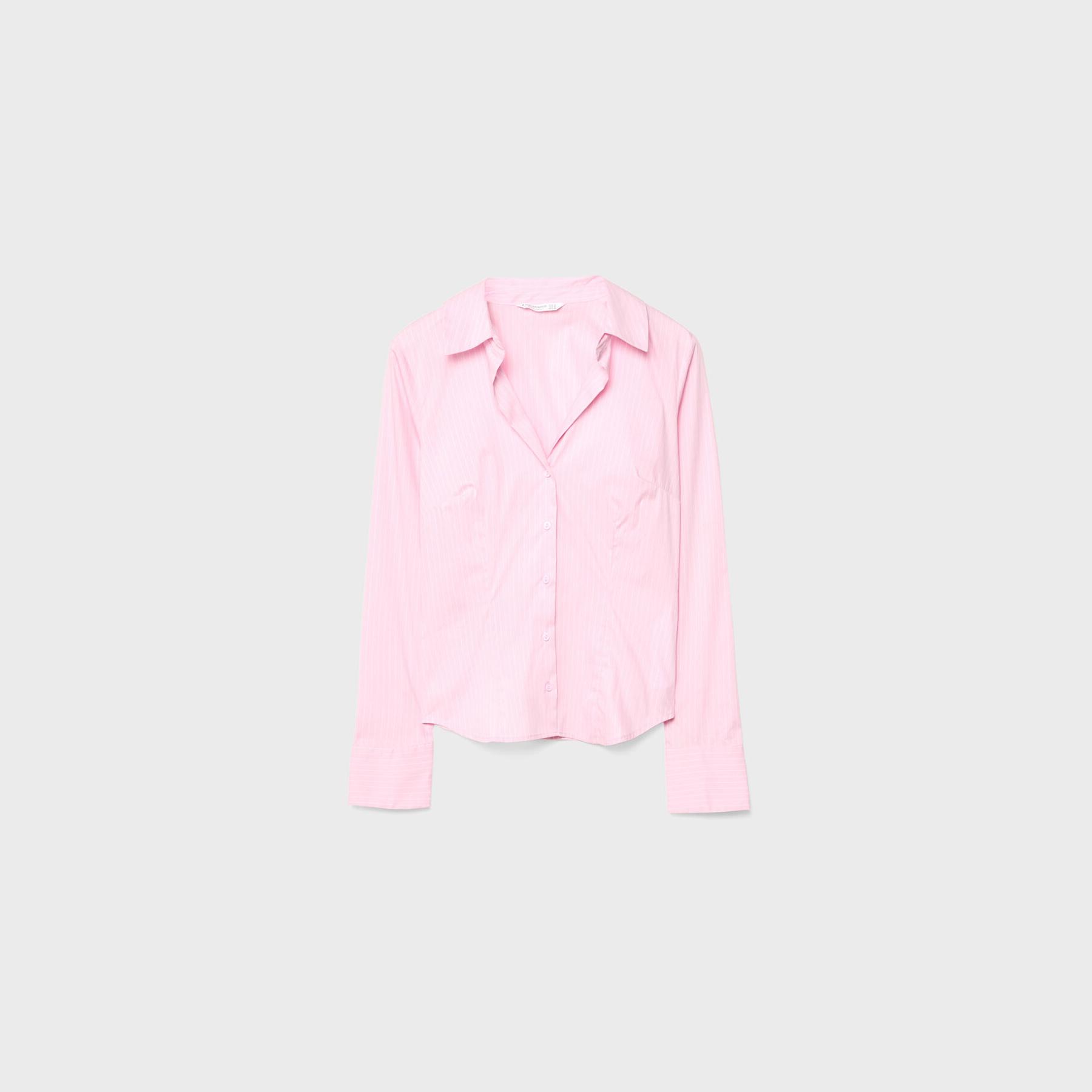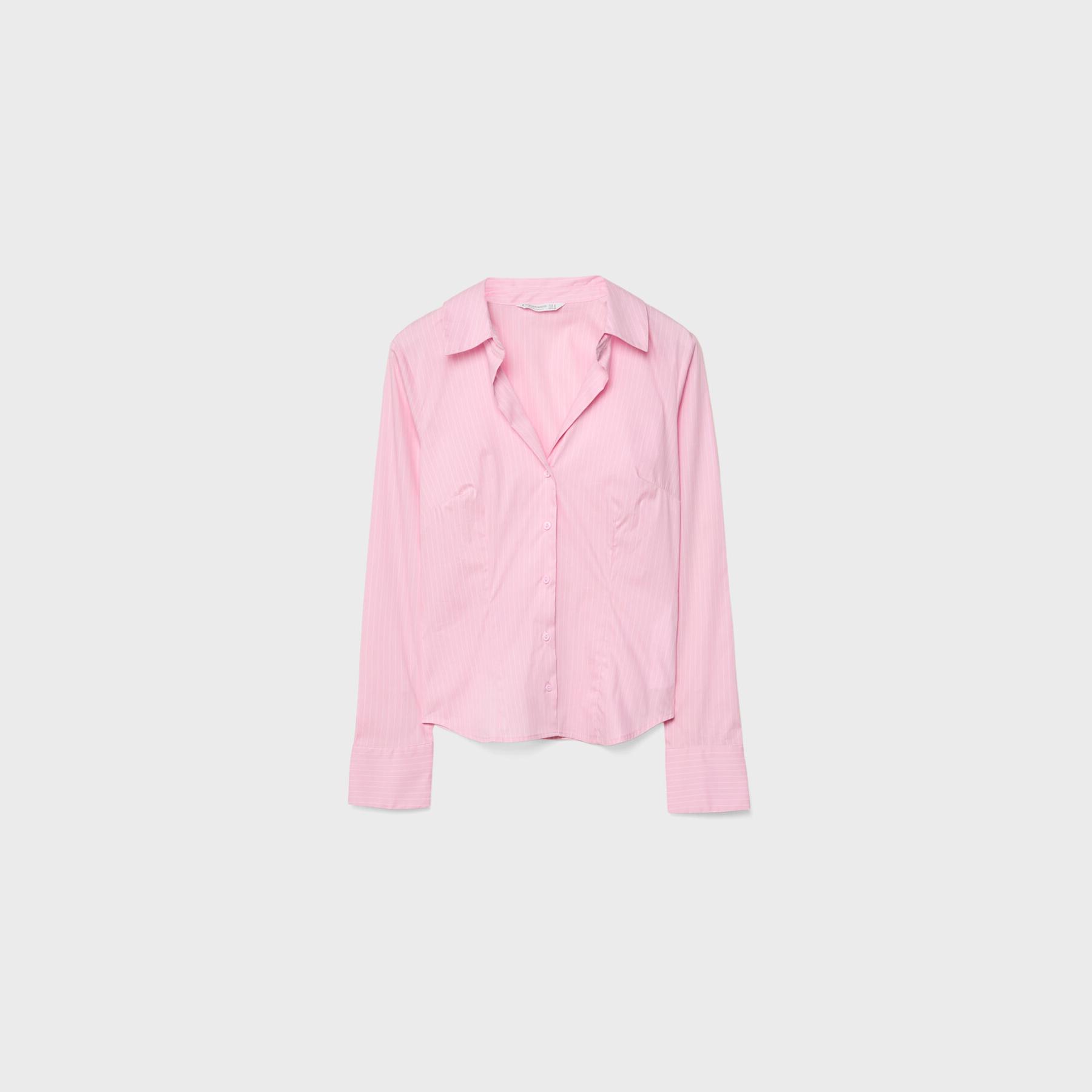 قميص أنيق من Stradivarius بلون وردي فاتح مخطط، مصنوع من خامة منسوجة مرنة، بتصميم Slim Fit وياقة V، مزود بأزرار أمامية وأكمام طويلة مع أساور، يمنحك إطلالة أنثوية وعصرية مثالية للاستخدام اليومي أو المكتبي.