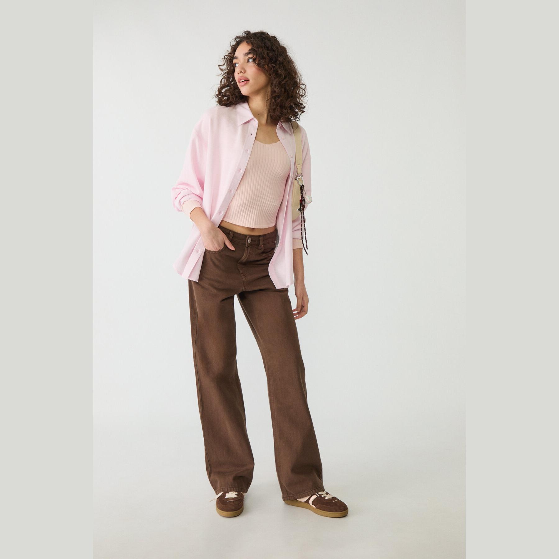 قميص أنيق من Stradivarius بلون فوشيا، مصنوع من خامة منسوجة خفيفة ومريحة بخليط من الفيسكوز والقطن والكتان، بتصميم Regular Fit وياقة قميص كلاسيكية، مزود بأزرار أمامية وأكمام طويلة مع أساور، يمنحك إطلالة جريئة وعصرية مثالية للاستخدام اليومي أو المكتبي.