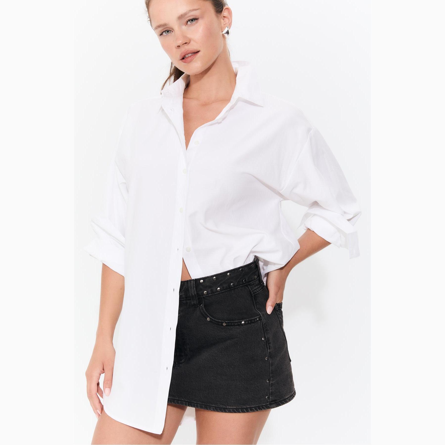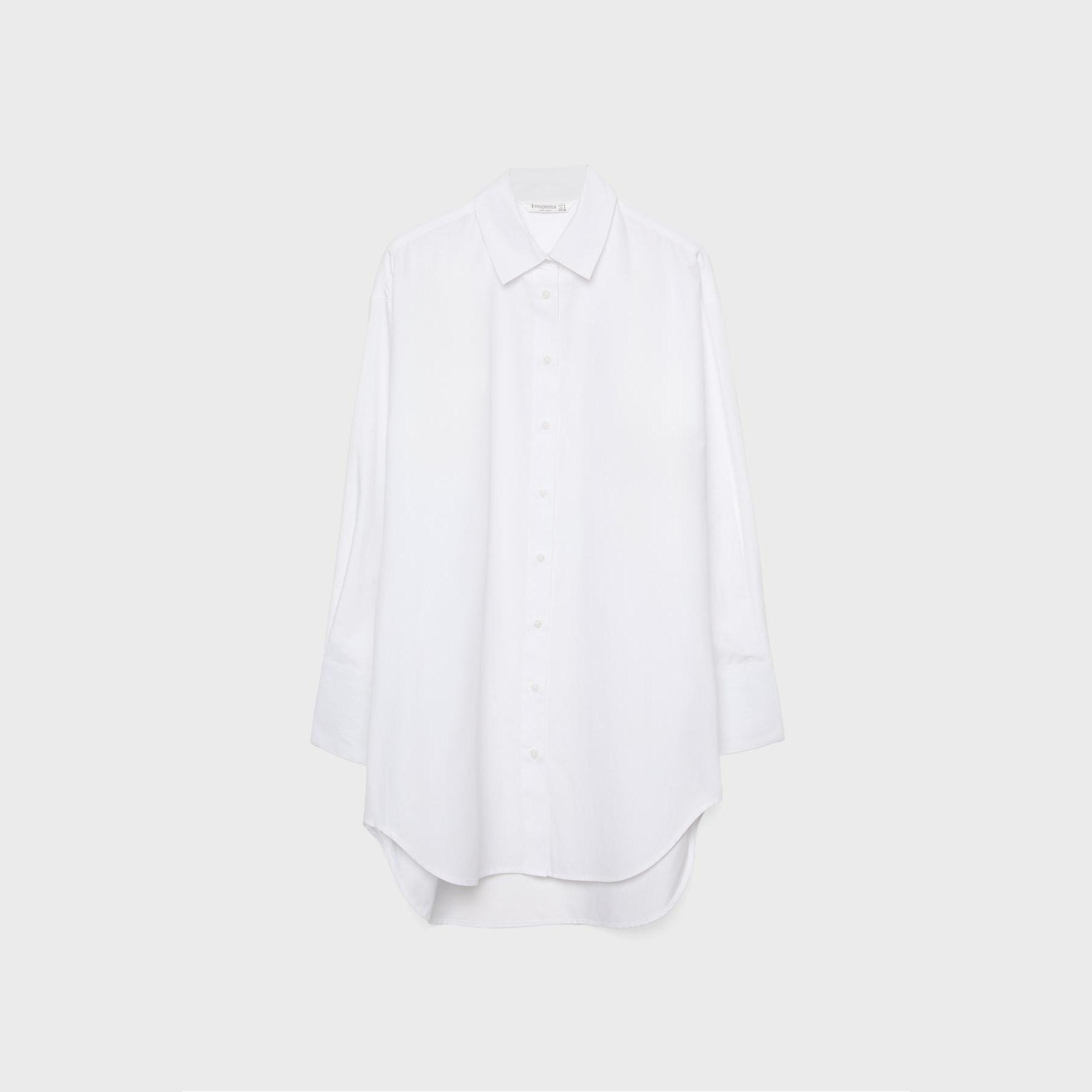- التصميم: قميص طويل بوبلين بأزرار وياقة V