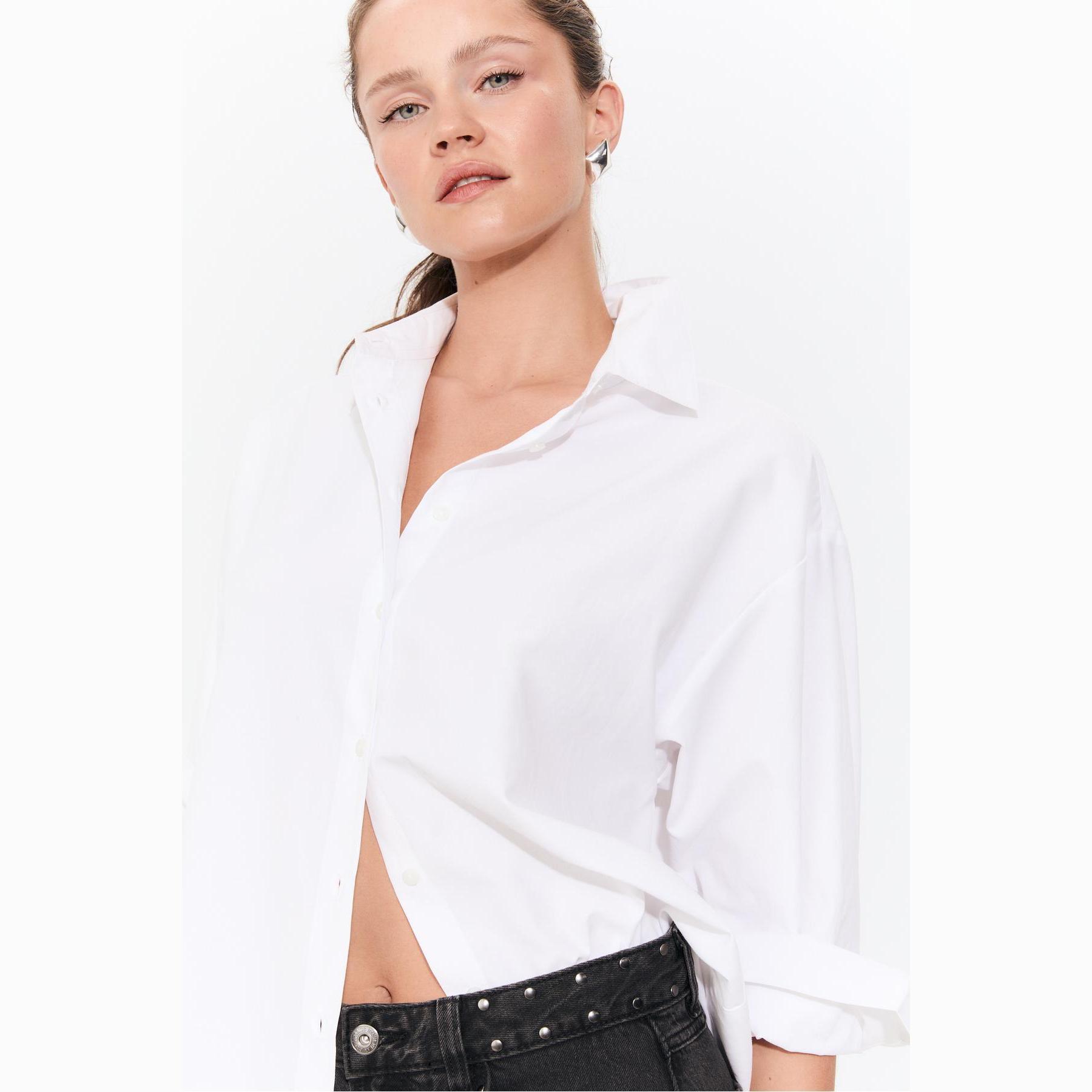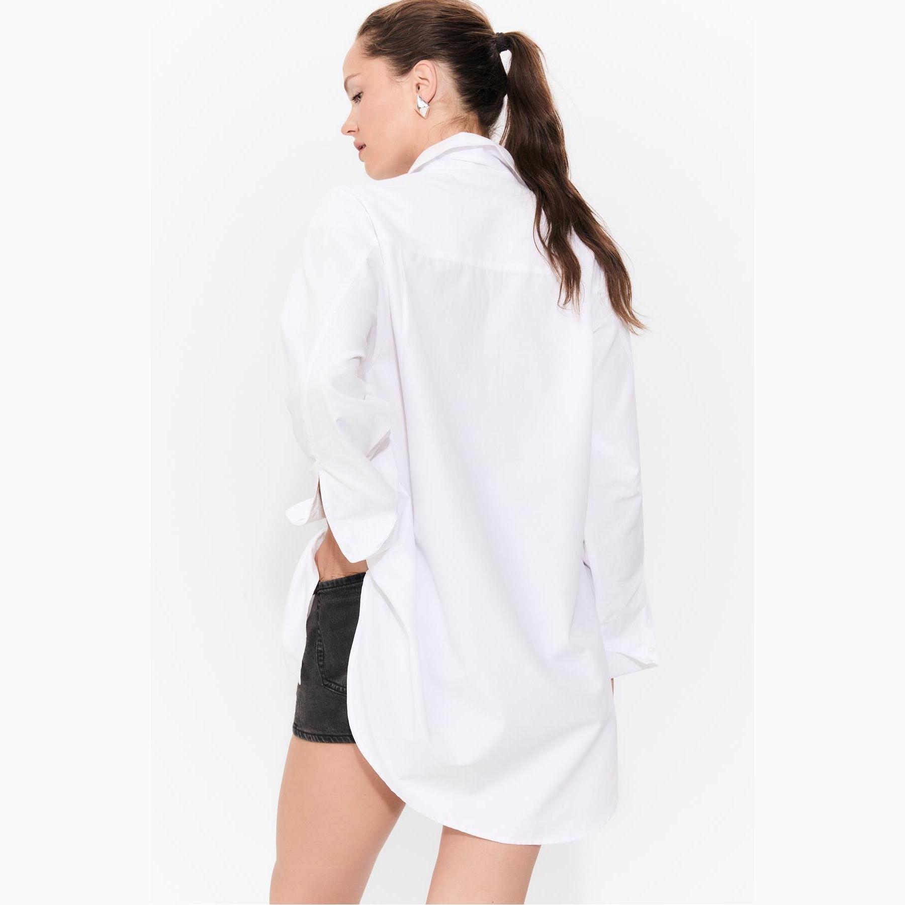 قميص أنيق من Stradivarius بلون أبيض، مصنوع من خامة بوبلين منسوجة تجمع بين البوليستر والقطن، بتصميم Regular Fit وياقة V، مزود بأزرار أمامية وأكمام طويلة مع أساور، يتميز بقصة واسعة وطرف غير متماثل، يمنحك إطلالة بسيطة وعصرية مثالية للاستخدام اليومي أو المكتبي.