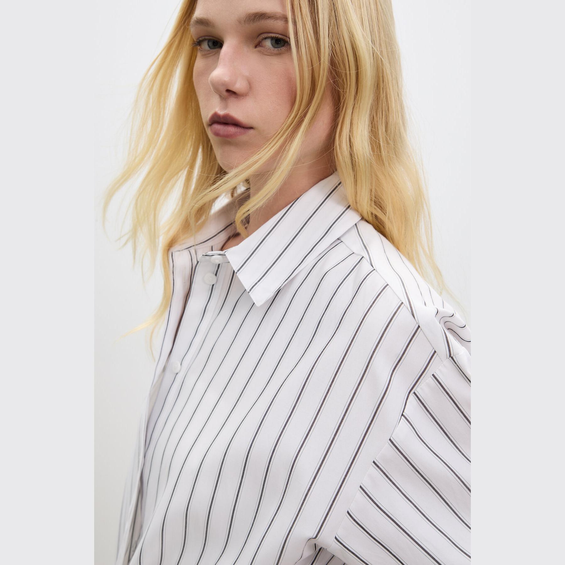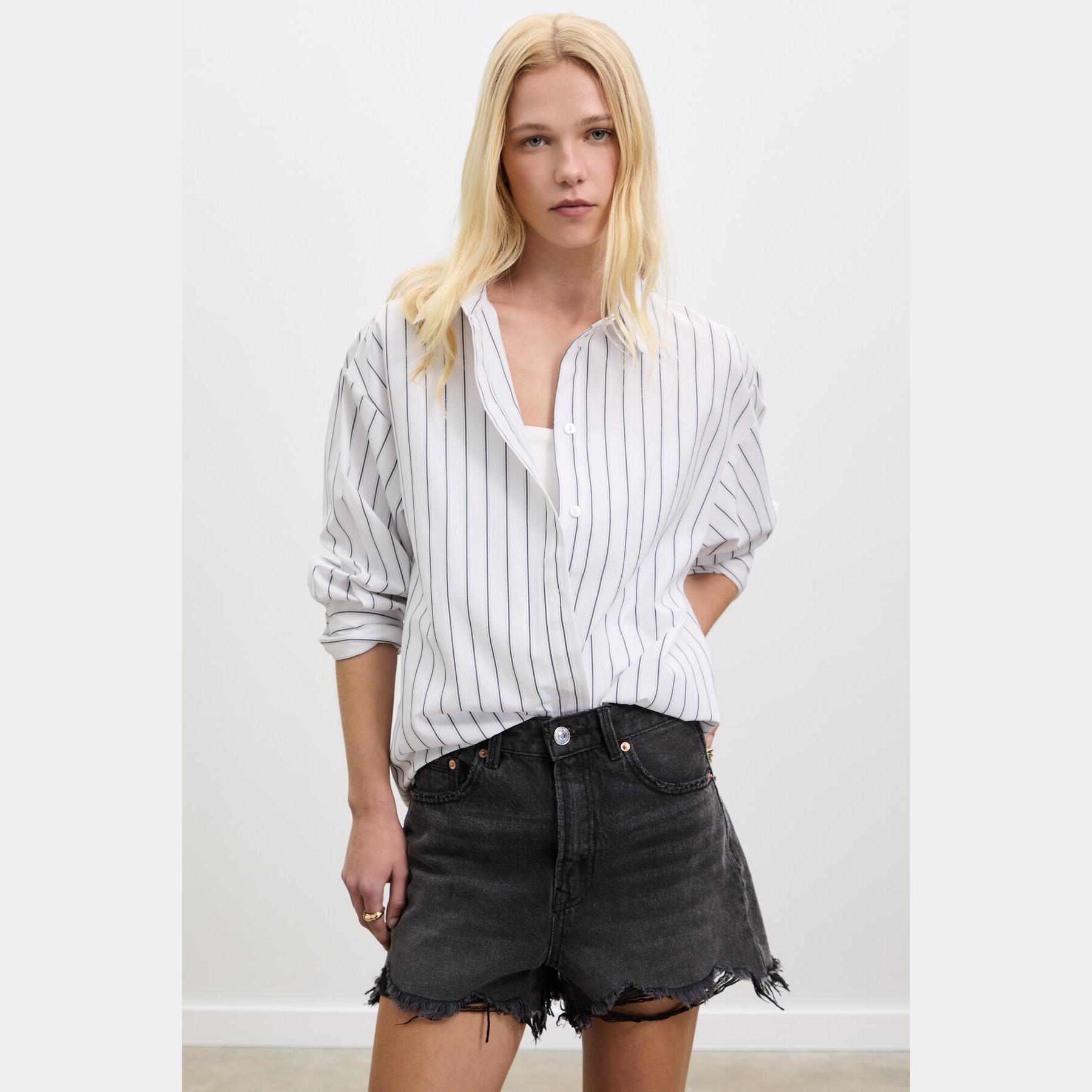 قميص أنيق من Stradivarius بلون أسود مخطط، مصنوع من خامة بوبلين منسوجة تجمع بين البوليستر والقطن، بتصميم Regular Fit وياقة V، مزود بأزرار أمامية وأكمام طويلة مع أساور، يتميز بقصة واسعة وطرف غير متماثل، يمنحك إطلالة بسيطة وعصرية مثالية للاستخدام اليومي أو المكتبي.