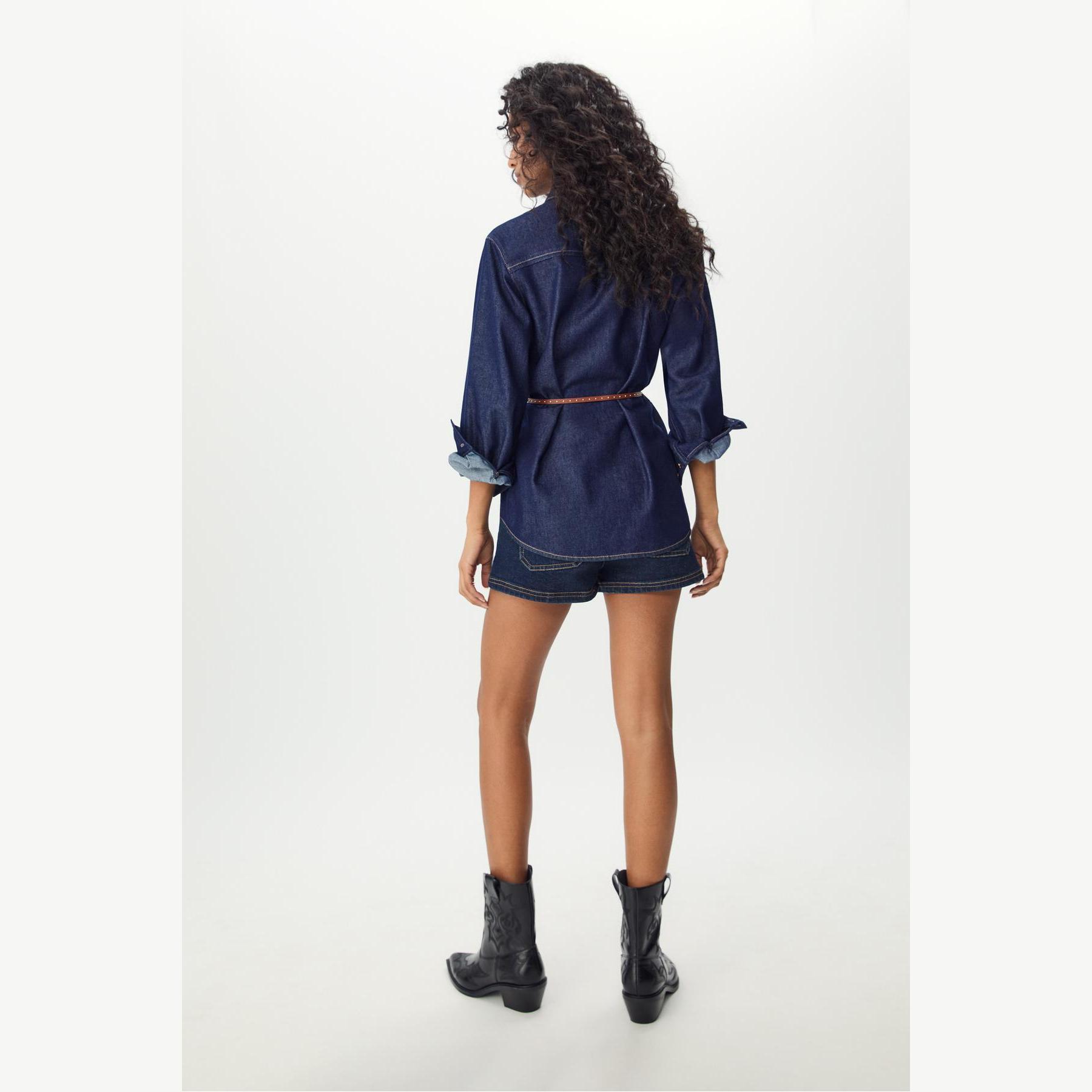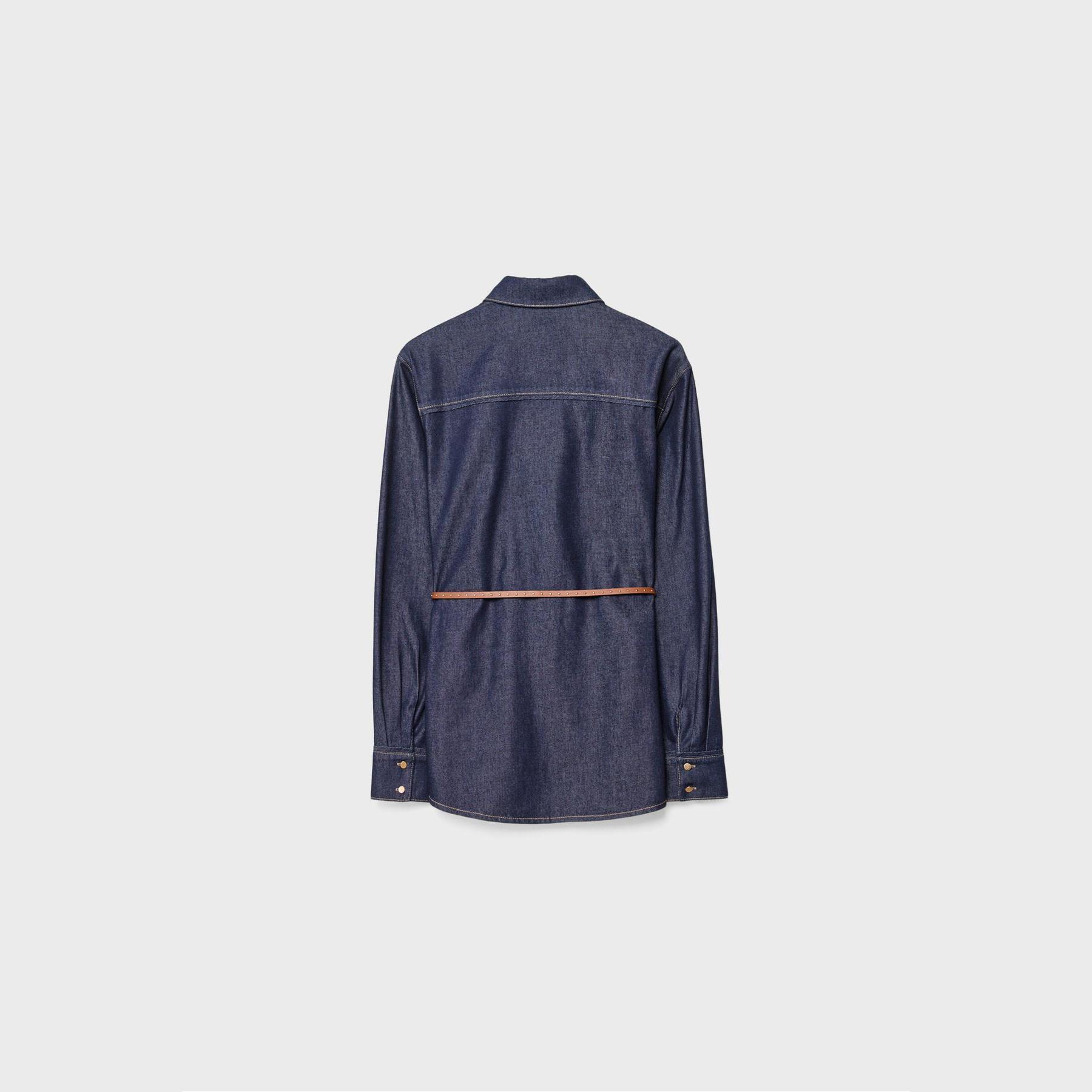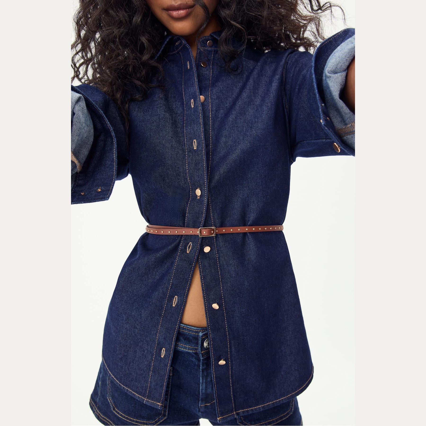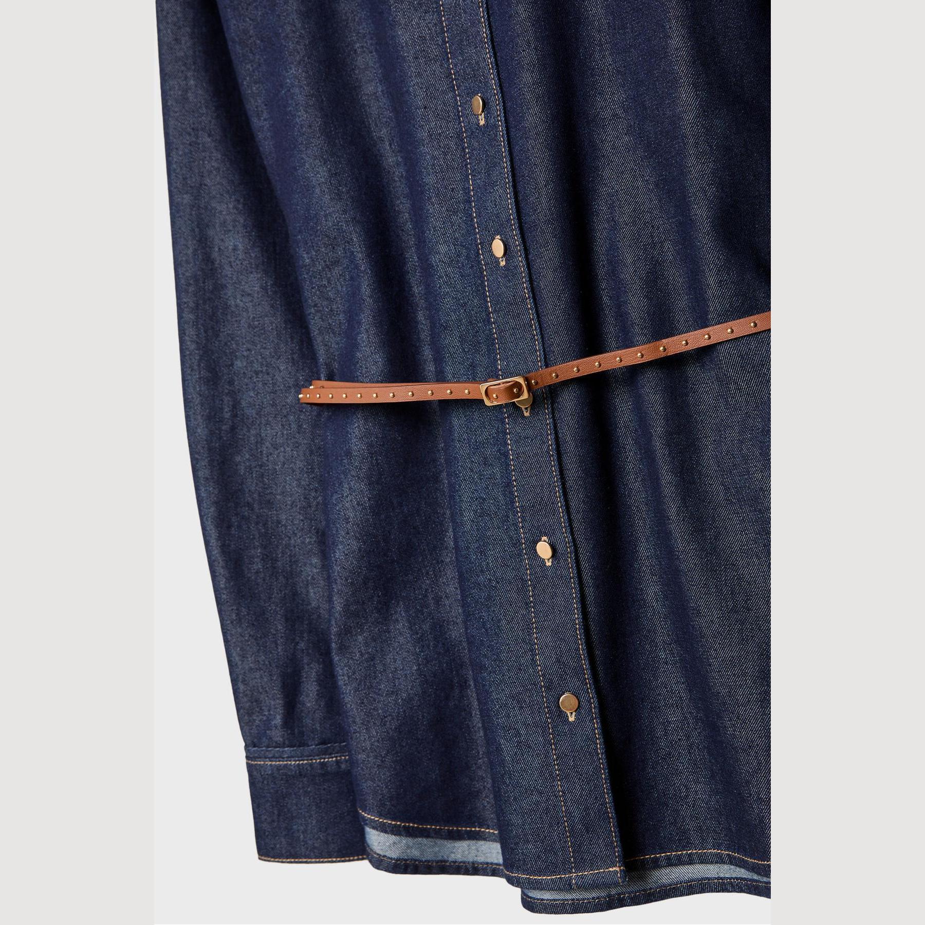 قميص أنيق من Stradivarius بلون كحلي، مصنوع من خامة دنيم منسوجة تجمع بين القطن والبوليستر، بتصميم Regular Fit وياقة V، مزود بأزرار أمامية معدنية وأكمام طويلة مع أساور، يتميز بكمر قابل للفصل بلون متباين مع حلقة معدنية تضيف لمسة عصرية وجريئة.