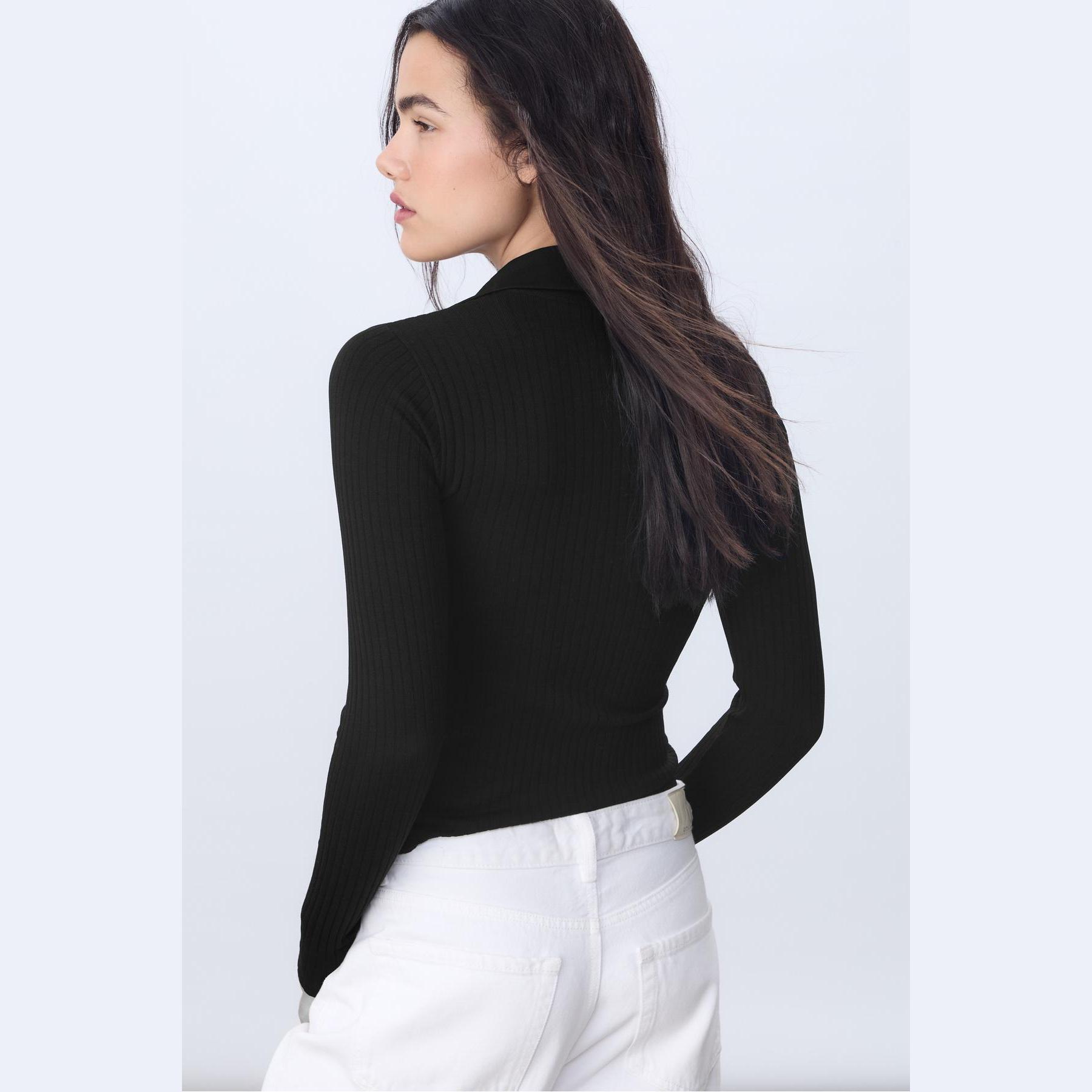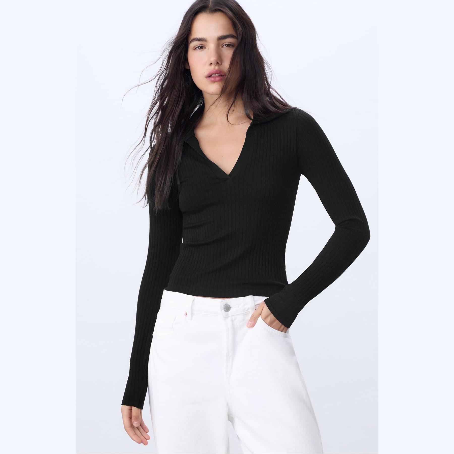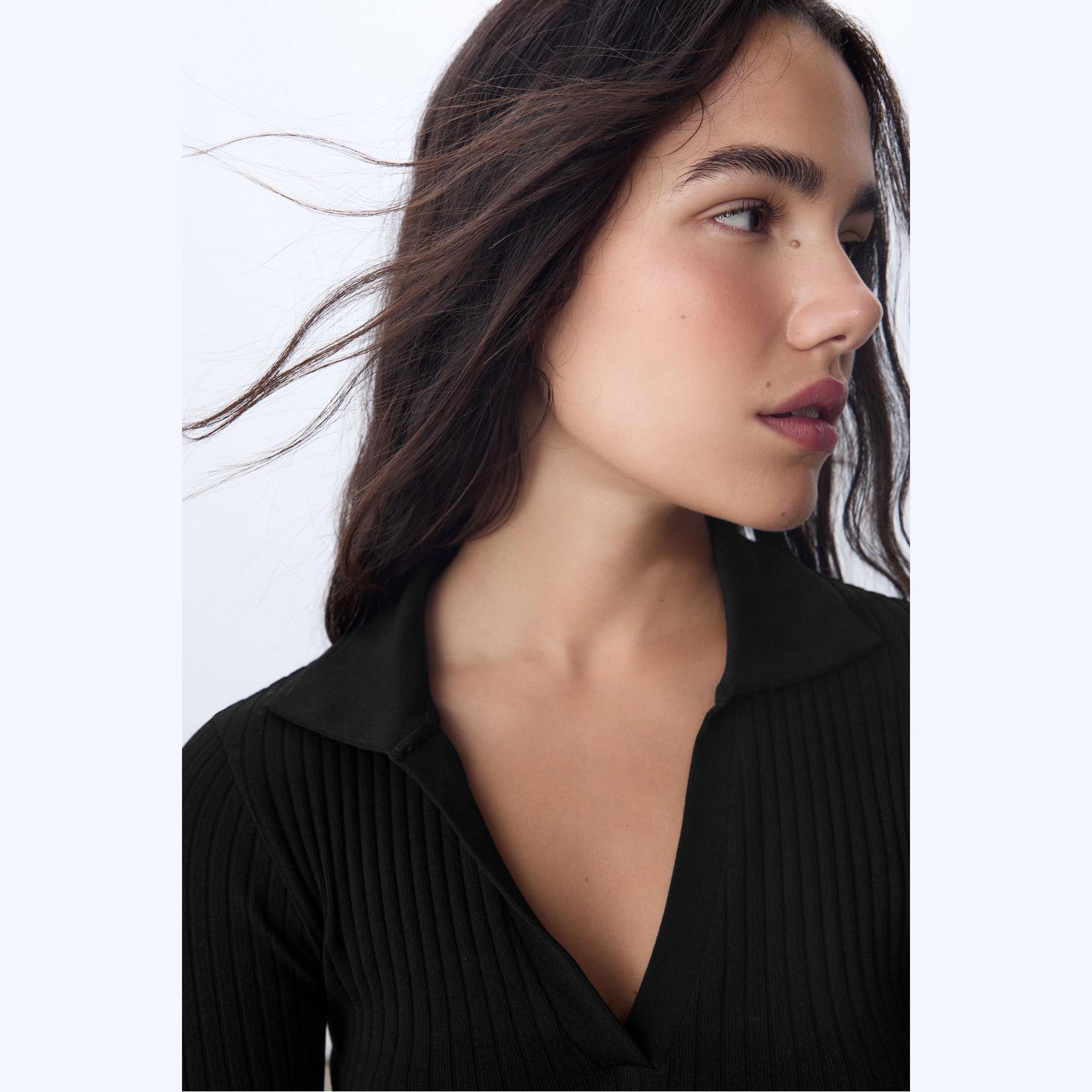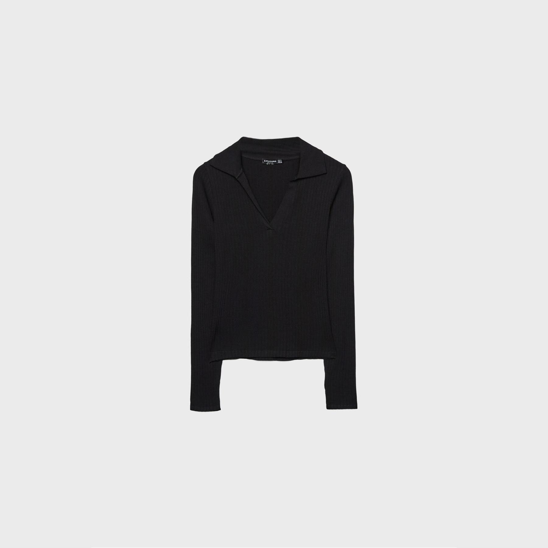 تيشيرت أنيق من Stradivarius بلون أسود، مصنوع من خامة دكيشsiz مرنة بدون خياطة، بتصميم Regular Fit وياقة بولو، مزود بأكمام طويلة وقصة ناعمة تبرز القوام، يمنحك إطلالة رياضية وعصرية مثالية للاستخدام اليومي أو أثناء الحركة.