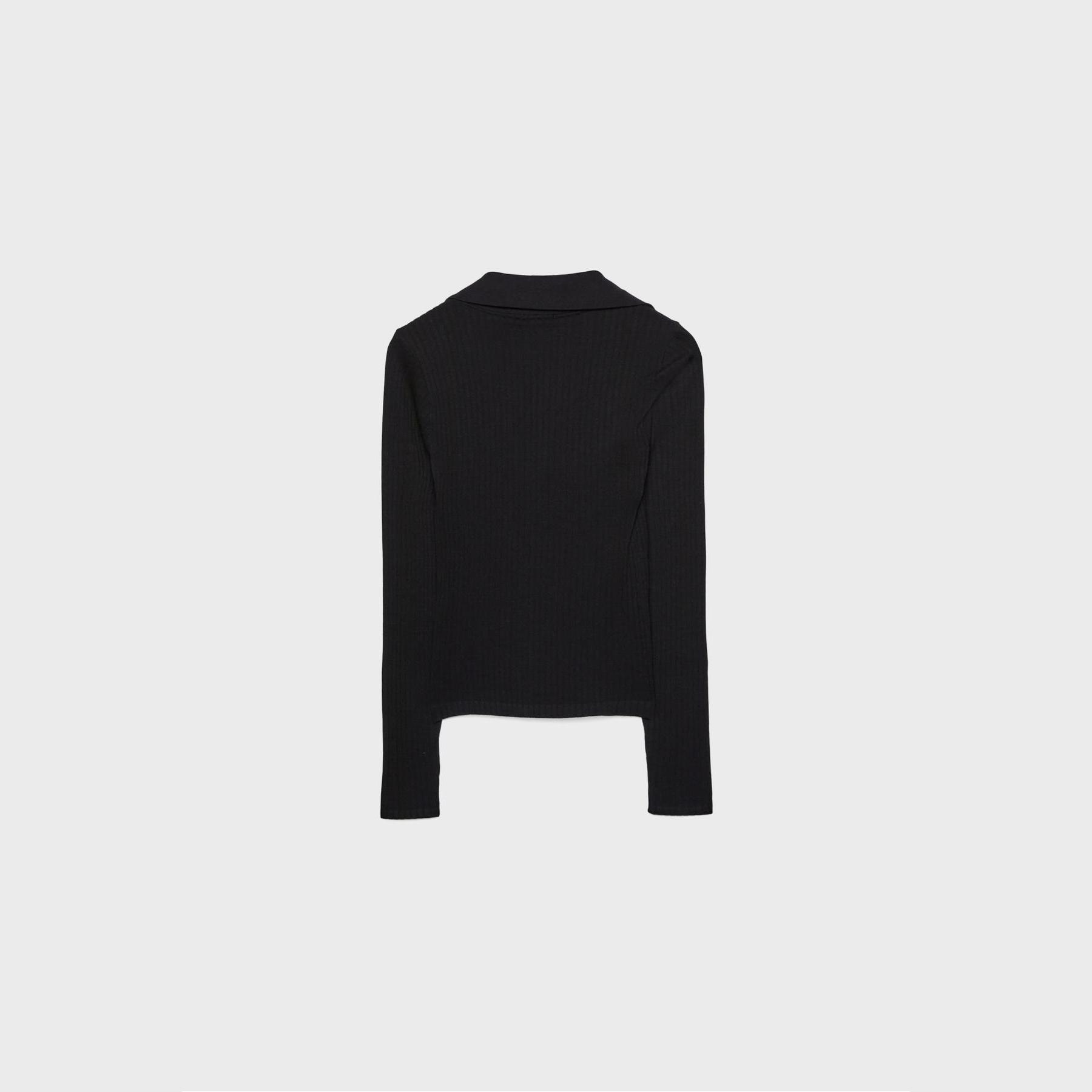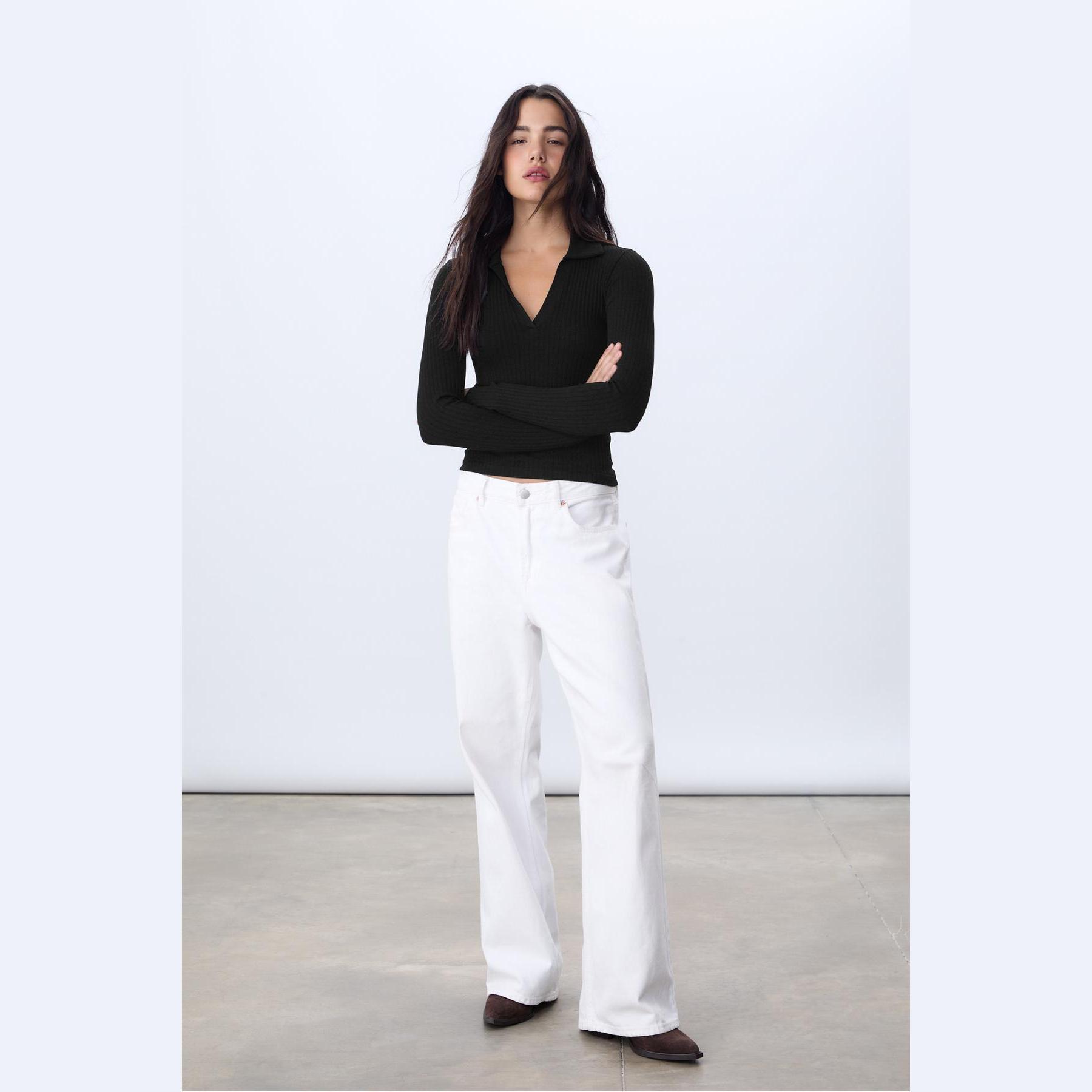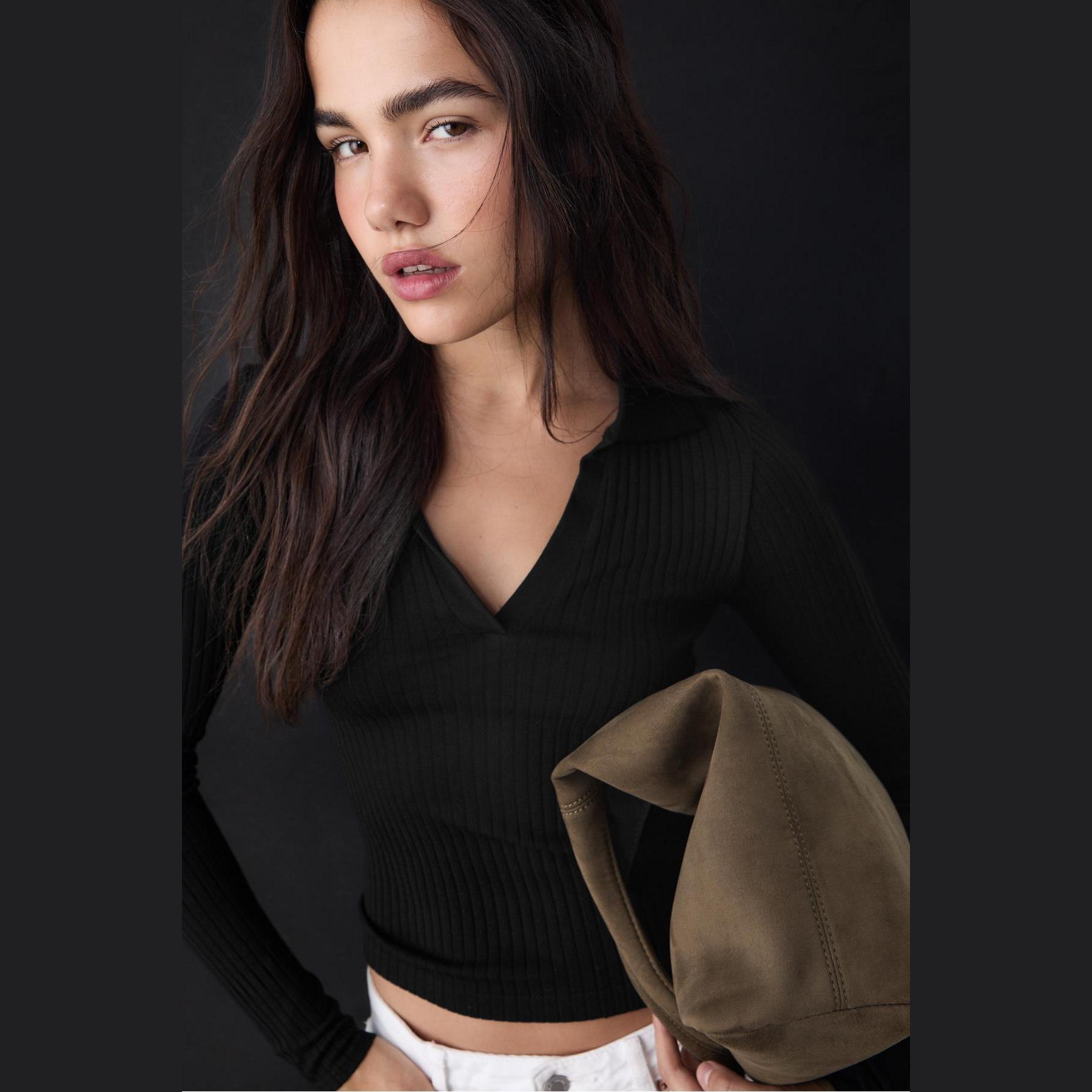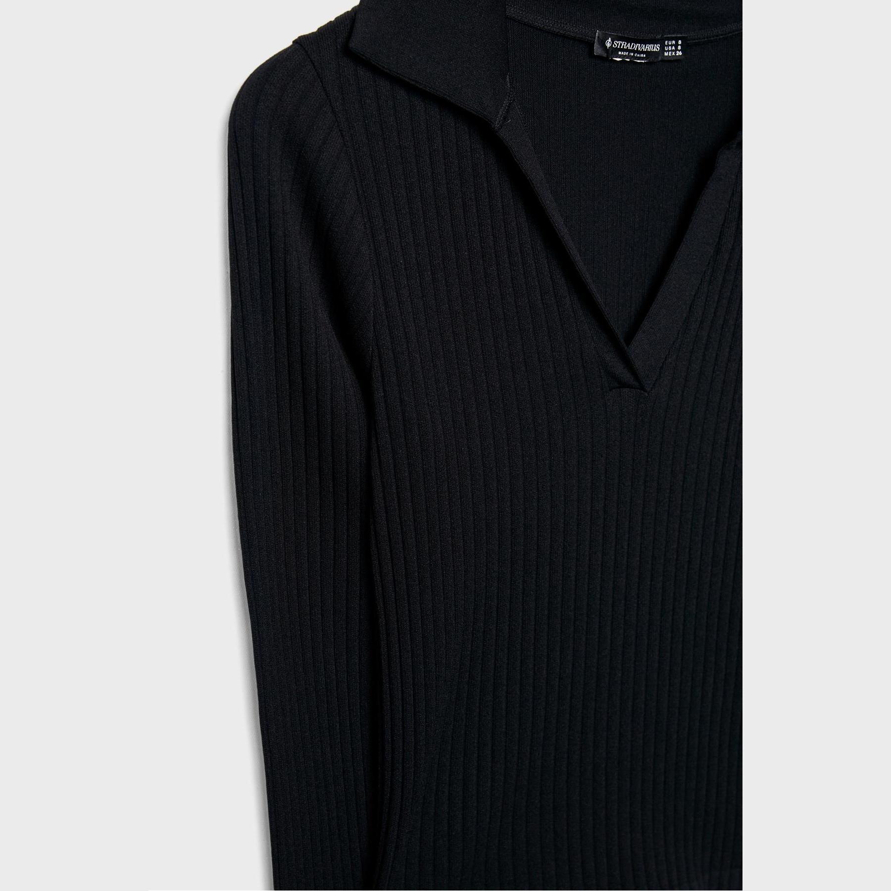 تيشيرت أنيق من Stradivarius بلون أسود، مصنوع من خامة دكيشsiz مرنة بدون خياطة، بتصميم Regular Fit وياقة بولو، مزود بأكمام طويلة وقصة ناعمة تبرز القوام، يمنحك إطلالة رياضية وعصرية مثالية للاستخدام اليومي أو أثناء الحركة.