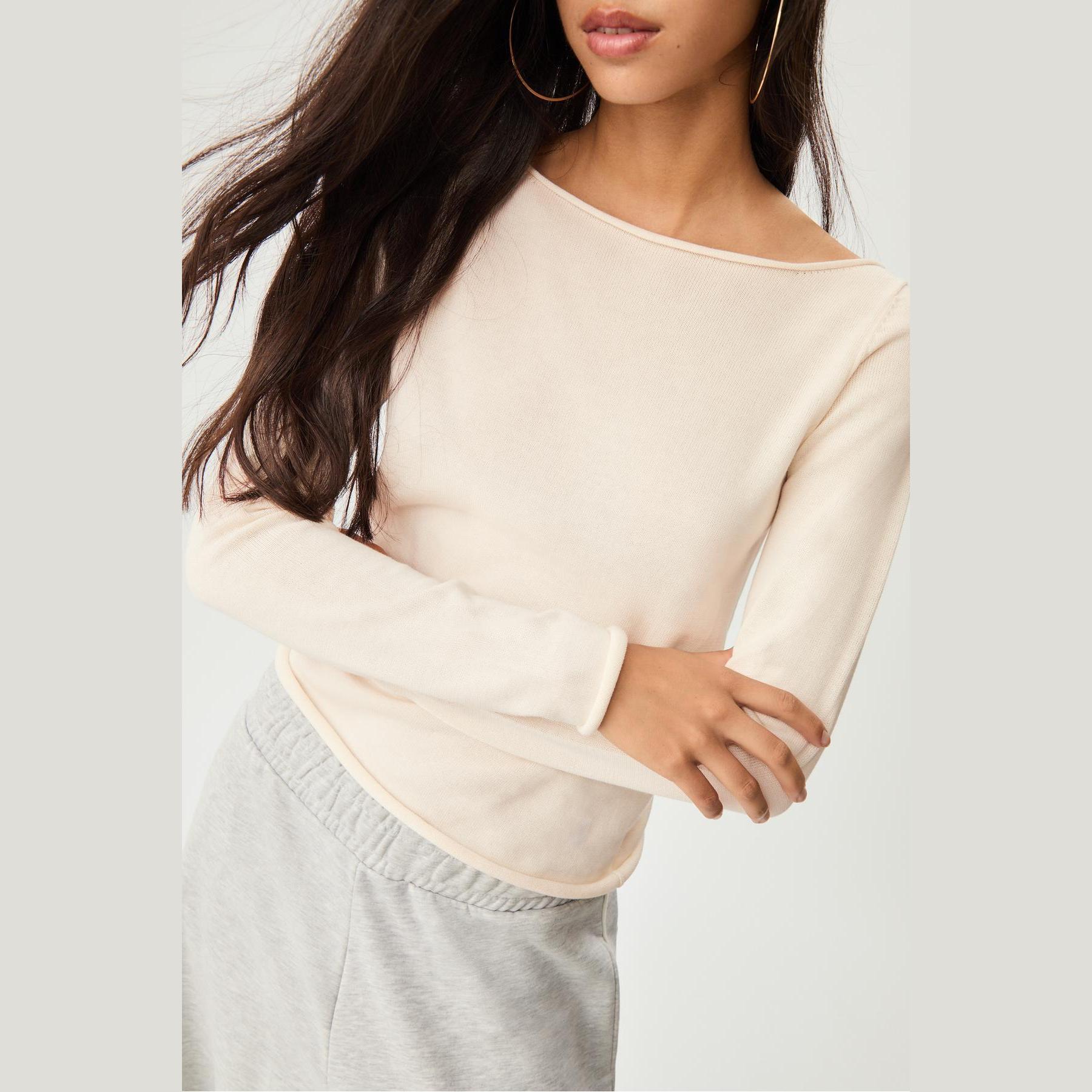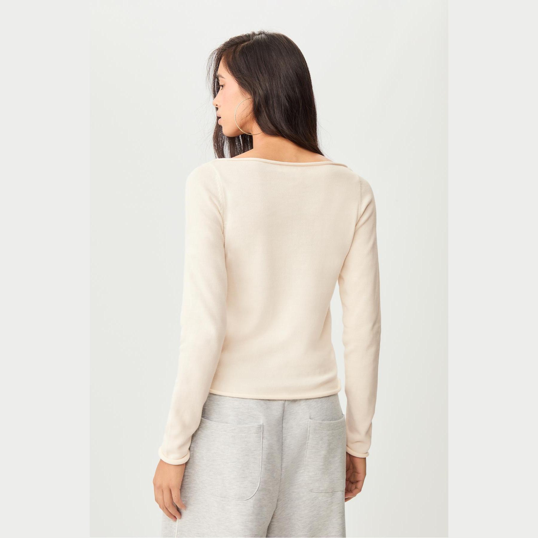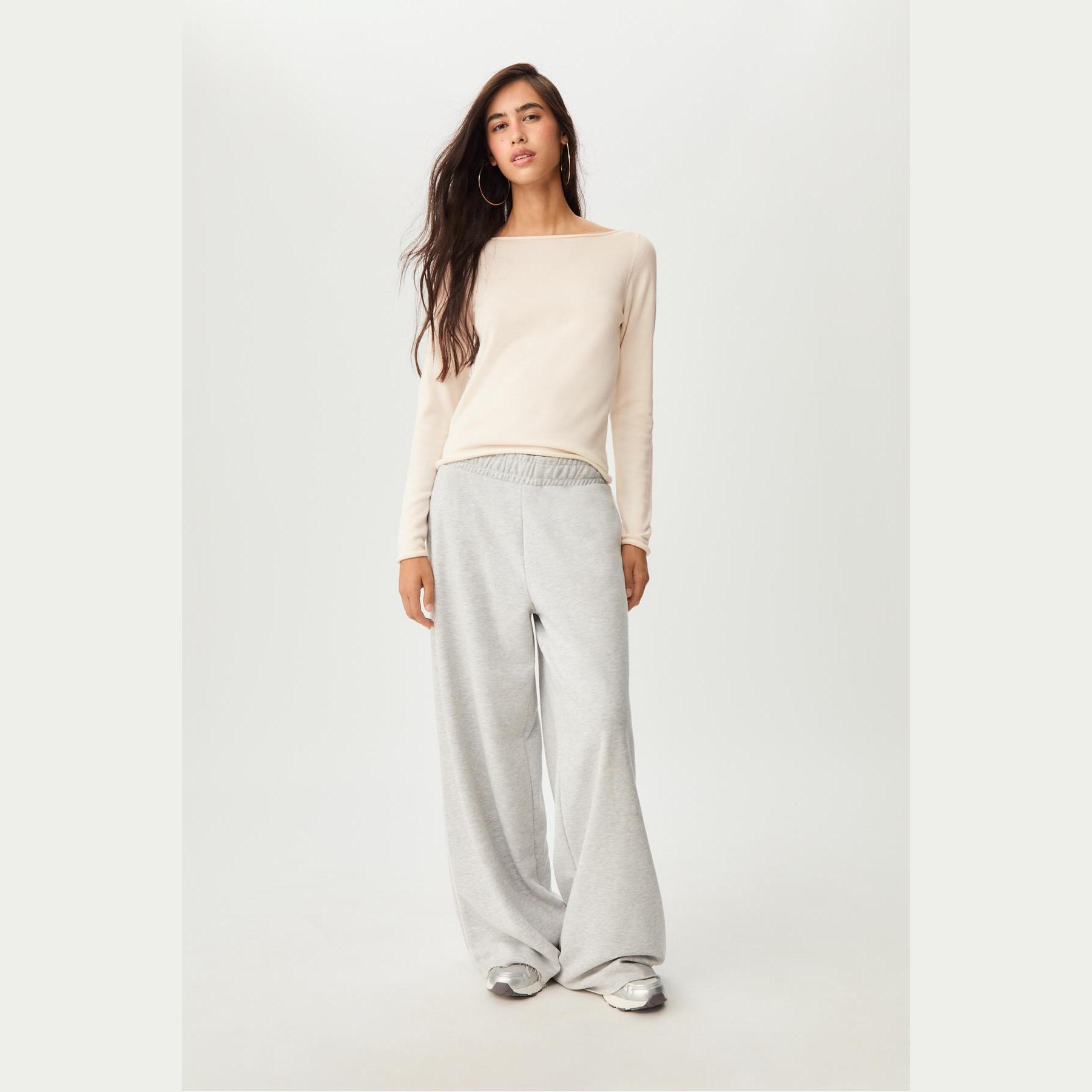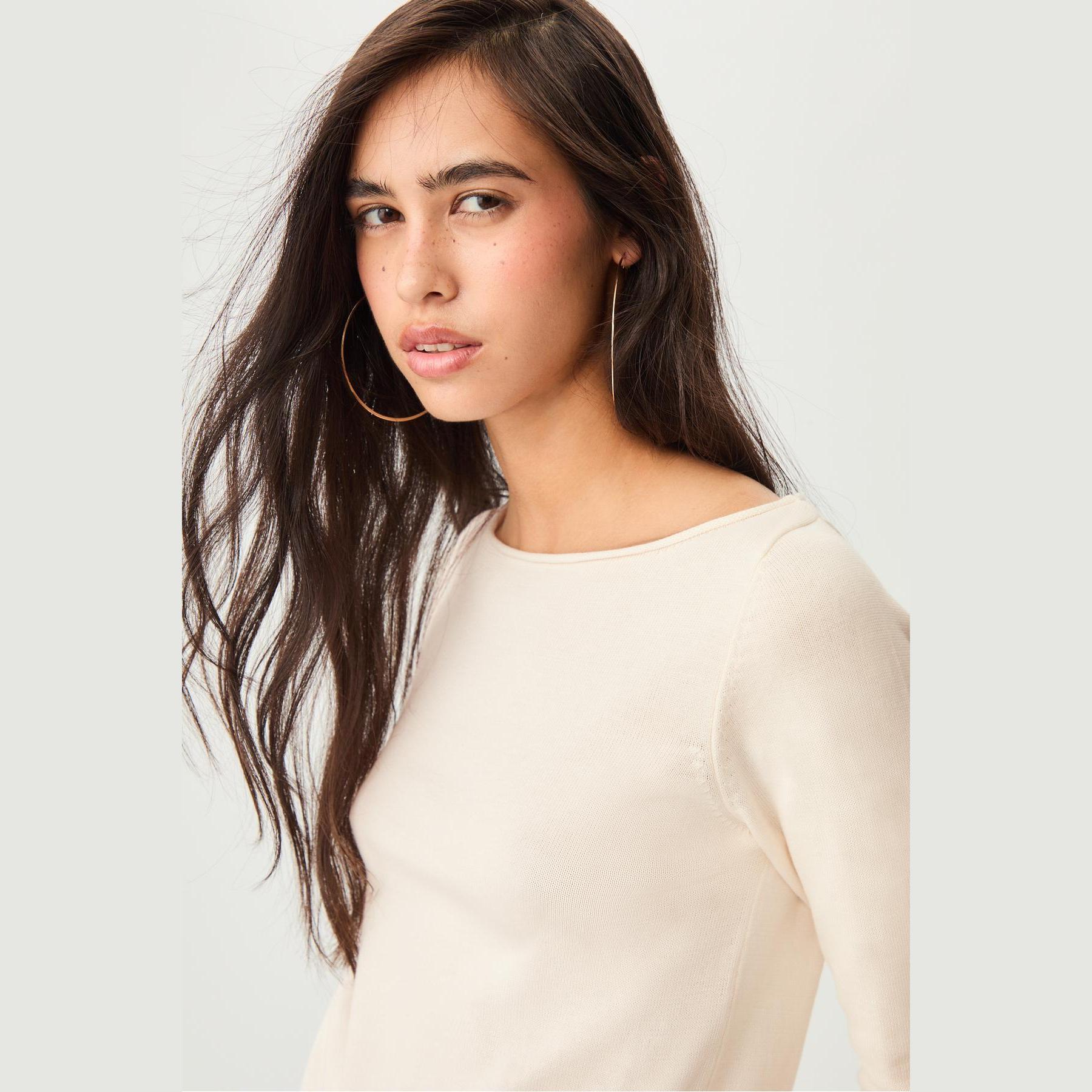 كنزة أنيقة من Stradivarius بلون إكرو، مصنوعة من خامة تريكو منسوجة 100% قطن، بتصميم Regular Fit وياقة واسعة، مزودة بأكمام طويلة وتفاصيل دكيشsiz في الأطراف، تمنحك إطلالة ناعمة وعصرية مثالية للاستخدام اليومي أو المكتبي.