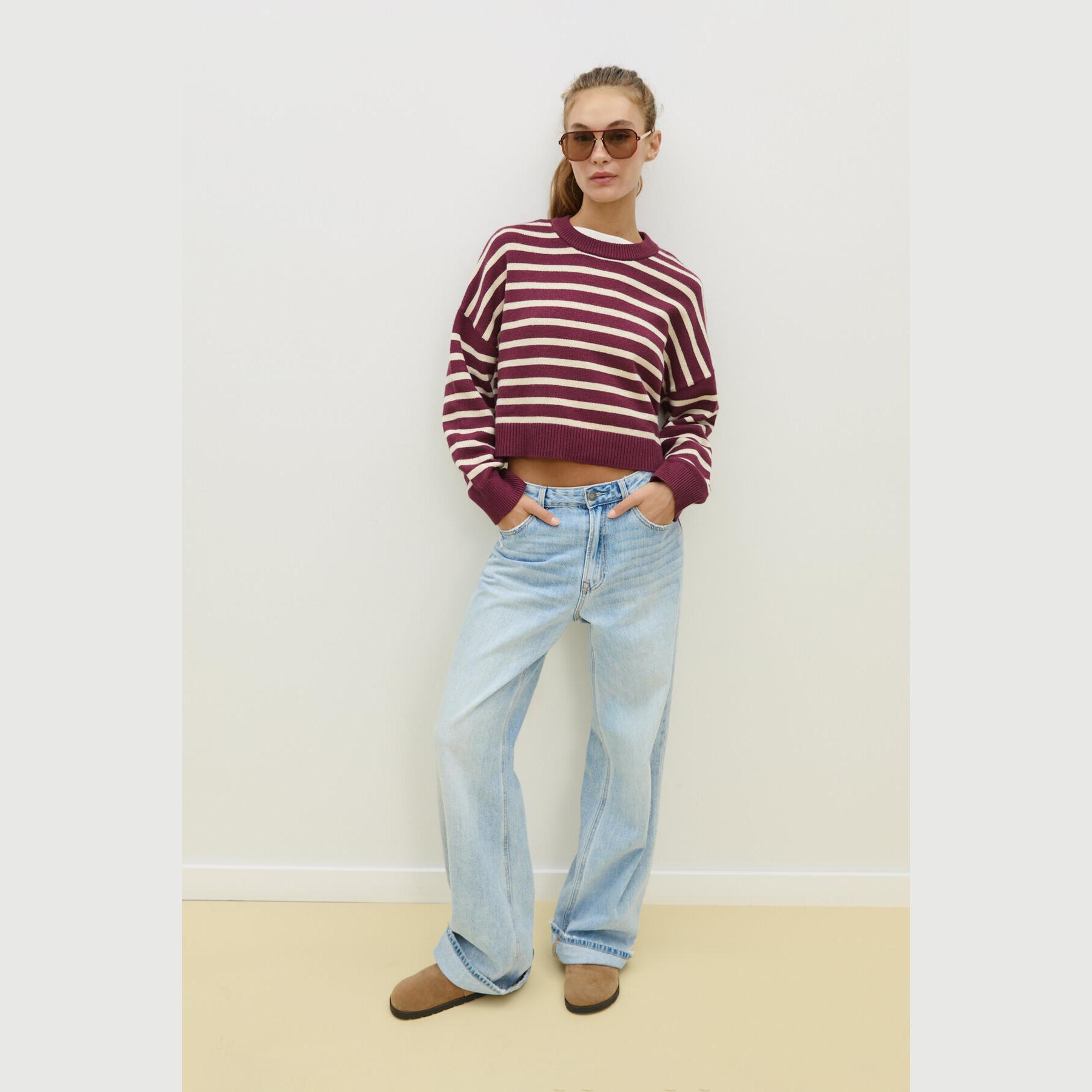 كنزة قصيرة أنيقة من Stradivarius بلون بنفسجي مع نقشة مخططة، مصنوعة من خامة تريكو ناعمة ومرنة، بتصميم Crop Fit وياقة مستديرة، مزودة بأكمام طويلة وأطراف مضلعة، تمنحك إطلالة شبابية وعصرية مثالية للاستخدام اليومي أو الكاجوال.