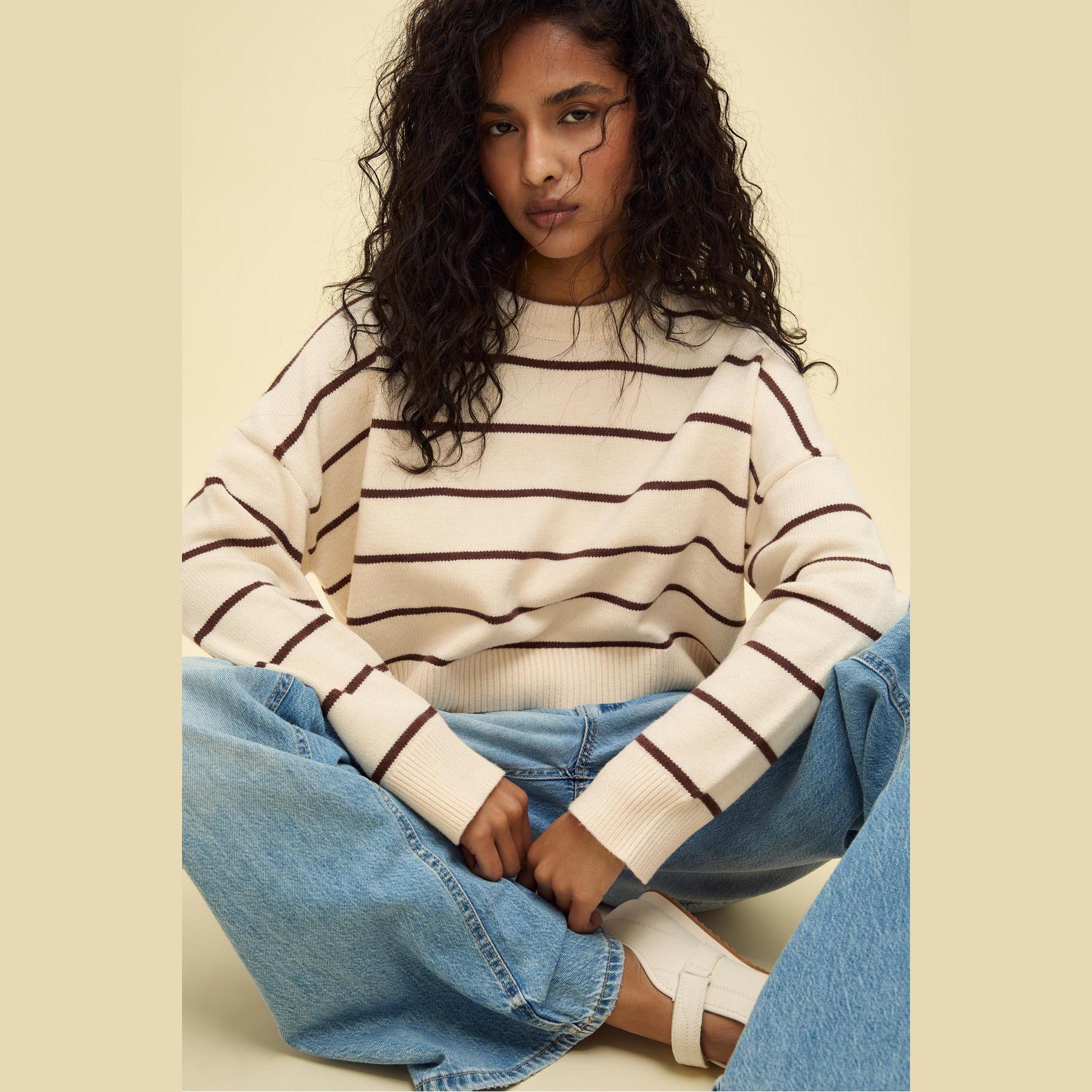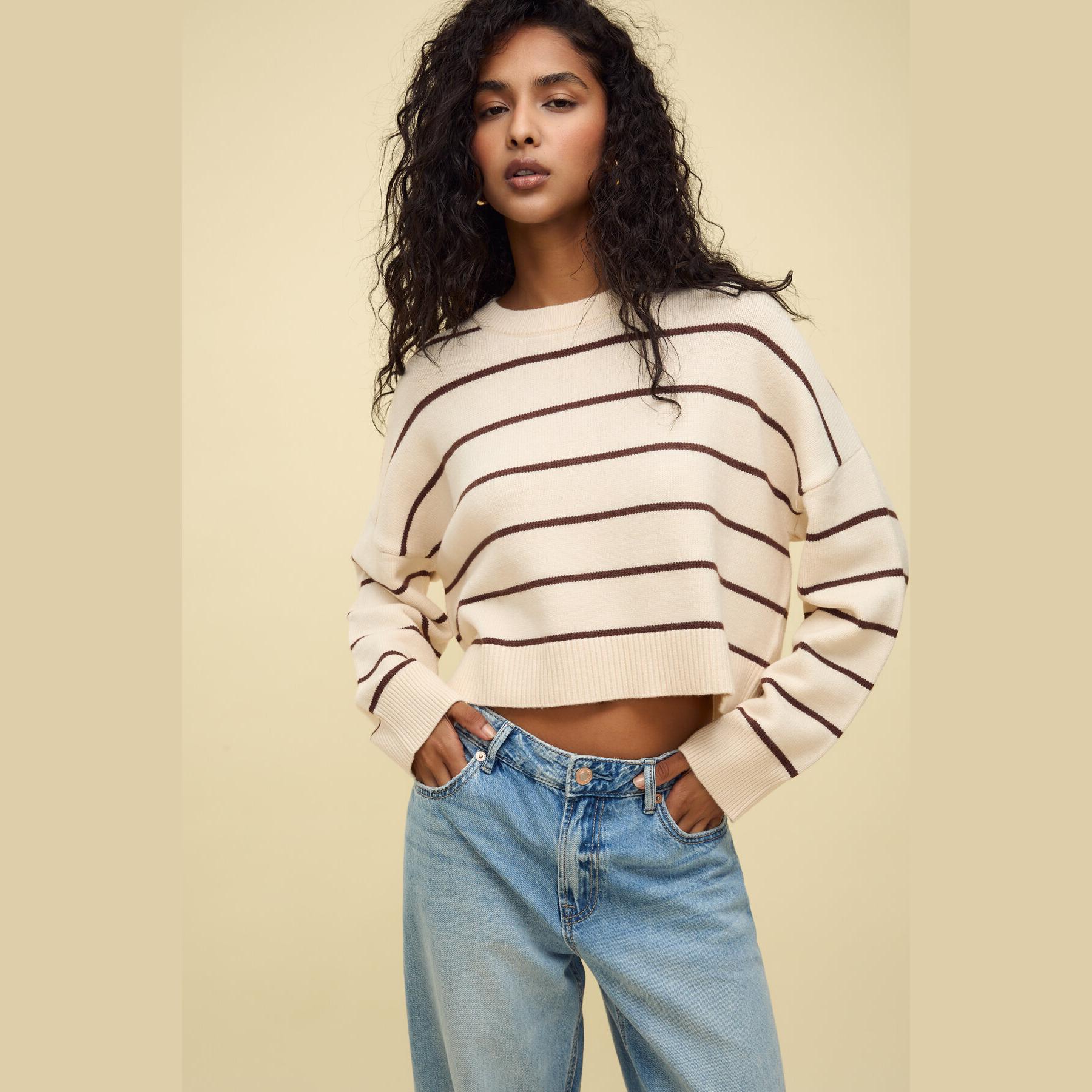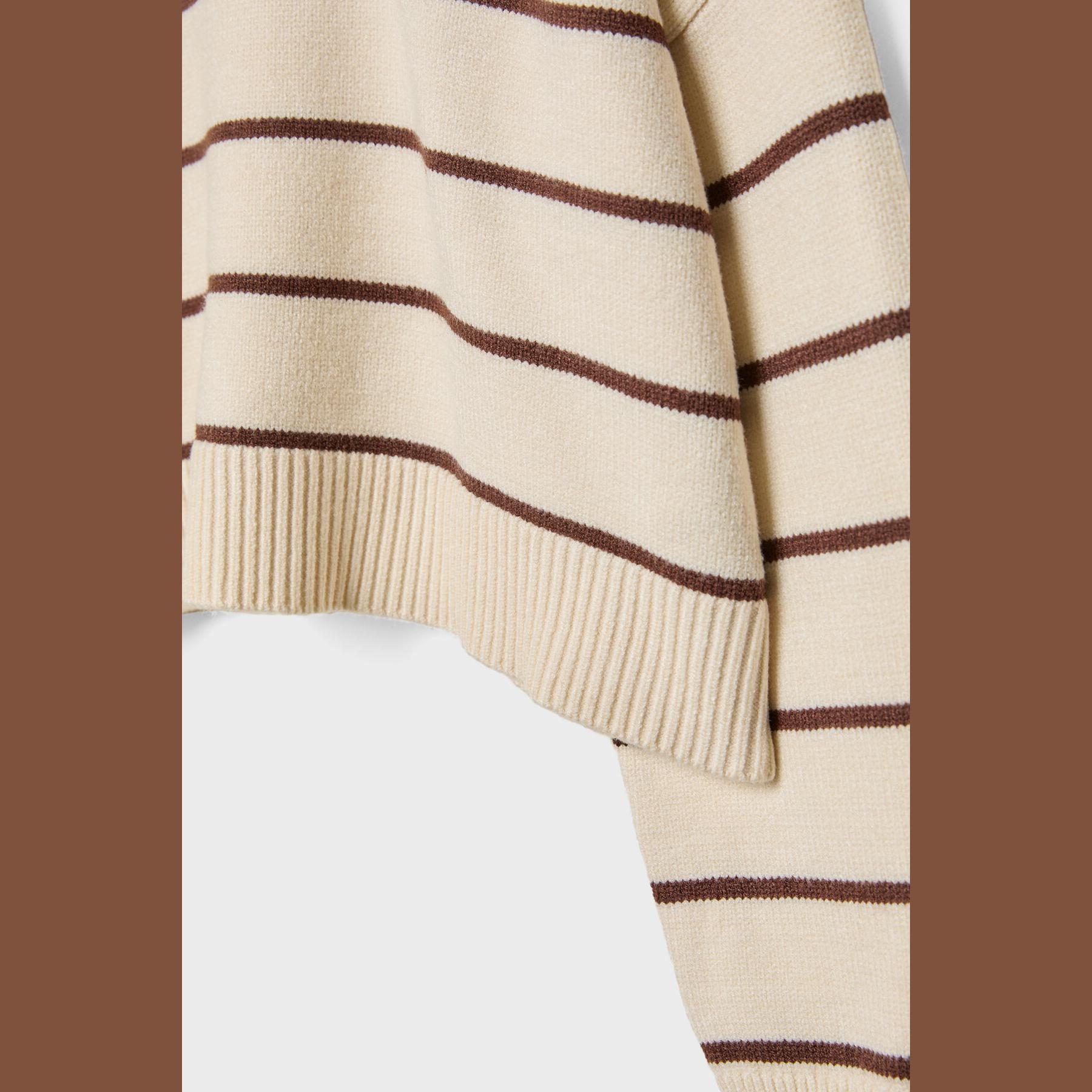 كنزة قصيرة أنيقة من Stradivarius بلون إكرو مع نقشة مخططة، مصنوعة من خامة تريكو ناعمة ومرنة، بتصميم Crop Fit وياقة مستديرة، مزودة بأكمام طويلة وأطراف مضلعة، تمنحك إطلالة شبابية وعصرية مثالية للاستخدام اليومي أو الكاجوال.